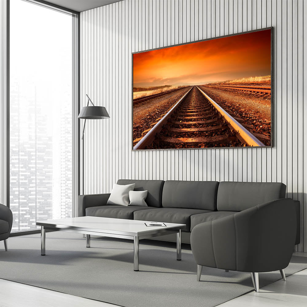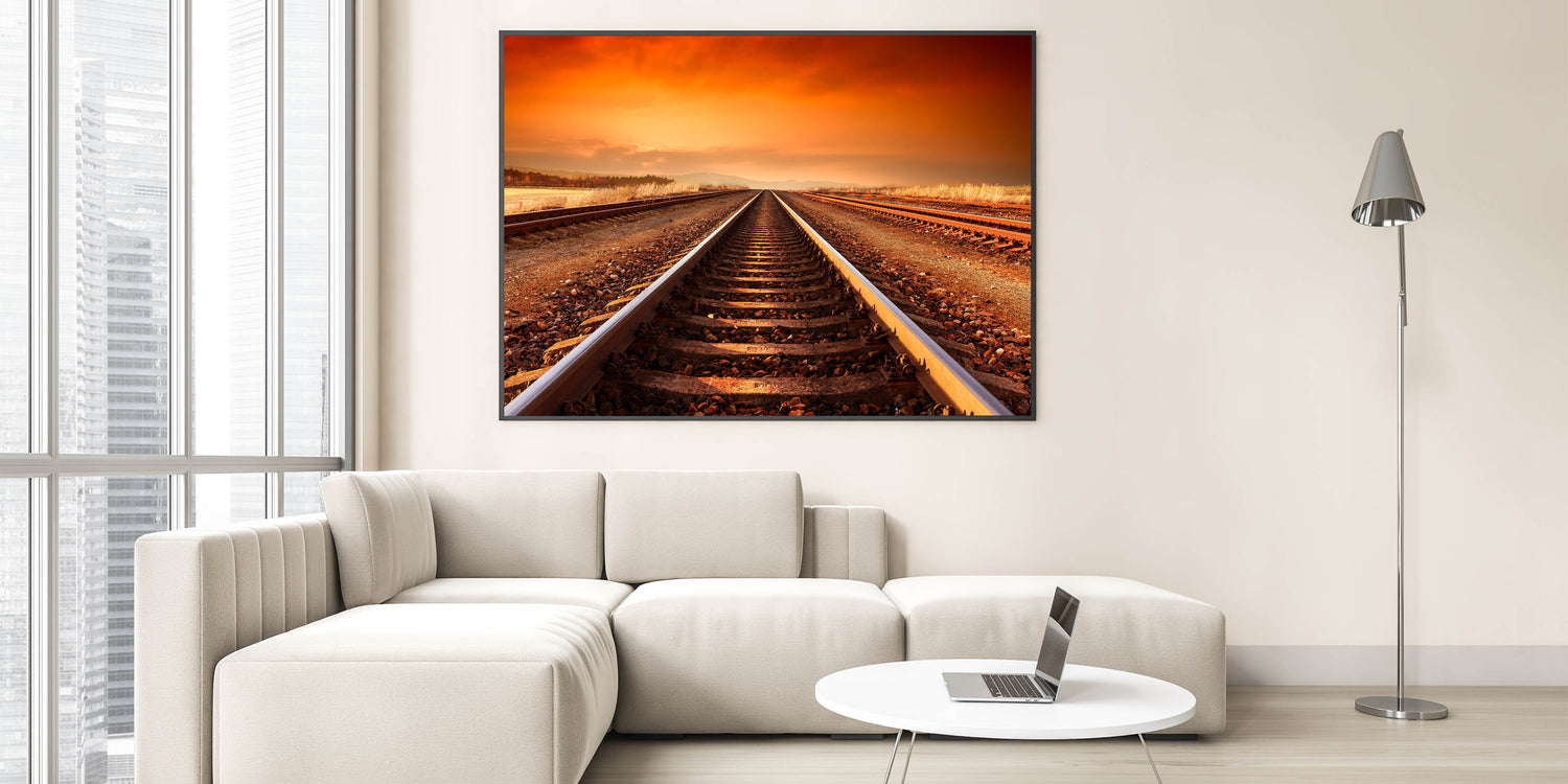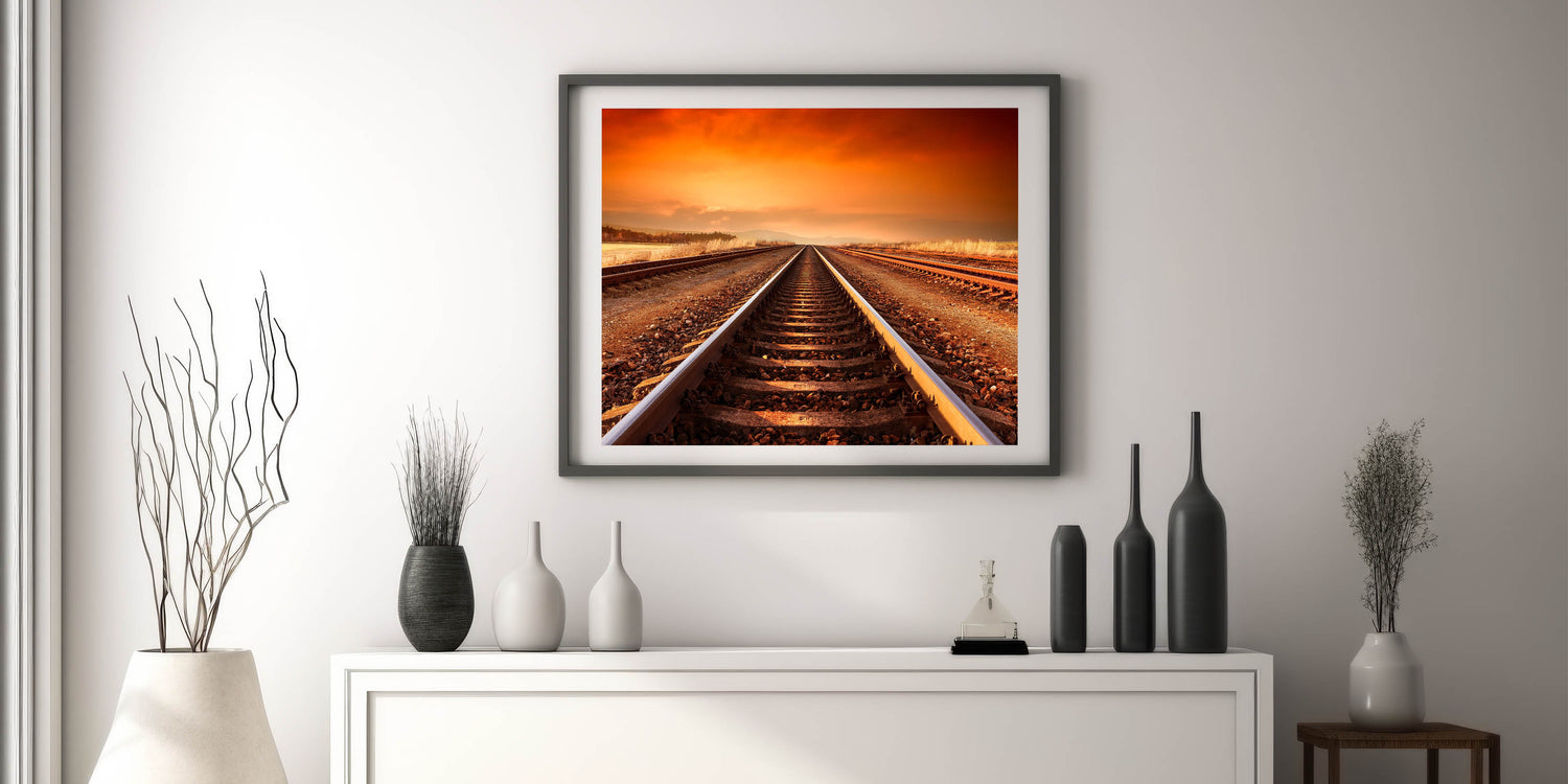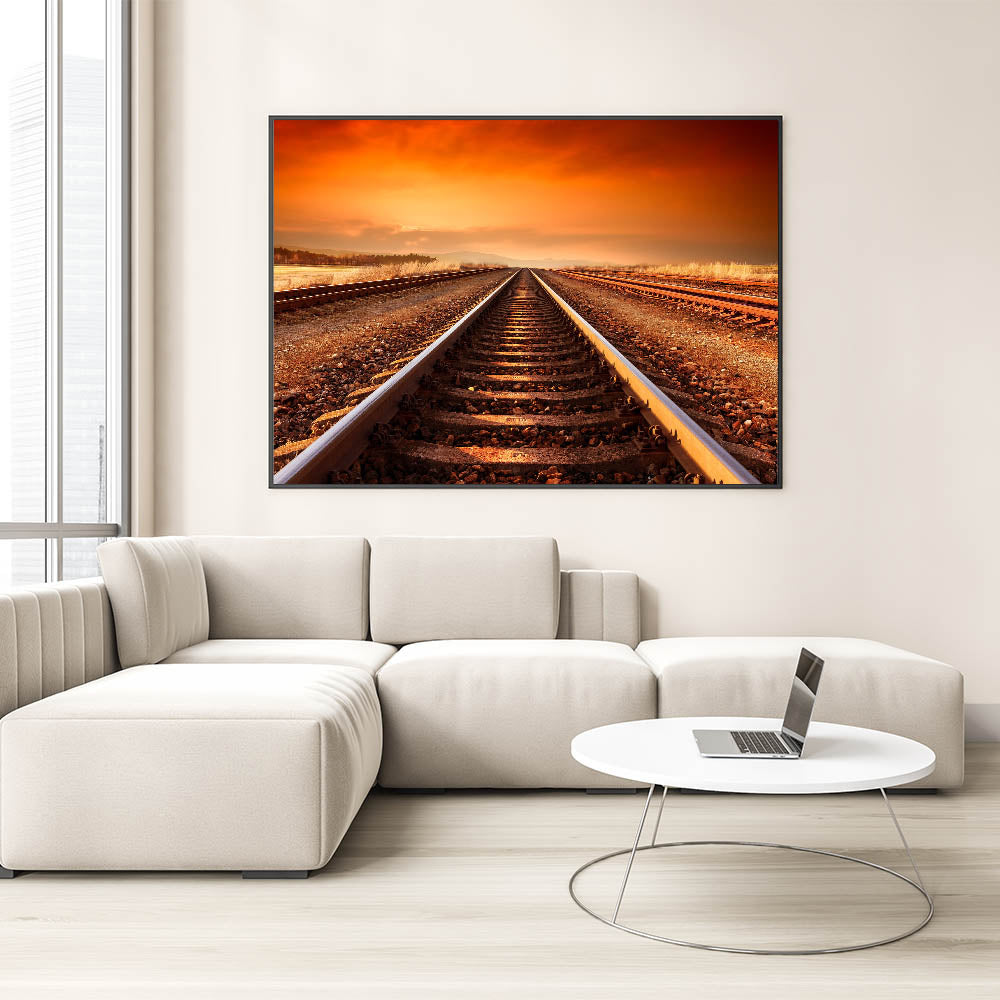 Immerse yourself in the serene beauty of train travel with this stunning railroad wall art, capturing the essence of a historic railway at sunset. The warm glow of the setting sun casts a golden hue over the tracks, evoking a sense of nostalgia and adventure.
