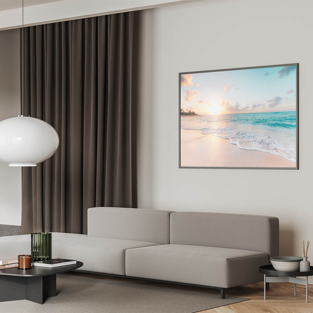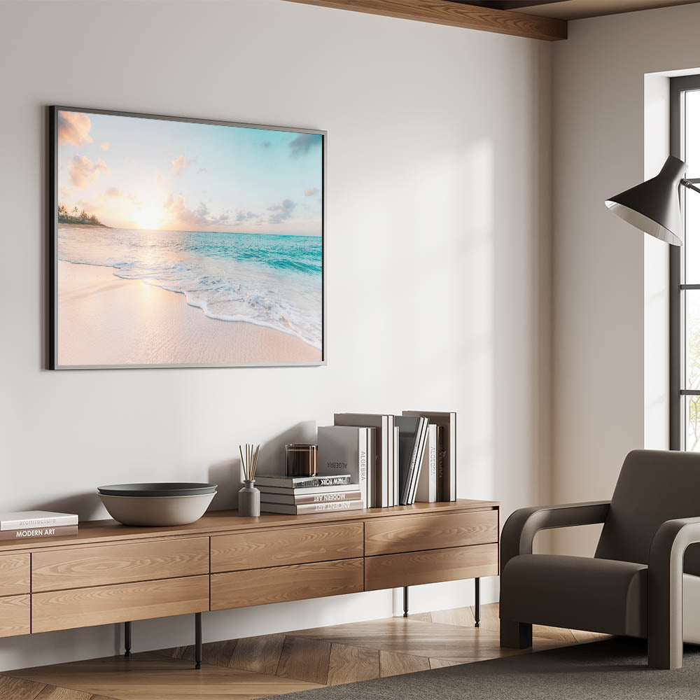 Capture the magic of a serene sunset with this stunning beach wall art. Featuring soft pastel tones of peach, blue, and gold, this artwork brings the soothing beauty of summer evenings to your home. With its tranquil ocean waves and vibrant sunset hues, it’s perfect for creating a relaxing and vacation-inspired atmosphere.