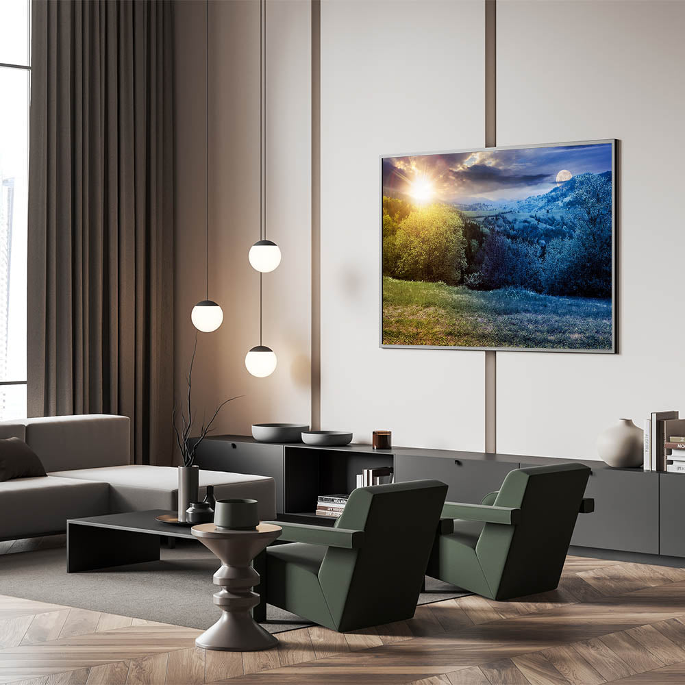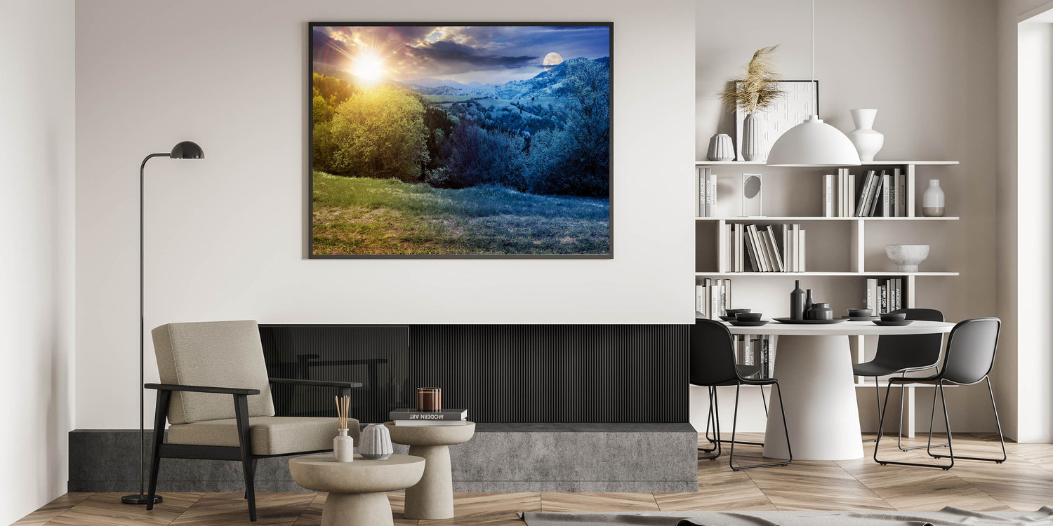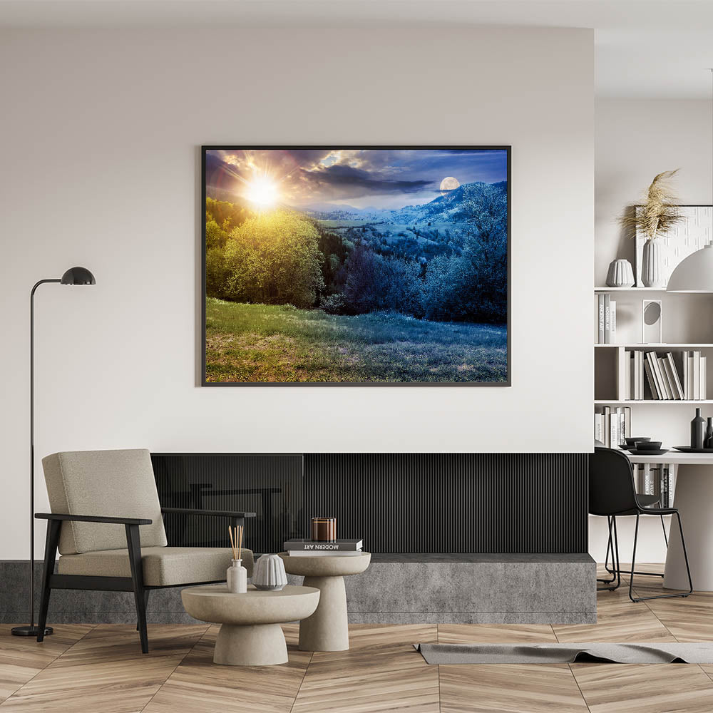- Striking contrast between the golden sunset and cool moonlit tones, adding depth to your decor.