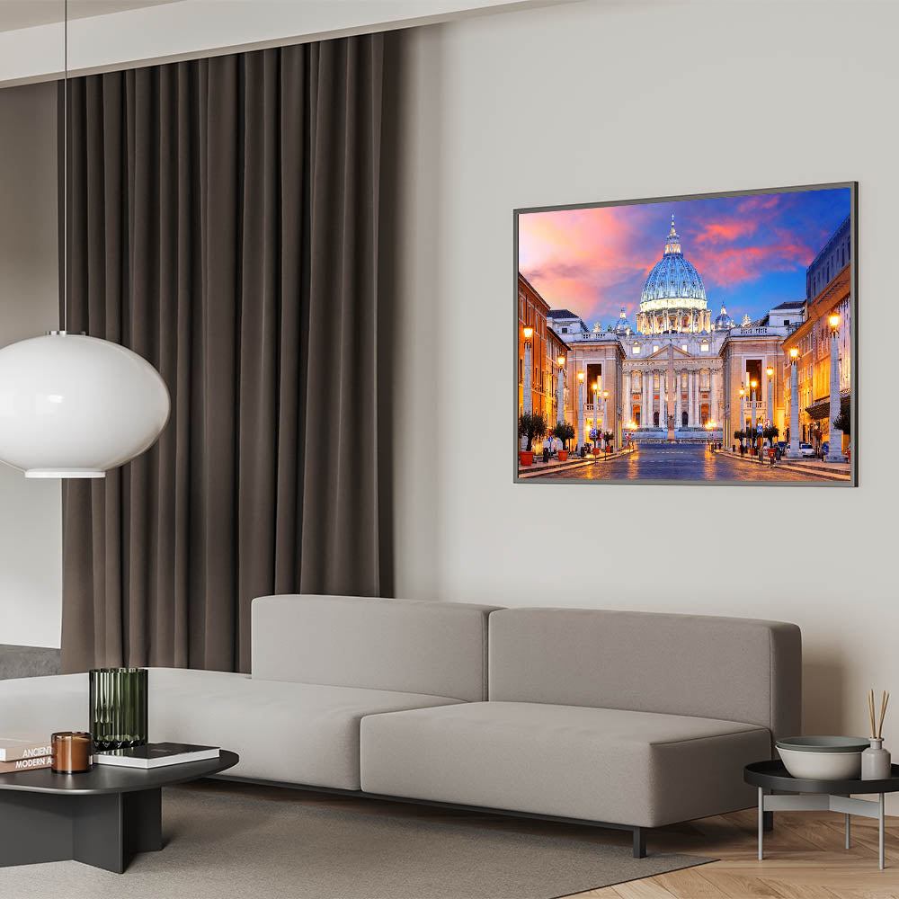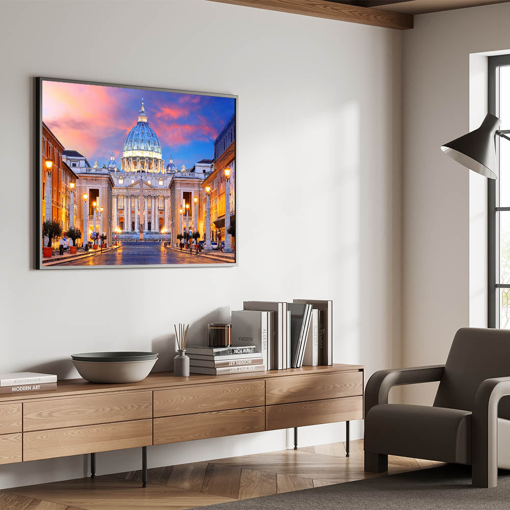 This Vatican art print captures the grandeur of St. Peter’s Basilica in vivid tones, offering a perfect blend of historical significance and modern design. Whether you're looking to add warmth to your space or enhance your decor with a piece of European scenery wall art, this high-quality print is an ideal choice.