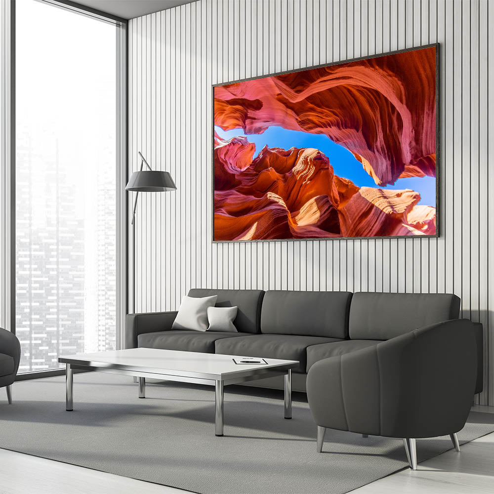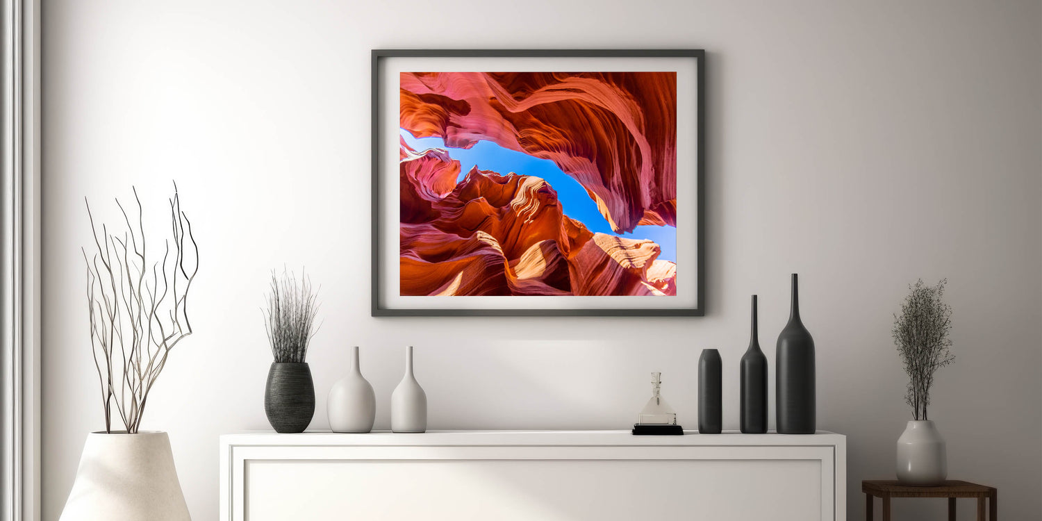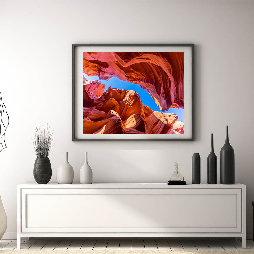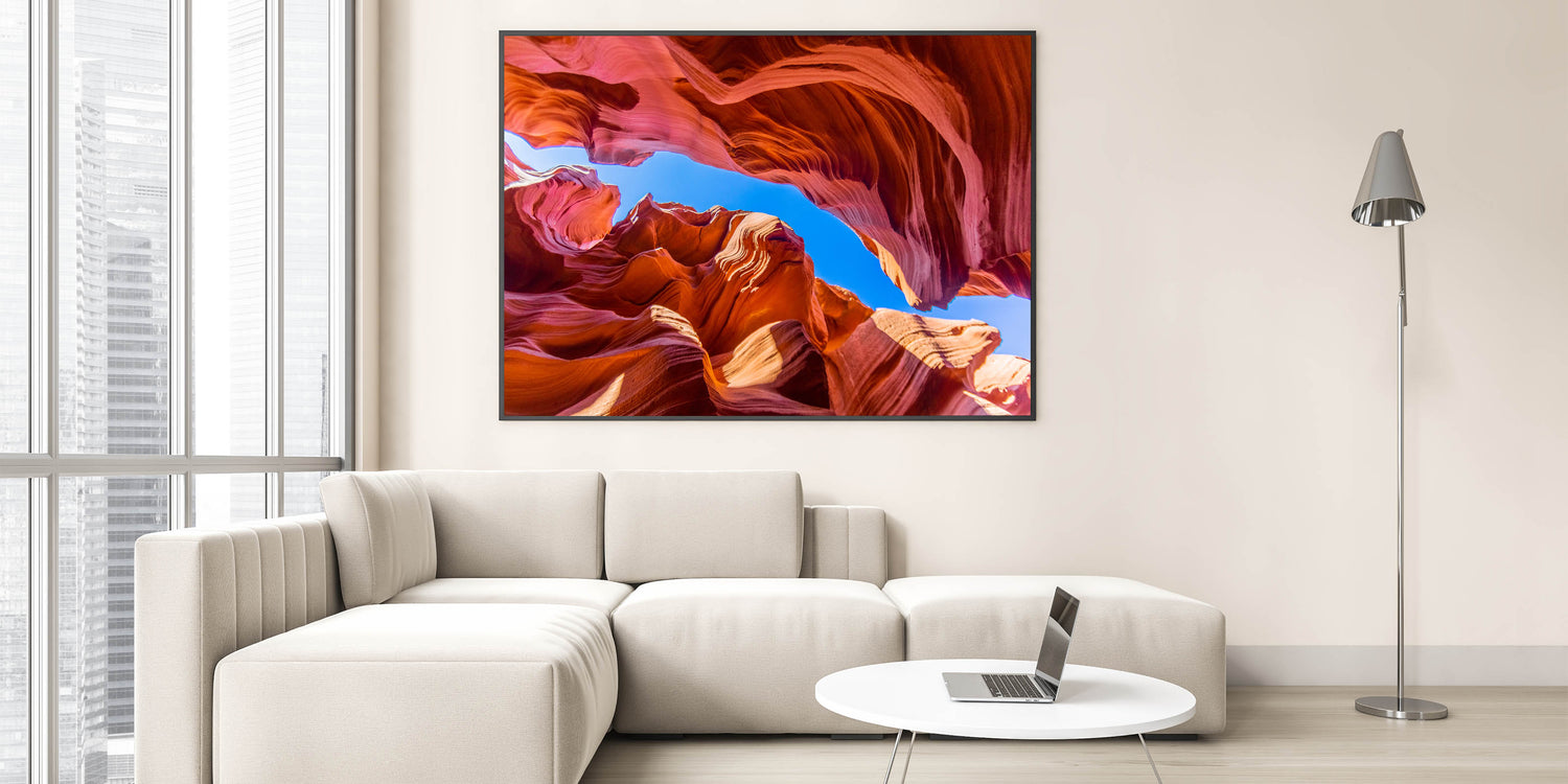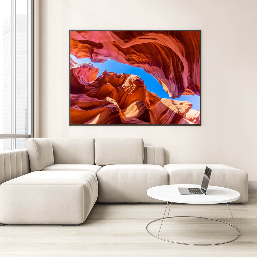 Add a burst of color and energy to your home with this vibrant canyon wall art. The dynamic patterns and swirling formations of the canyon walls are brought to life with rich shades of red, orange, and pink, contrasted beautifully by the deep blue sky above. This high-quality canvas print captures the awe-inspiring beauty of nature's artistry, making it a perfect statement piece for any room.