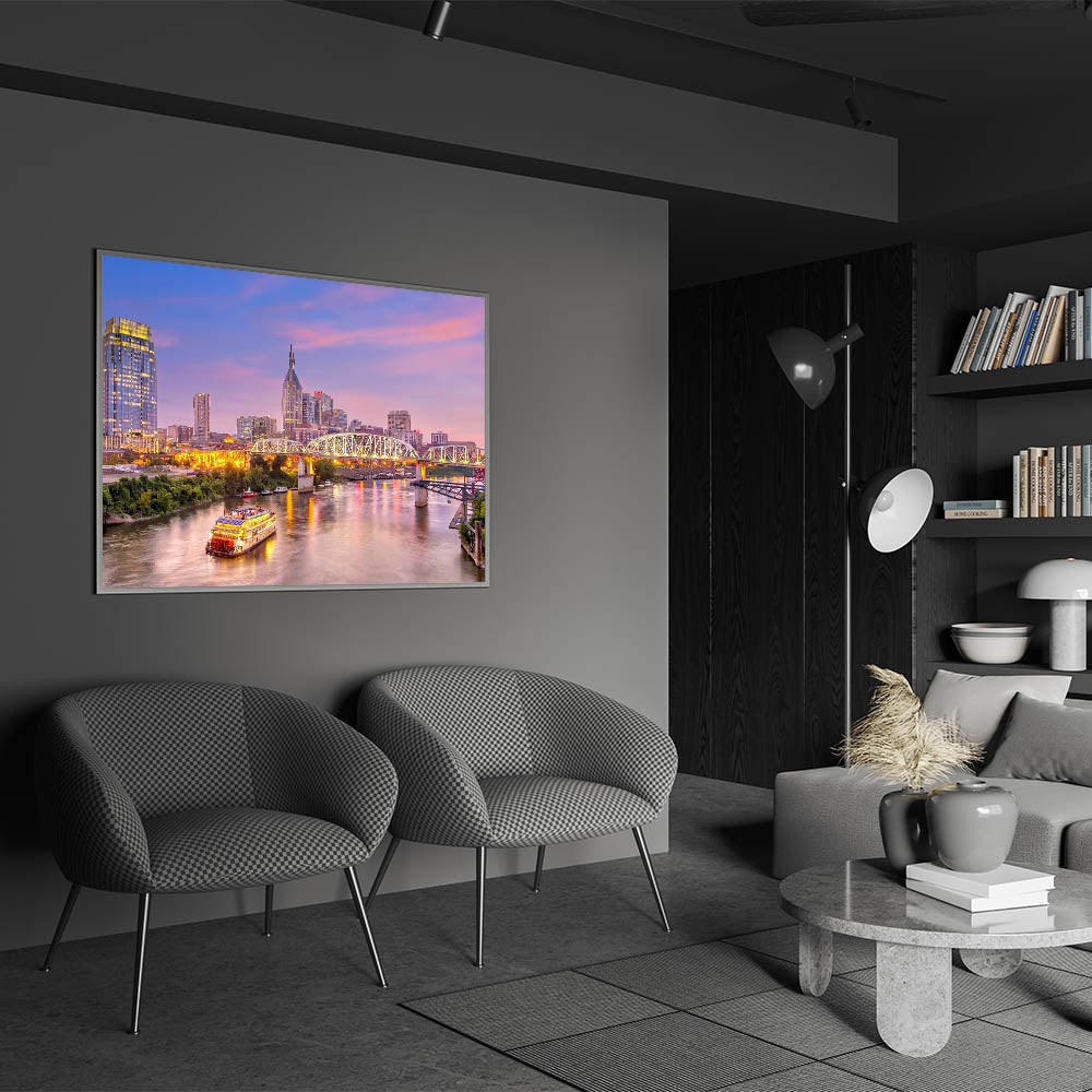 • Vivid Colors: The artwork highlights the brilliant lights of Nashville's skyline, contrasted beautifully with the evening sky.