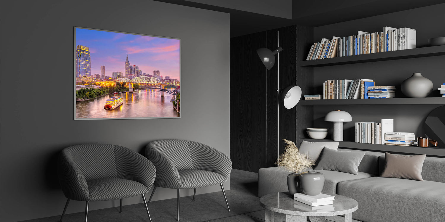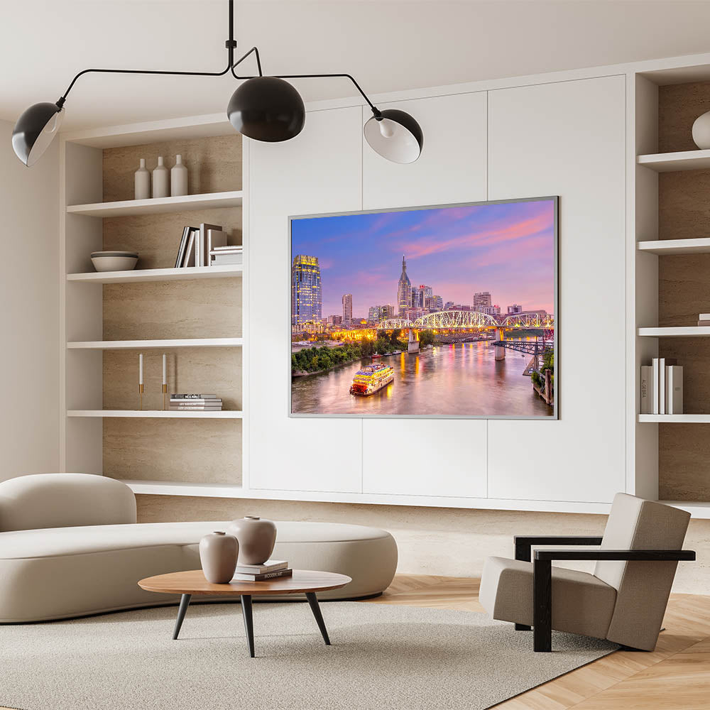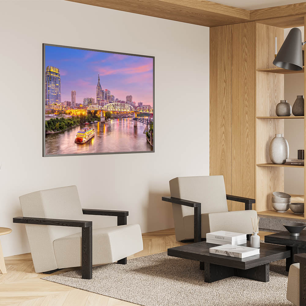 Capture the lively spirit of Nashville with this vibrant cityscape wall art. Featuring a breathtaking view of the Nashville skyline at dusk, this artwork brings the city's dynamic energy and iconic architecture into your home or office.
