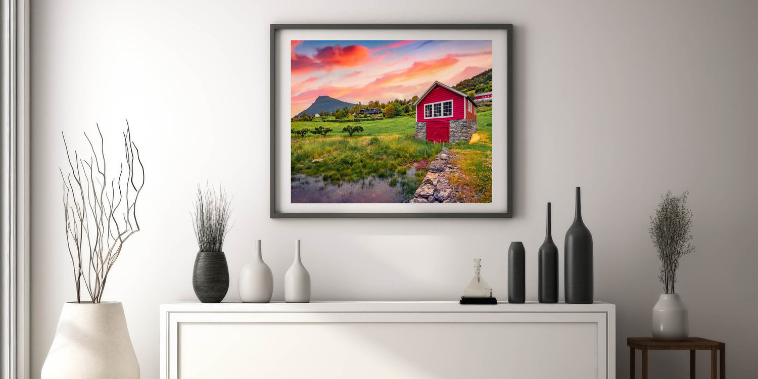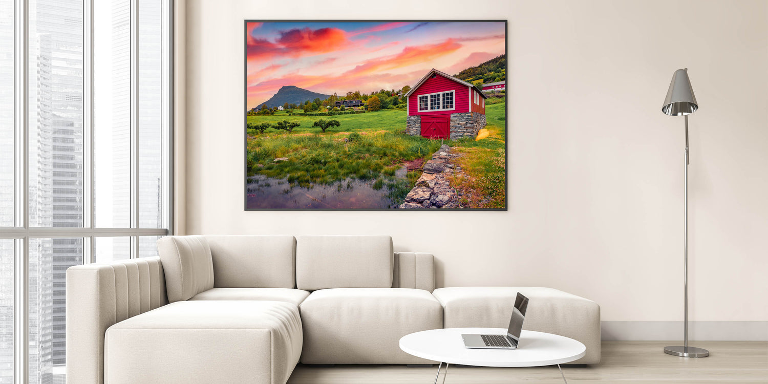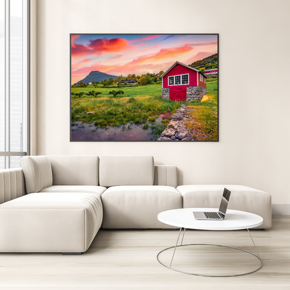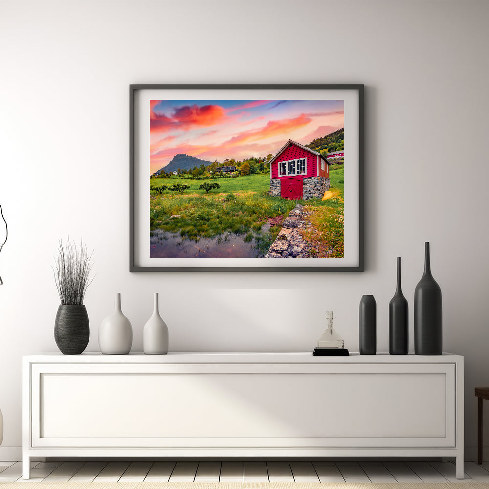 Brighten up your living space with this stunning piece of house wall art, featuring a vibrant red house set against a picturesque landscape. The vivid colors of the sunset sky contrast beautifully with the lush green fields, creating a captivating scene that perfectly embodies the charm of architectural house art. This artwork is ideal for anyone looking to add a bold, contemporary touch to their home decor.