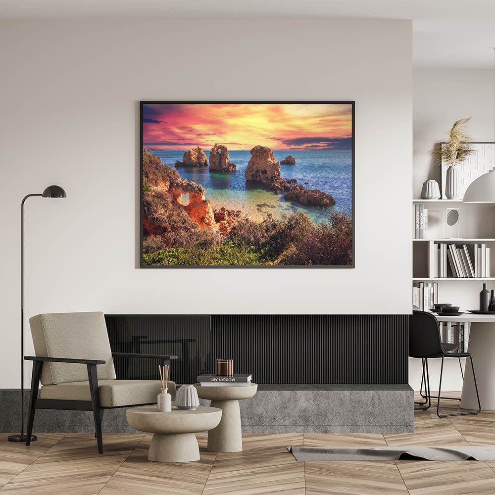 Vibrant Sunset Coastal Art - Rocky Cliff Seascape Canvas Print