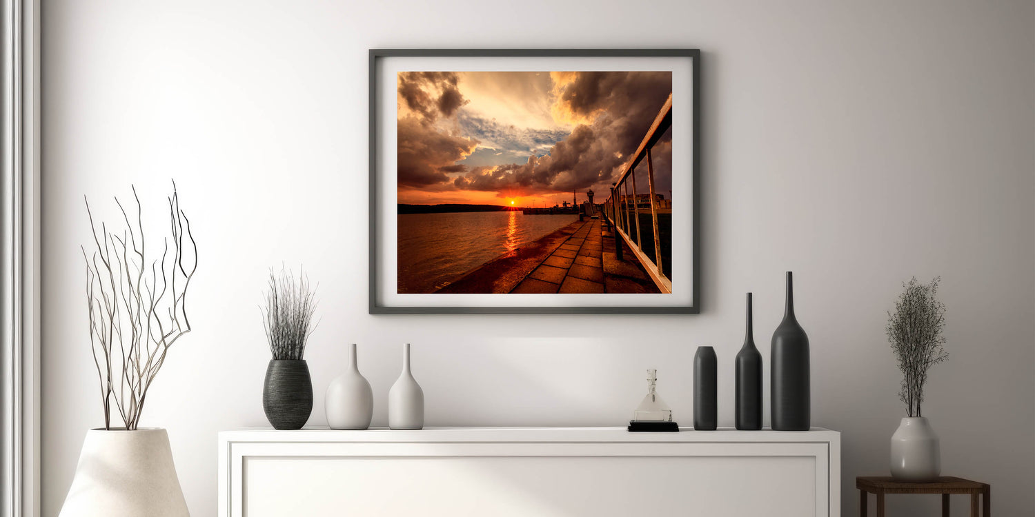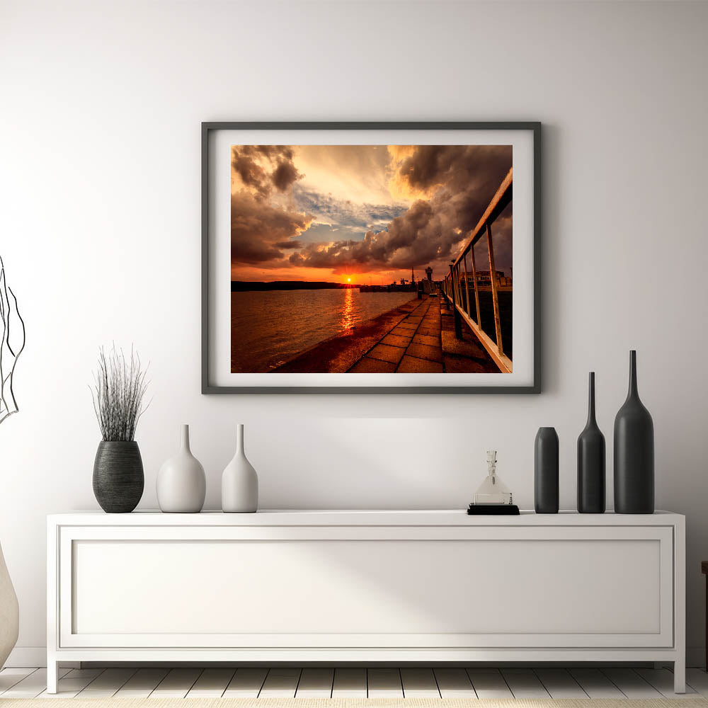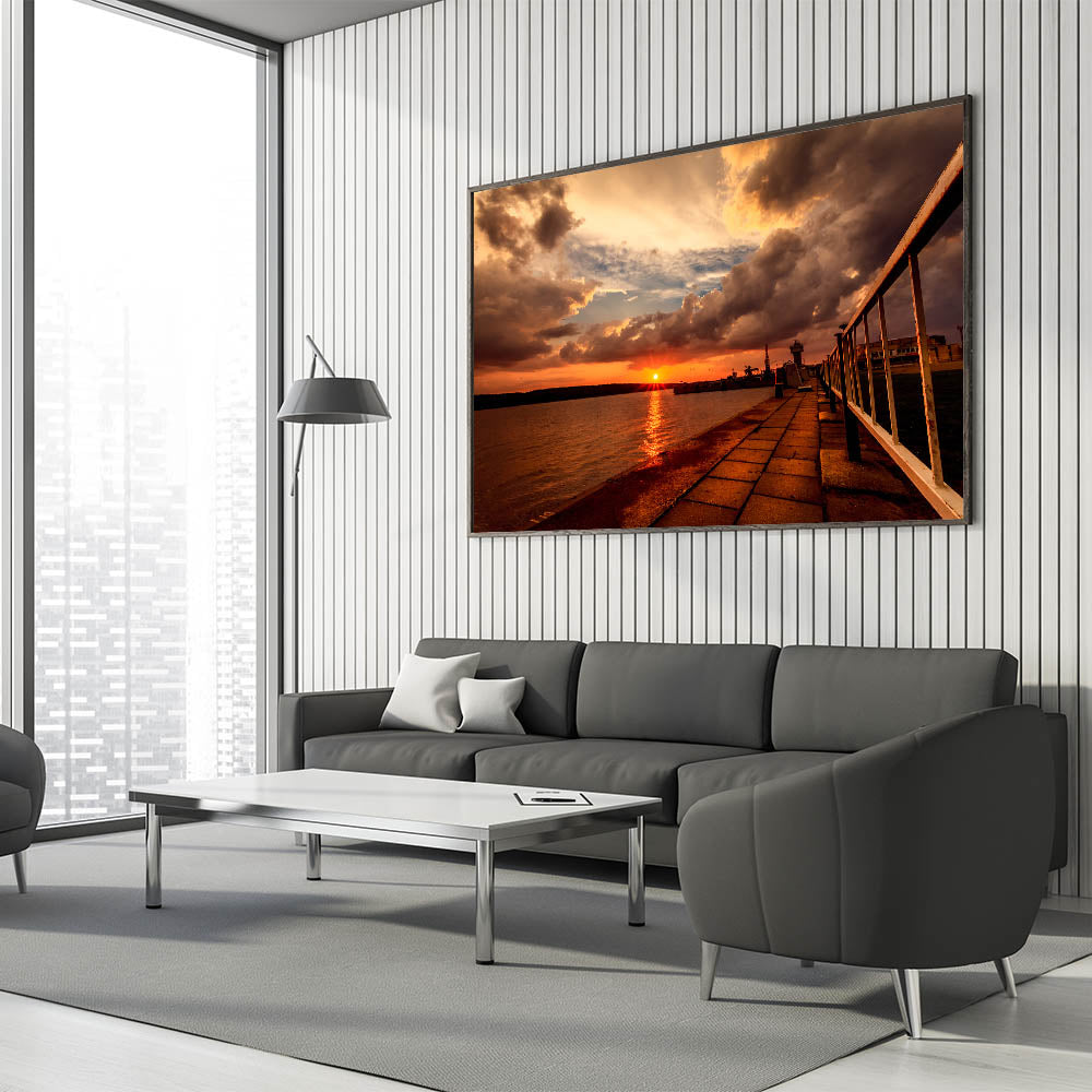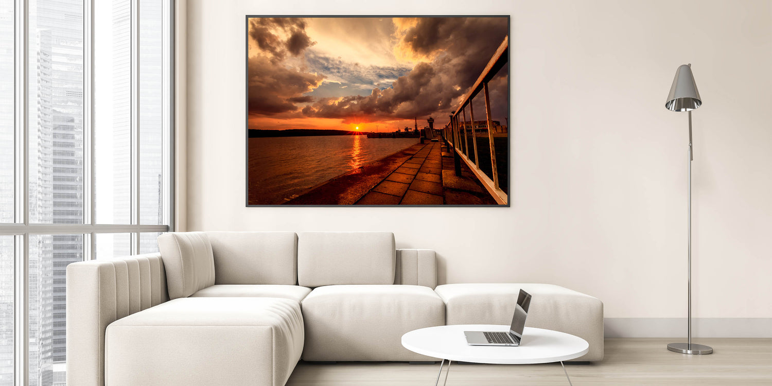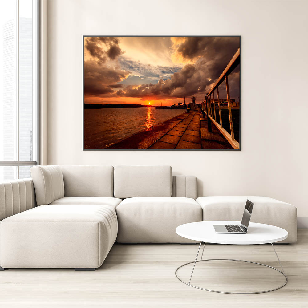 Capture the industrial charm of Lithuania's harbor at sunset with this captivating wall art. The dramatic sky, filled with vibrant oranges and deep blues, frames the sun as it sets behind the horizon. The harbor infrastructure in the distance adds a unique cityscape element to this breathtaking view, making it the perfect blend of nature and modern architecture.