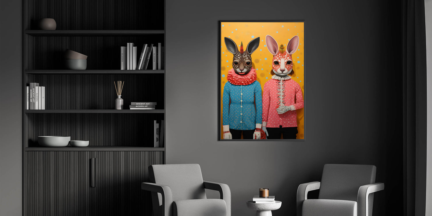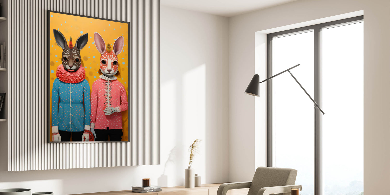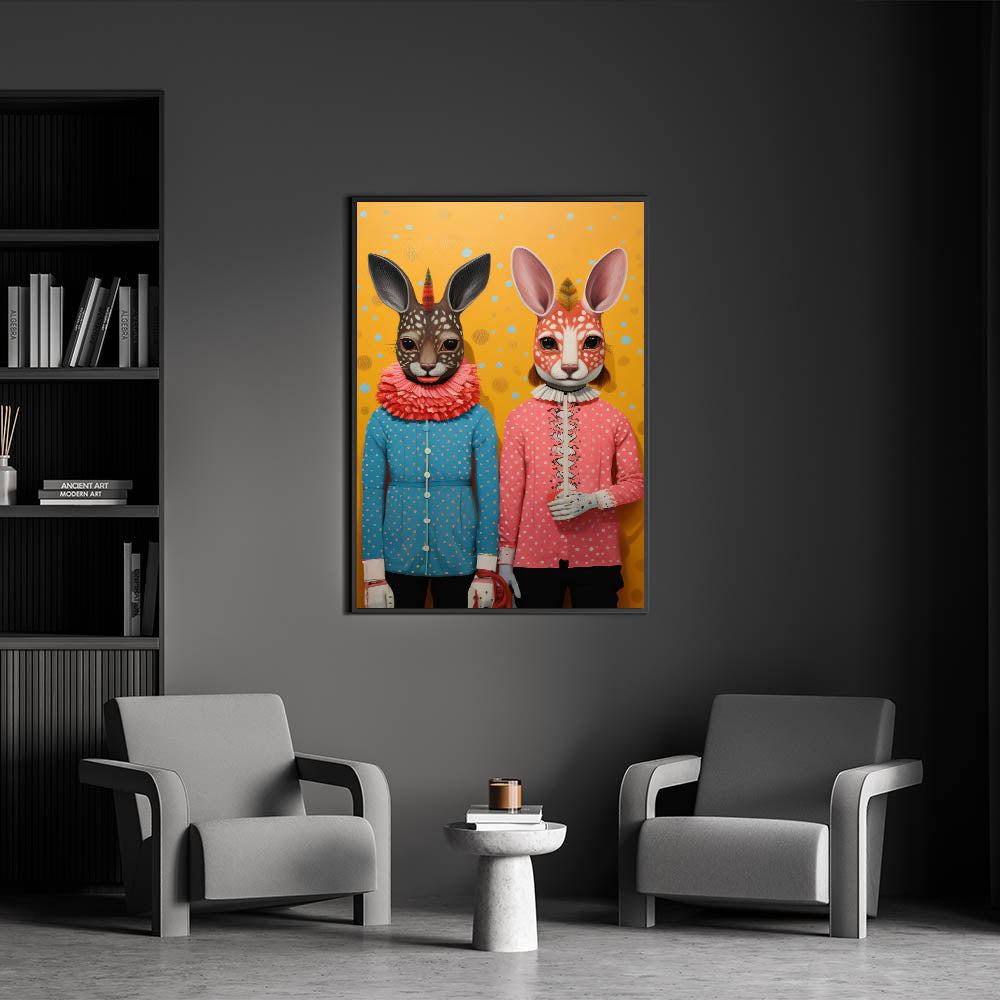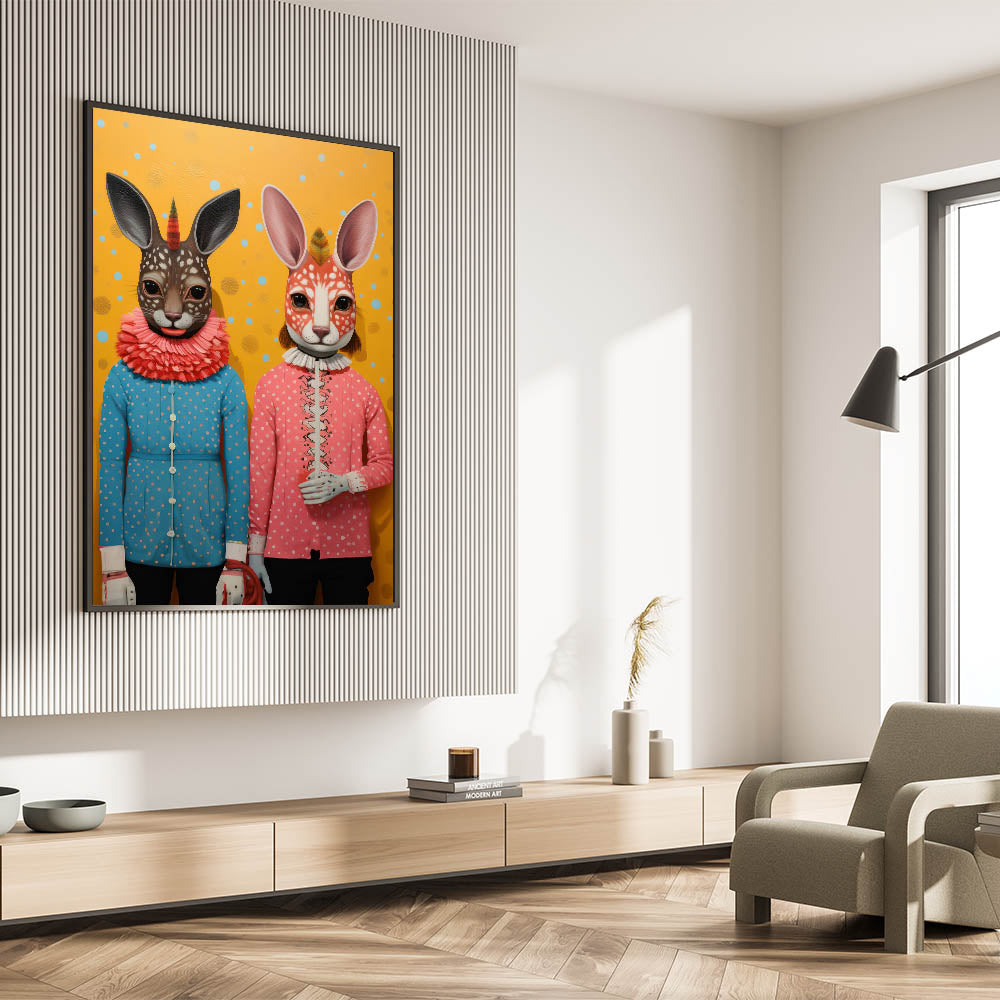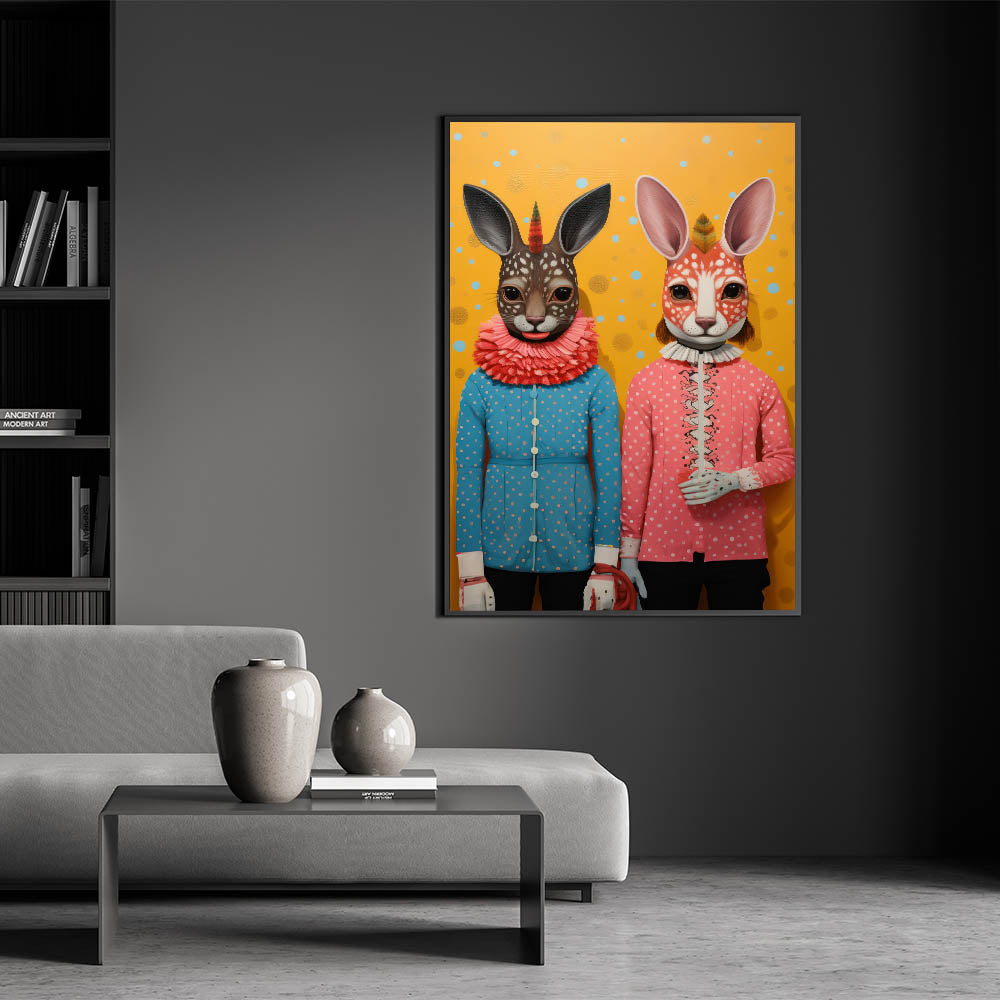 Add a burst of joy to your space with this whimsical electric wall art, featuring a vibrant duo of rabbits dressed in playful attire. The bright yellow background contrasts beautifully with the bold colors of their outfits, creating a fun and eye-catching piece. The detailed textures and expressive eyes of the rabbits bring a sense of character and charm, making this artwork perfect for children's rooms, creative spaces, or anyone looking to add a touch of whimsy to their decor.