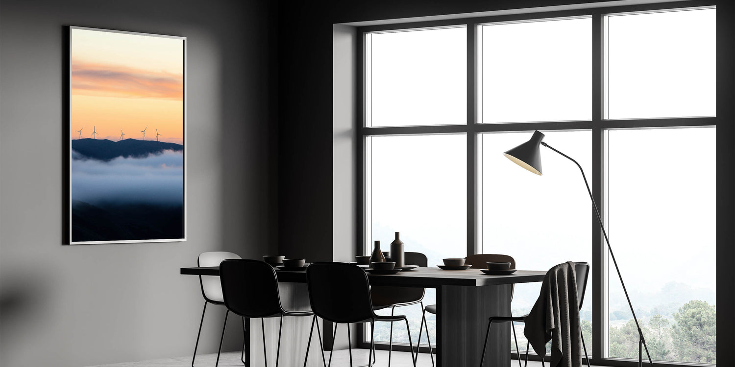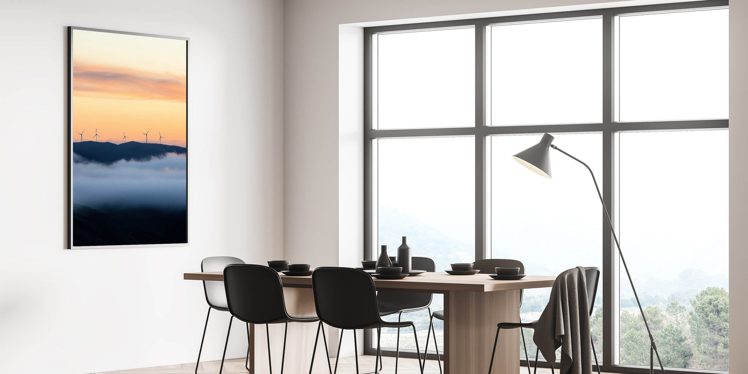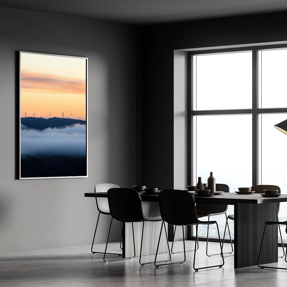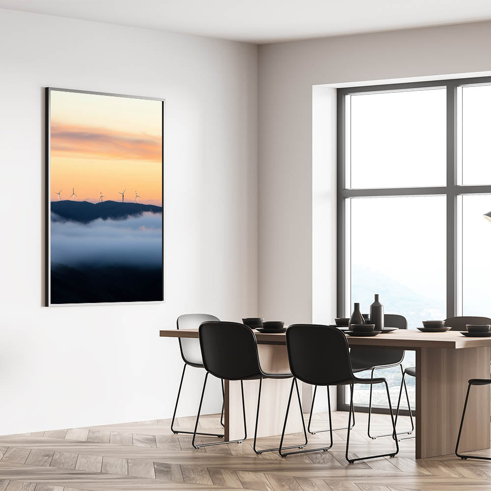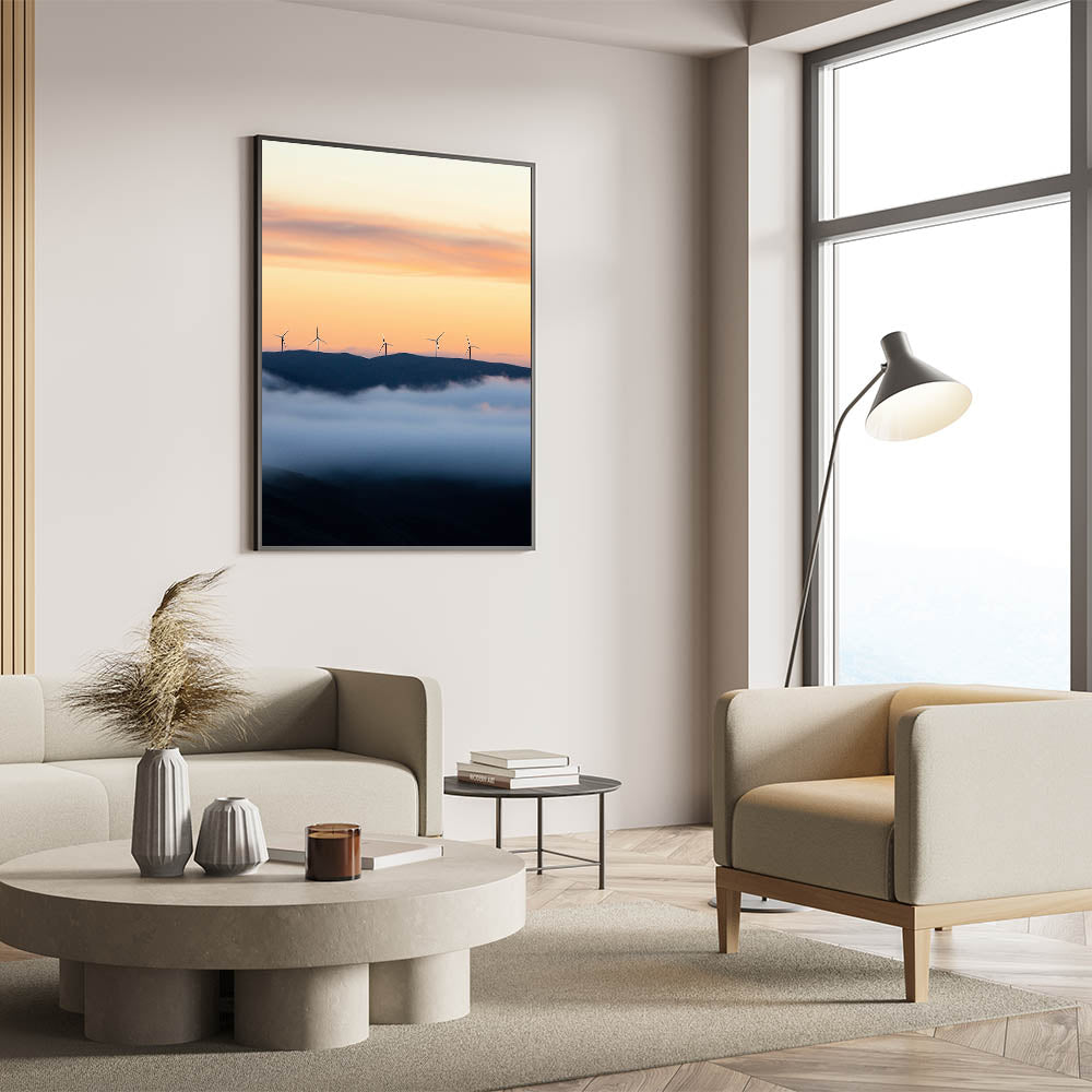 Celebrate the harmony of nature and technology with this breathtaking countryside wall art. Featuring wind turbines silhouetted against a pastel sunrise, surrounded by rolling hills and low-lying clouds, this artwork is a modern yet tranquil depiction of rural landscapes. It’s a perfect choice for eco-conscious homeowners seeking countryside-inspired decor that reflects sustainability and serenity.
