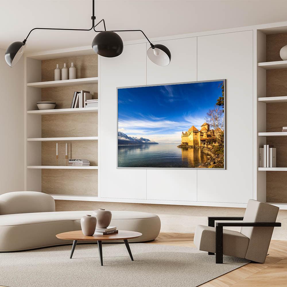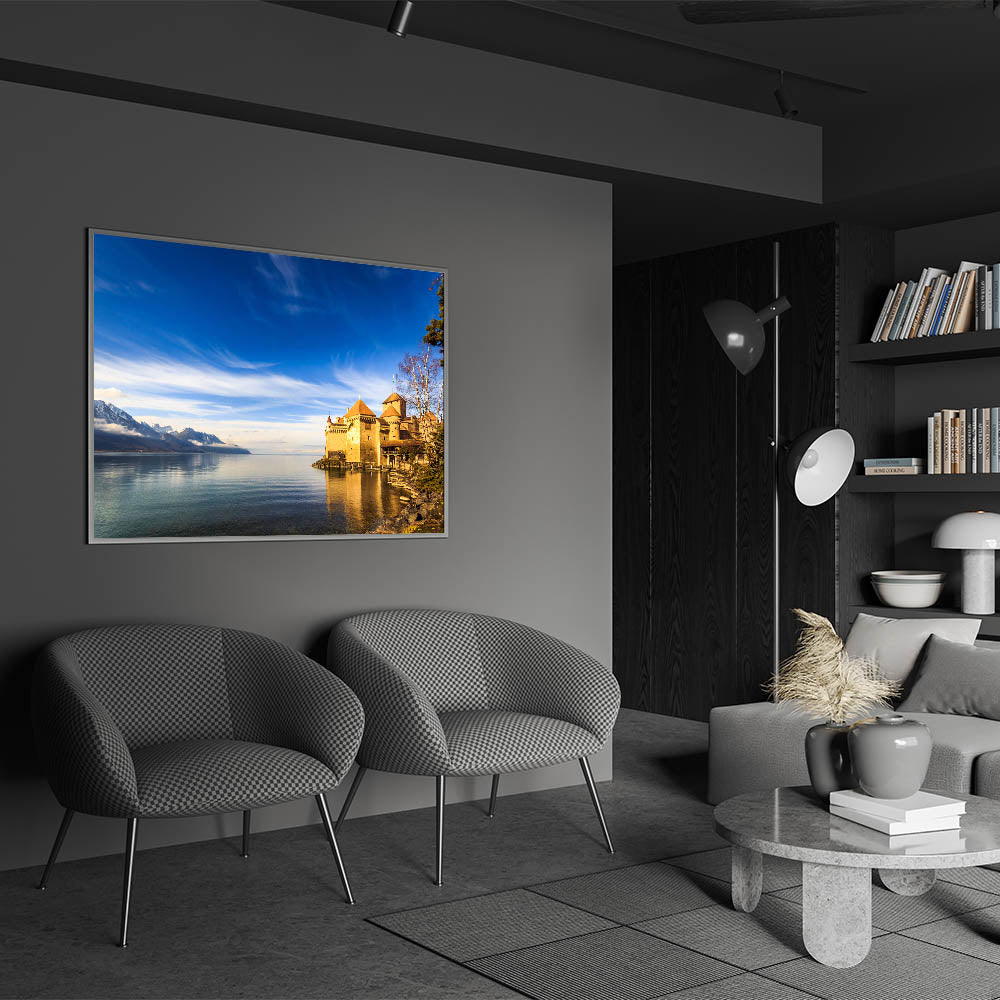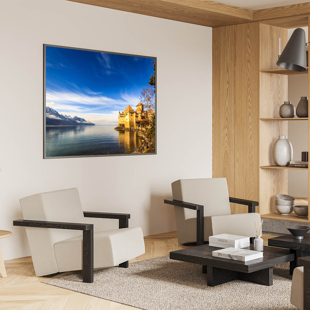 • Beautiful Geneva Wall Decor: A stunning view of the Château de Chillon castle against the backdrop of Lake Geneva.