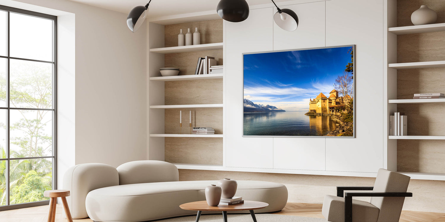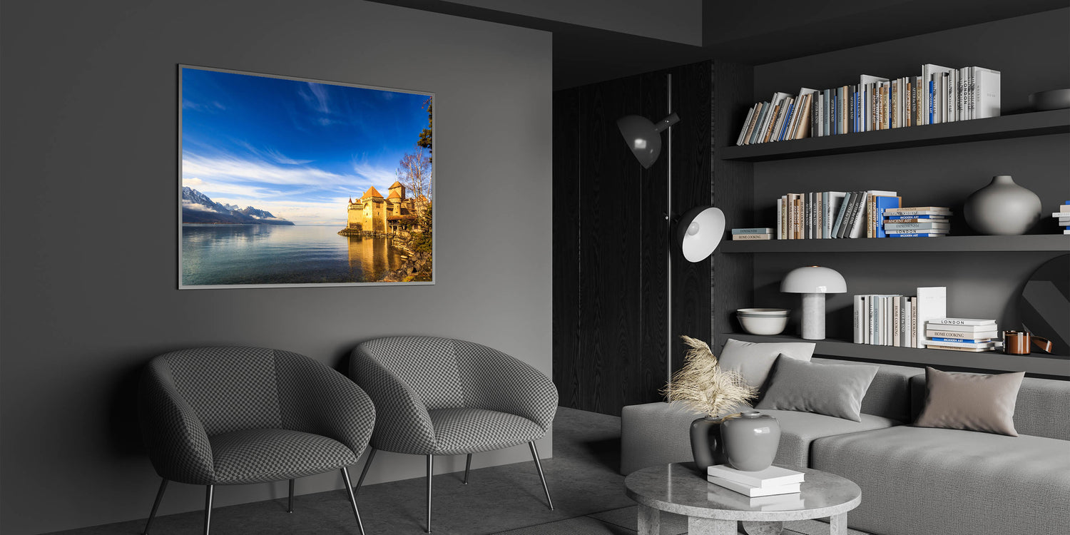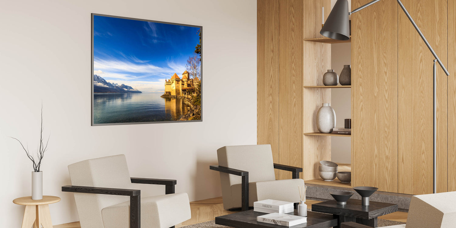 • Beautiful Geneva Wall Decor: A stunning view of the Château de Chillon castle against the backdrop of Lake Geneva.