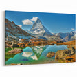Capture the stunning beauty of the Swiss Alps with this breathtaking wall art of the Matterhorn. The iconic mountain is reflected perfectly in a clear, emerald-green lake, surrounded by rocky terrain and snowy peaks. The vibrant autumnal hues and crystal-clear water make this a truly captivating scene, ideal for nature lovers and those who appreciate the majestic landscapes of Switzerland.