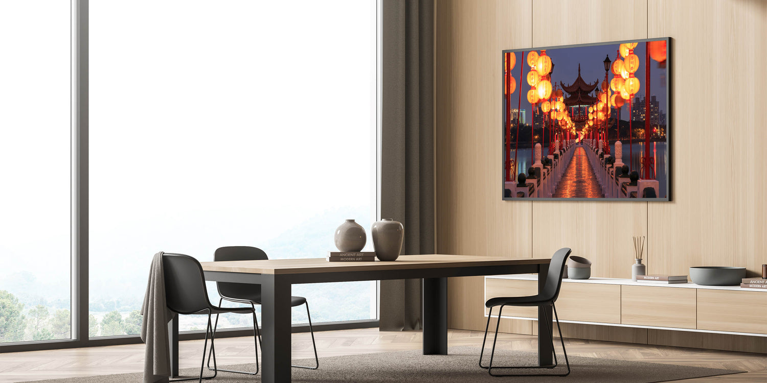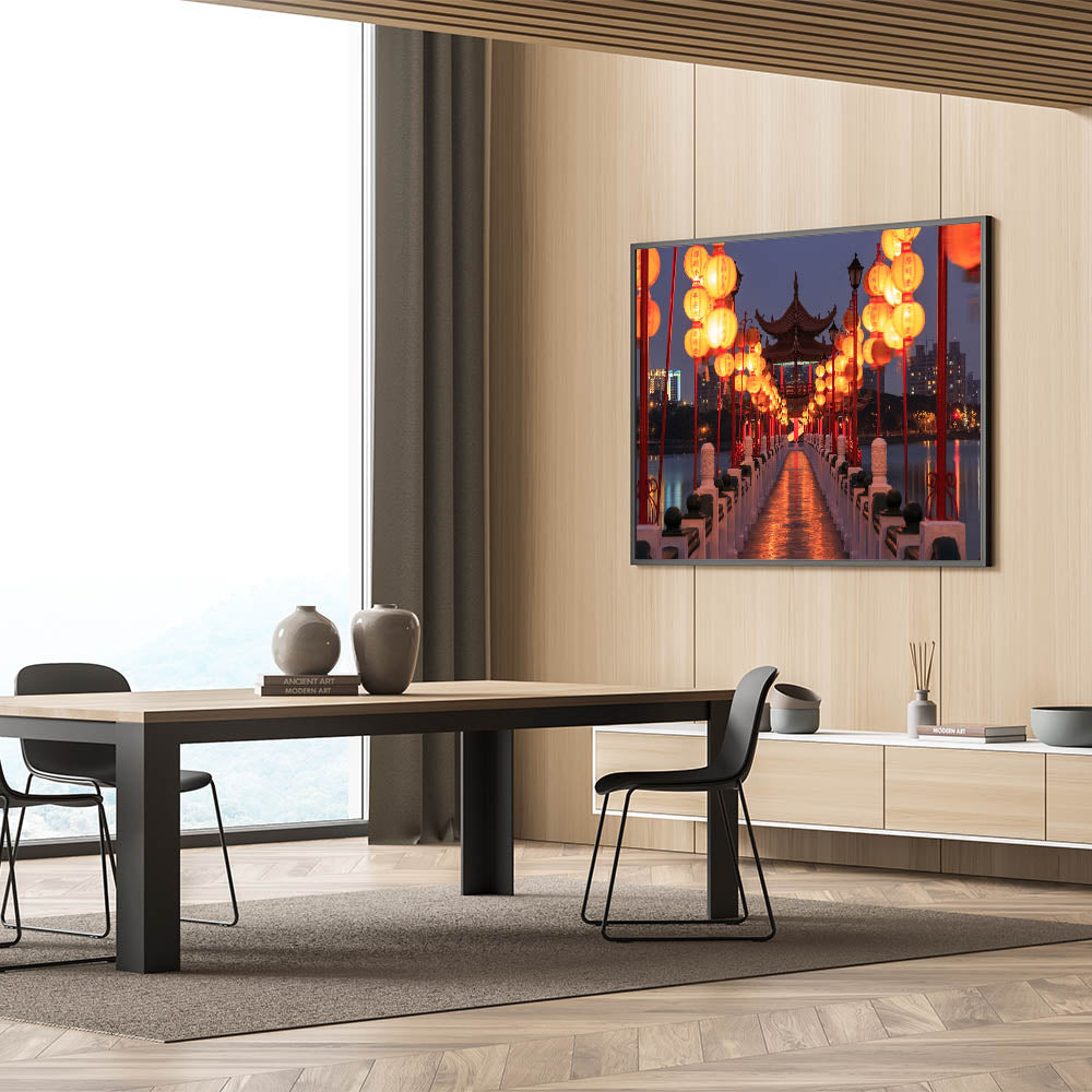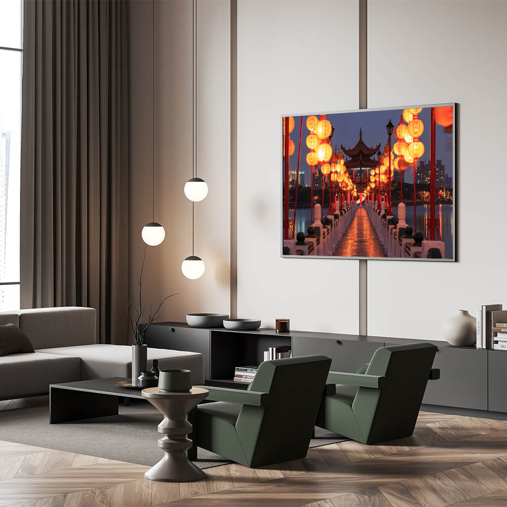 Immerse yourself in the beauty of Taiwan’s cultural heritage with this stunning wall art featuring the glowing lanterns of a Taiwanese bridge during the night. The vibrant red lanterns, delicately lining the pathway, highlight the Taiwanese landscapes and beautiful Taiwan scenery that evoke a sense of peace and tradition. This piece is perfect for anyone who appreciates Asia region wall art and wants to add a touch of Taiwan's iconic landmarks to their space.