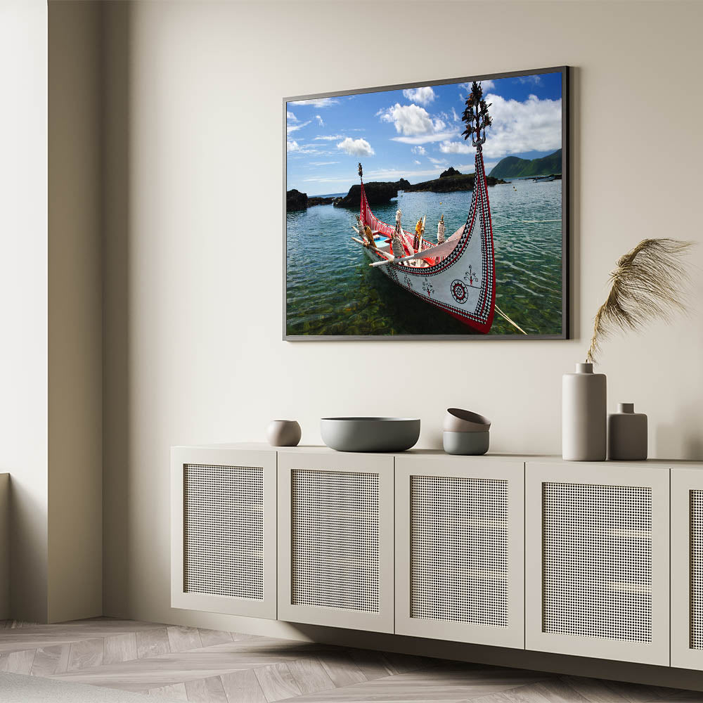 - High-resolution print capturing every detail of the traditional boat and scenic coast.