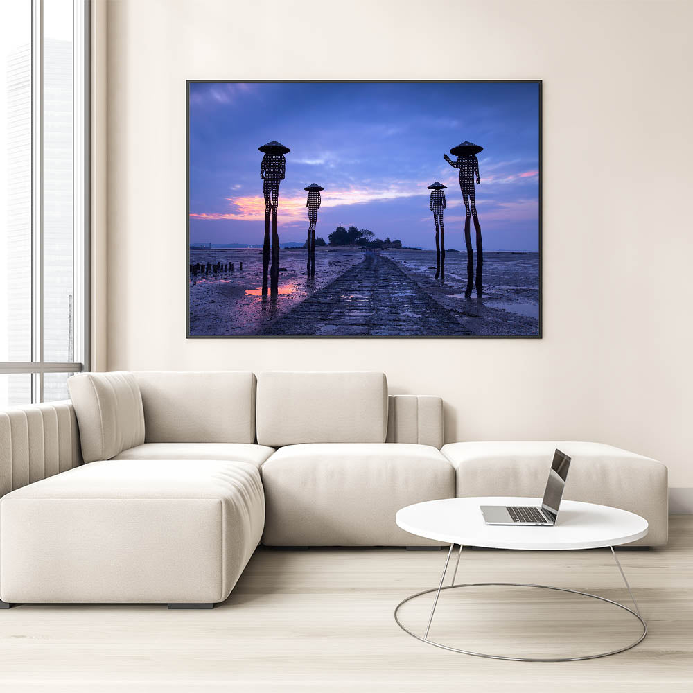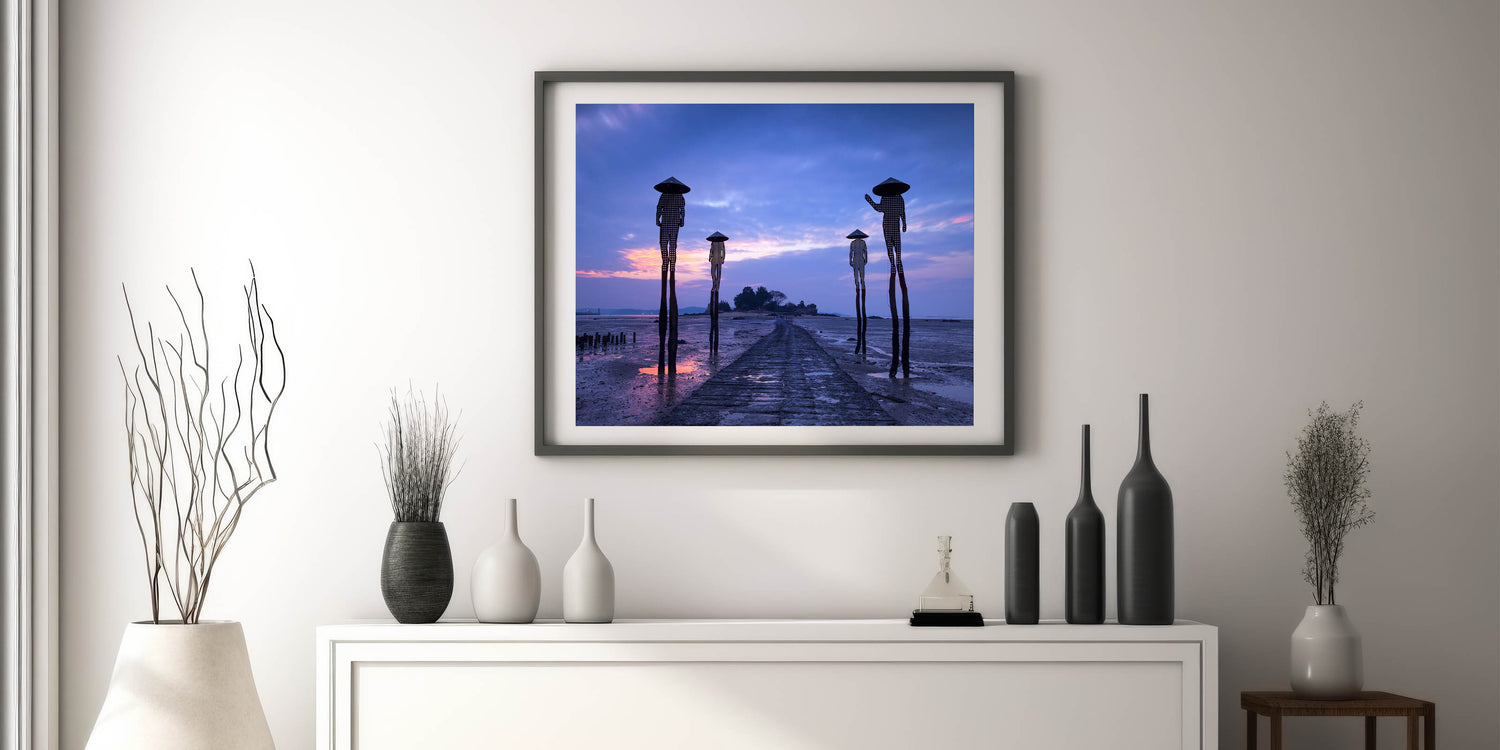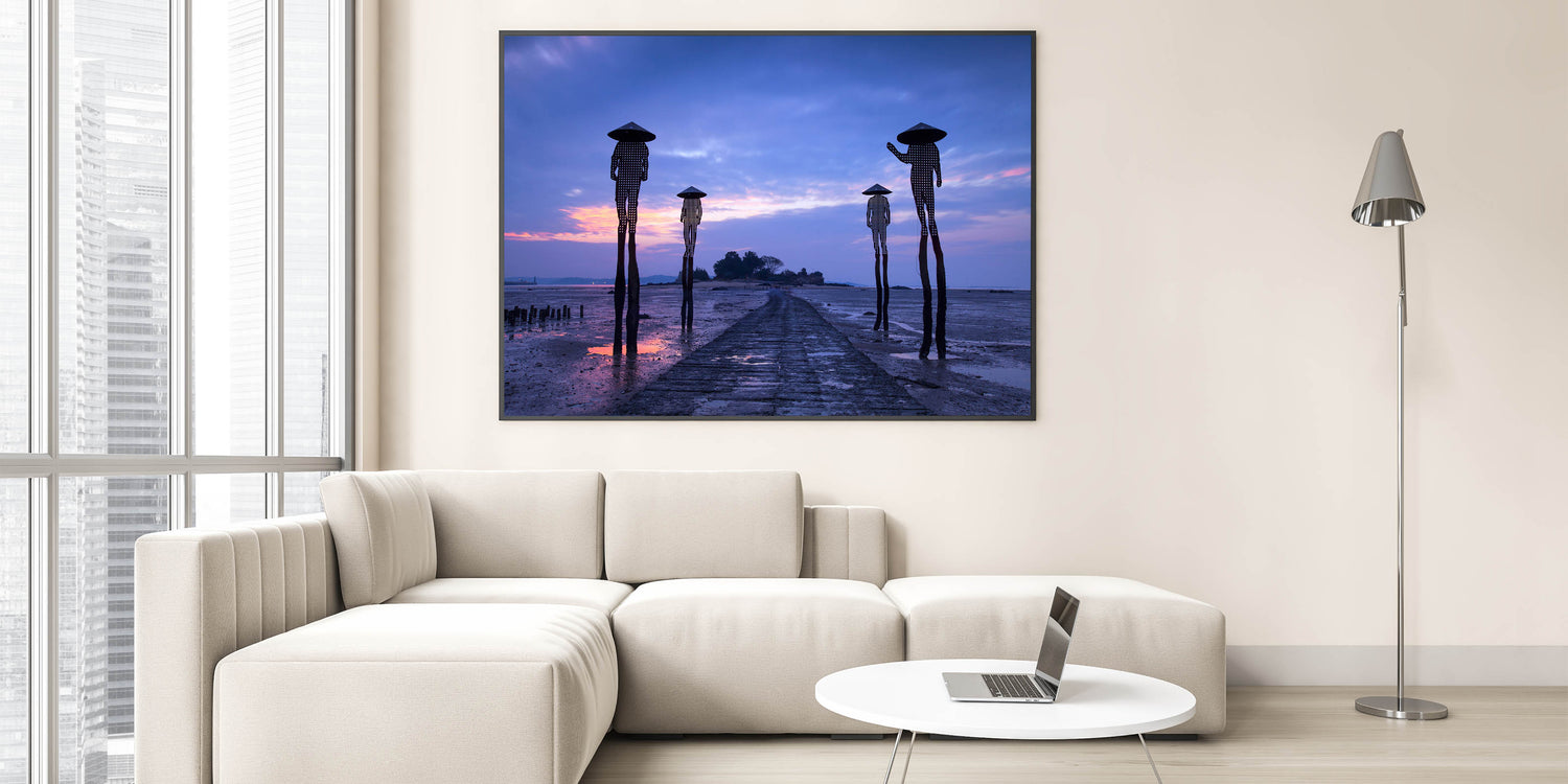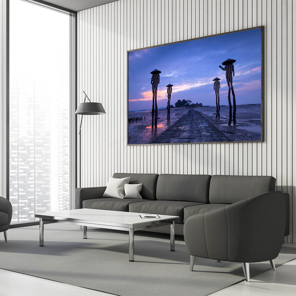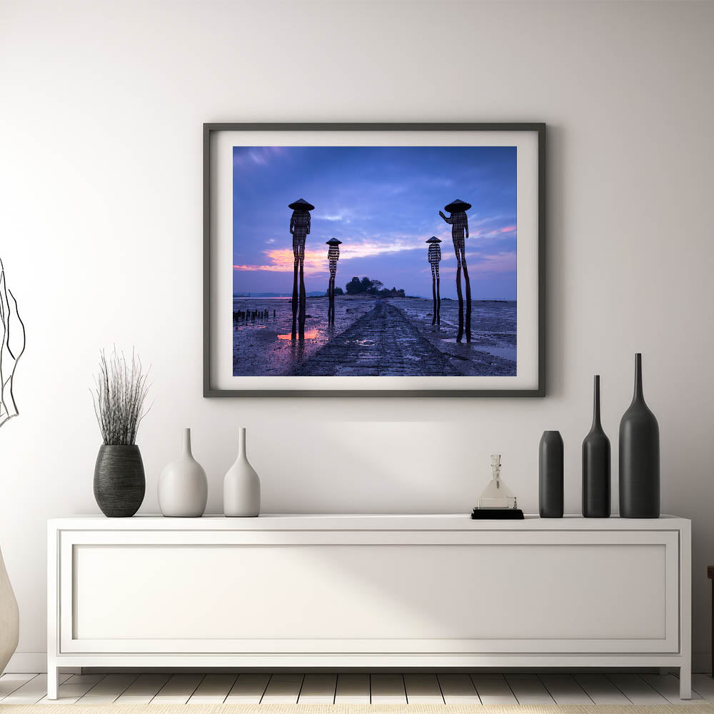 Capture the mystique of Taiwan’s coastline with this stunning wall art featuring towering metal silhouettes at twilight. The unique figures, set against a glowing sky, create a captivating scene that highlights Taiwanese landscapes and the beauty of nature scenes from Taiwan. This piece is ideal for those who appreciate Asia region wall art and want to bring a sense of mystery and wonder into their space.