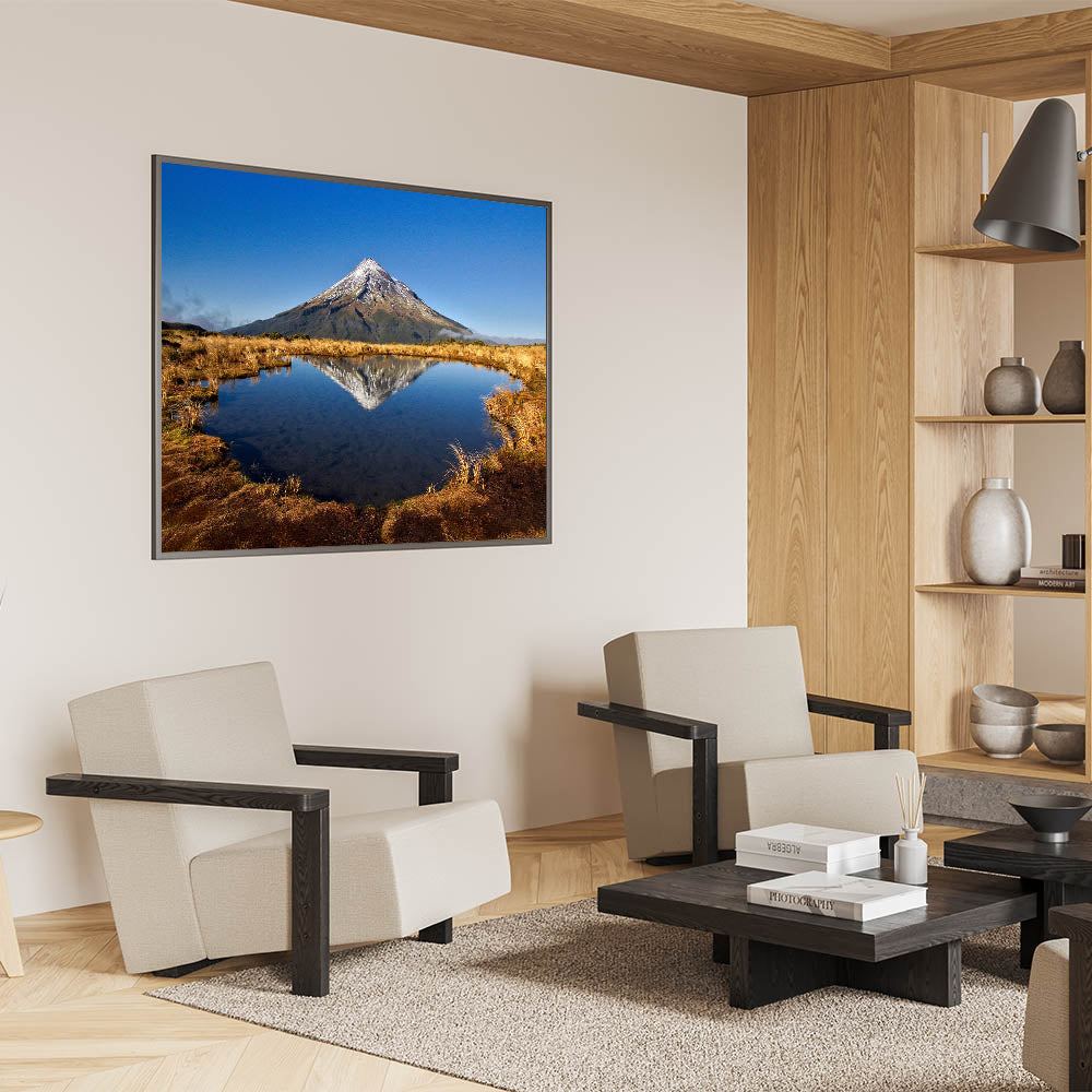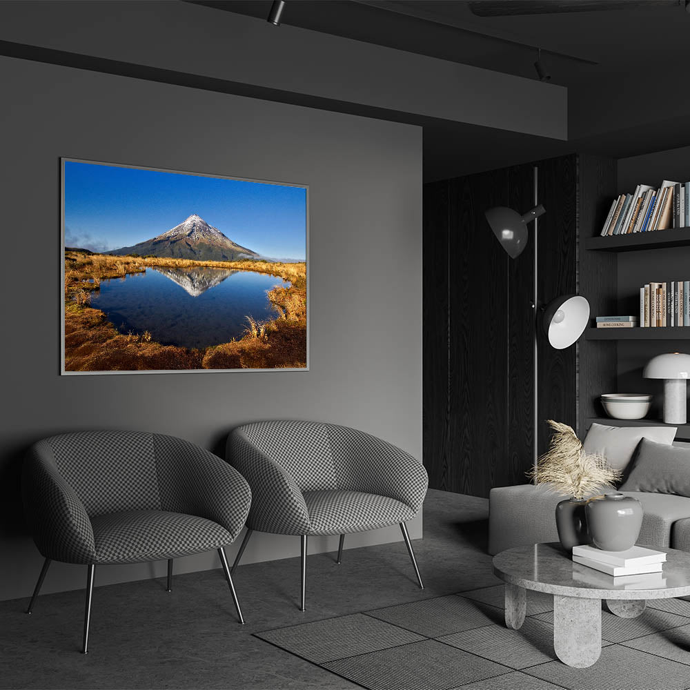 Enhance your space with the beauty of New Zealand’s natural landscapes through this stunning Taranaki landscape print. Featuring the iconic Mount Taranaki reflected in a crystal-clear lake under a brilliant blue sky, this artwork perfectly captures the breathtaking essence of New Zealand’s Taranaki region. Ideal for nature enthusiasts, travelers, or anyone looking to add a serene touch to their decor.