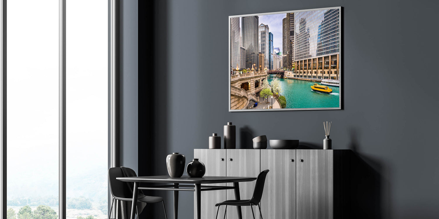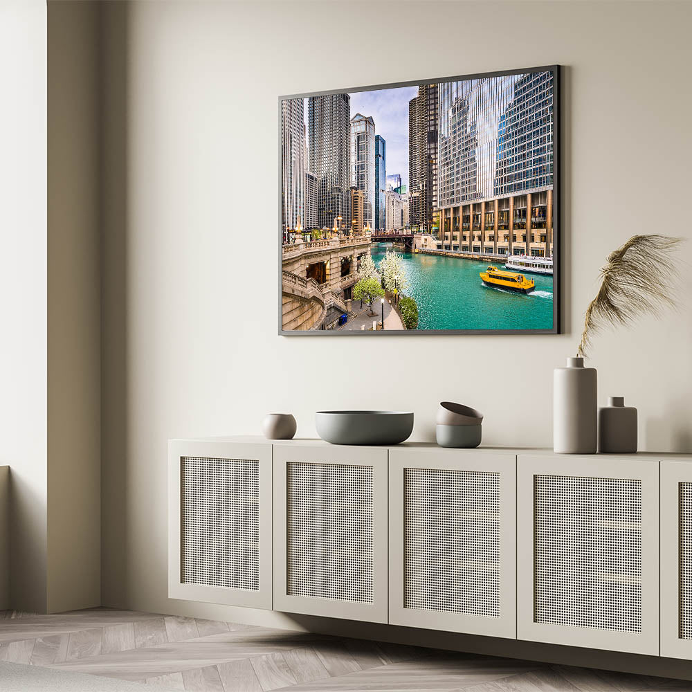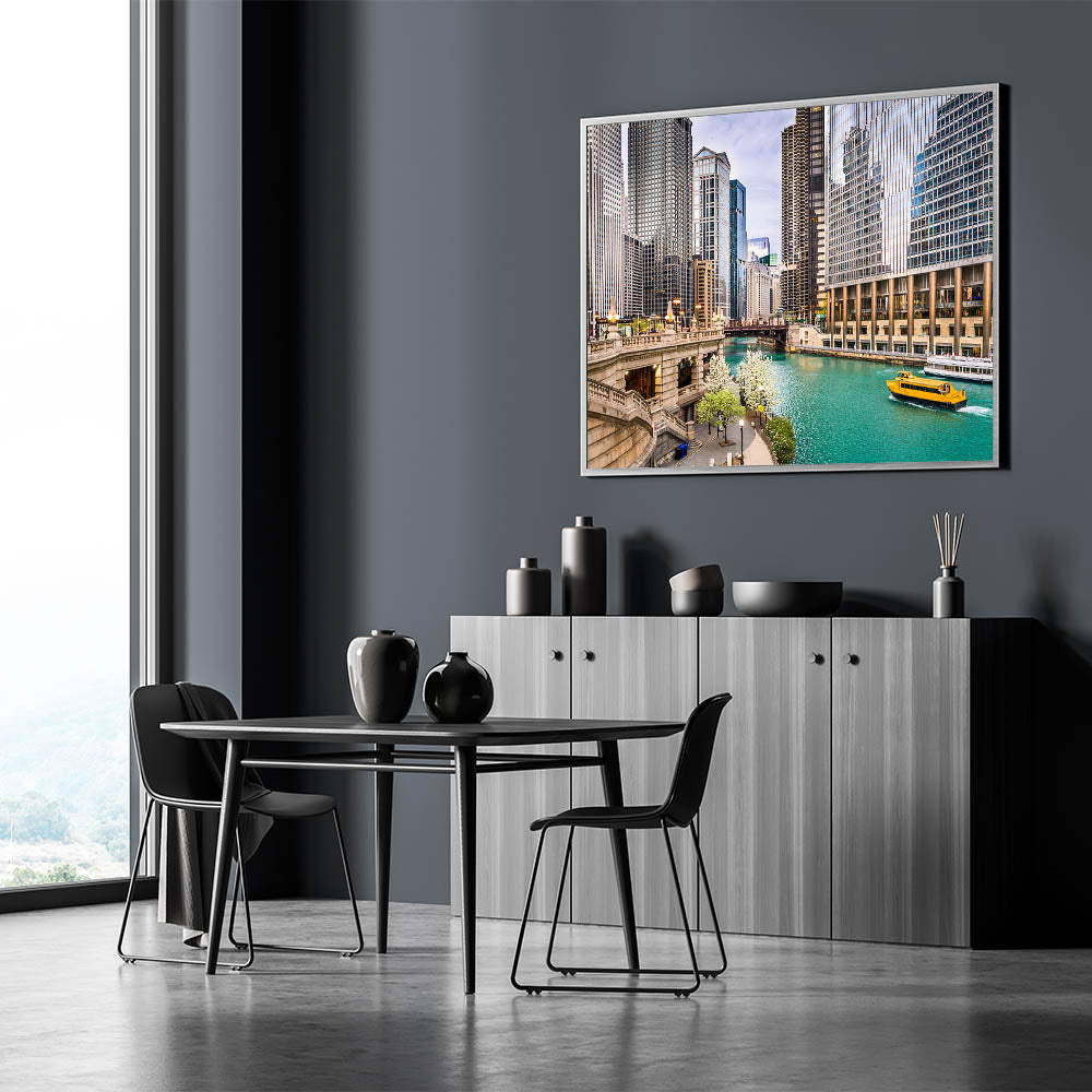 Capture the lively spirit of Chicago with this vibrant wall art featuring the city’s iconic skyline along the river, highlighted by the cheerful yellow water taxi. This dynamic cityscape showcases the architectural beauty of Chicago, with its mix of modern skyscrapers and historic buildings lining the riverbank. The bright blue water contrasts beautifully with the yellow taxi, adding a pop of color that brings energy and movement to the scene.