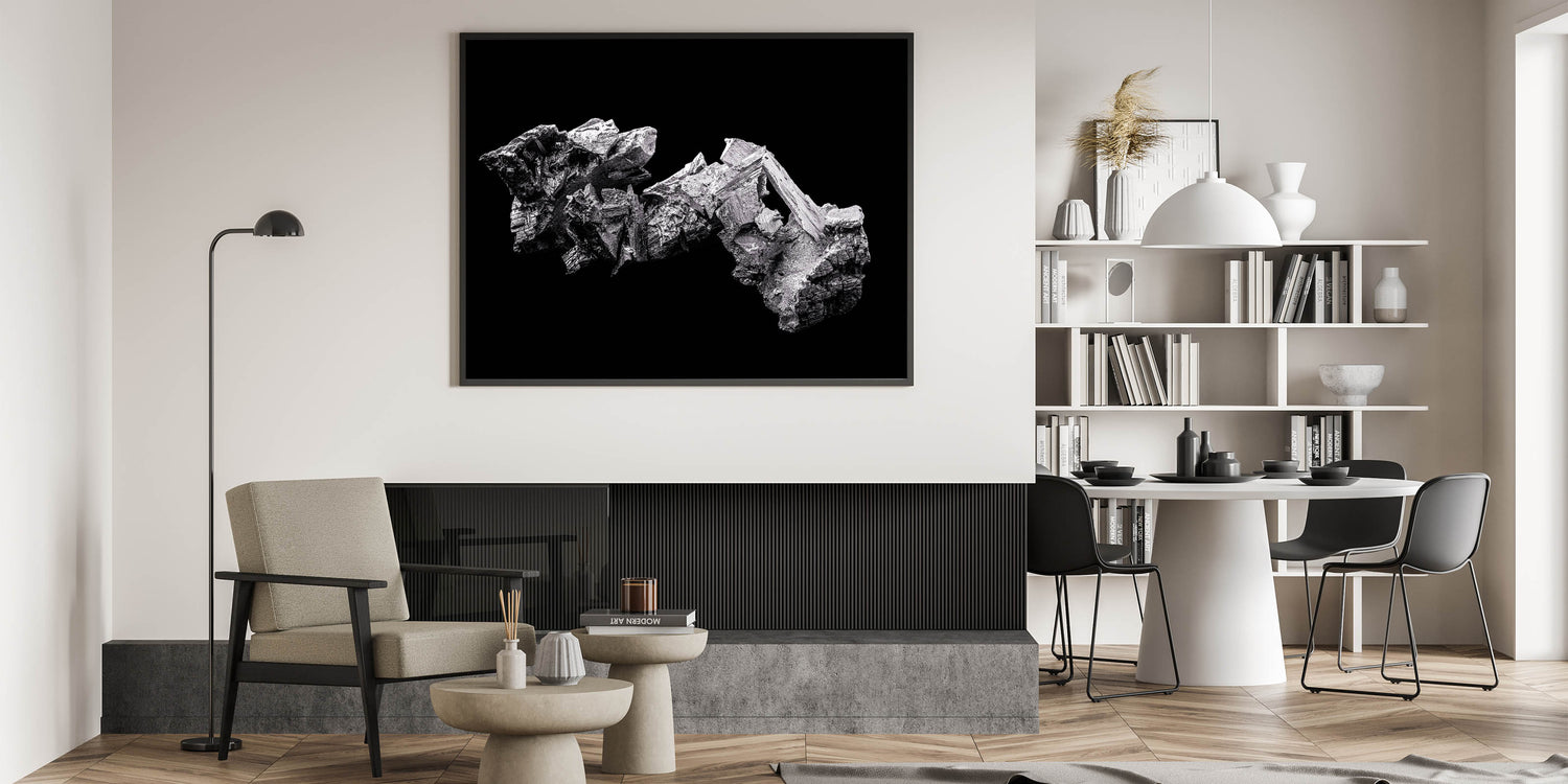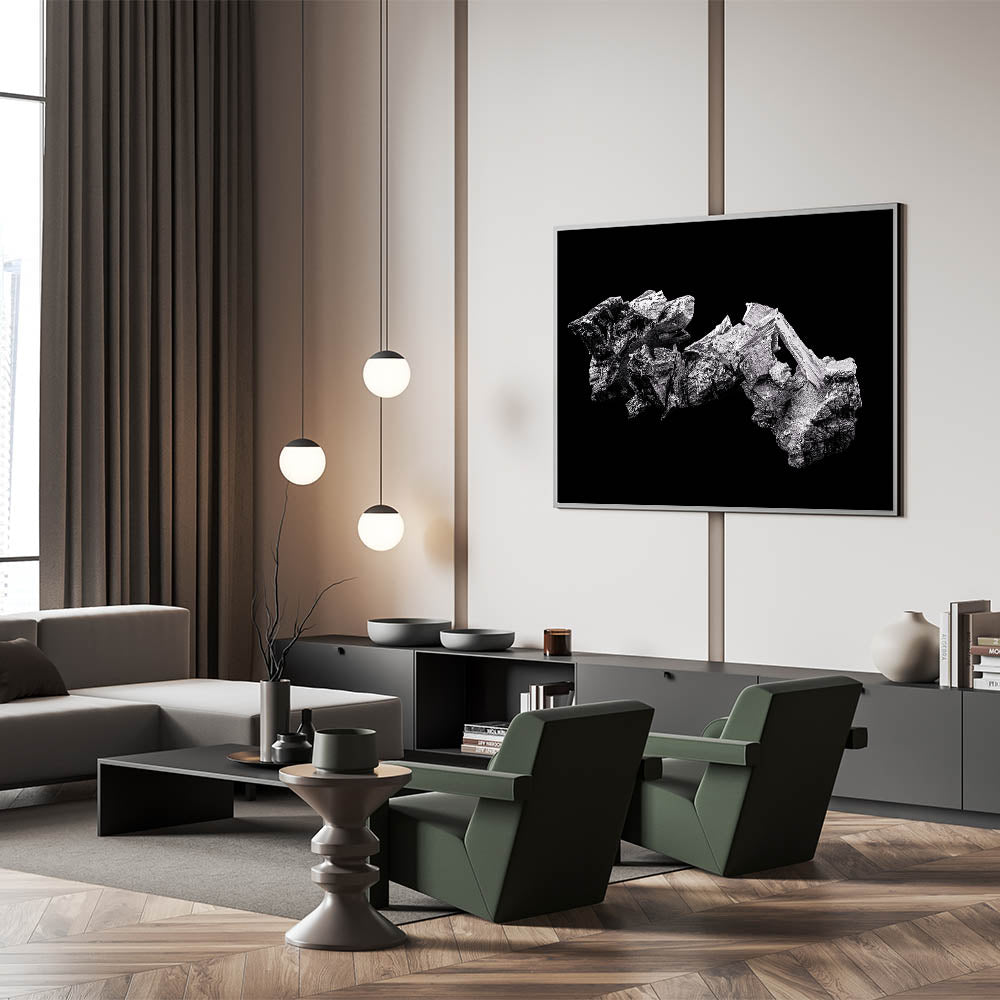 Add a bold and contemporary touch to your space with this striking Telluride-inspired metallic crystal art. Featuring intricate details of silver crystals set against a deep black background, this artwork highlights the raw beauty and texture of natural minerals. Perfect for modern interiors, this piece adds a touch of sophistication and elegance, making it ideal for those who appreciate the intersection of nature and art.