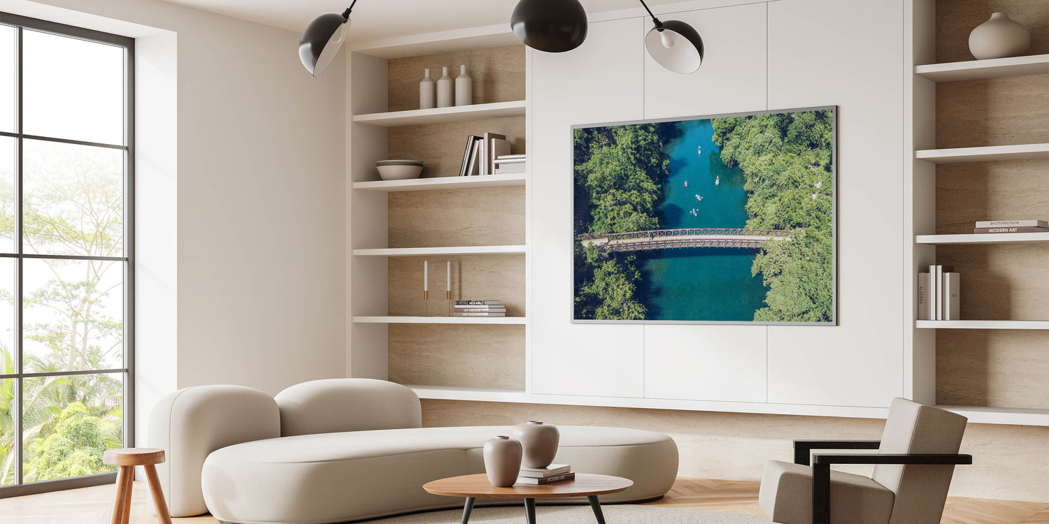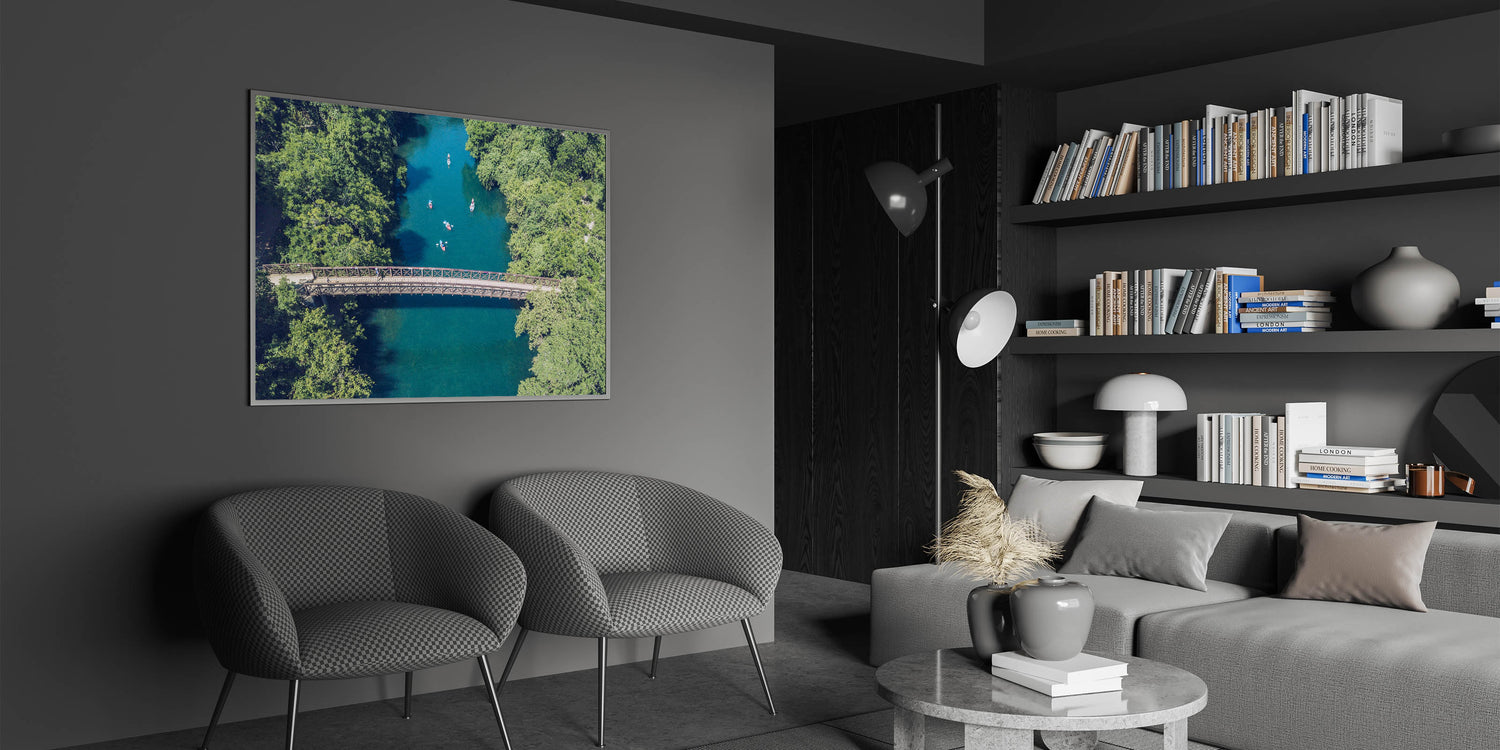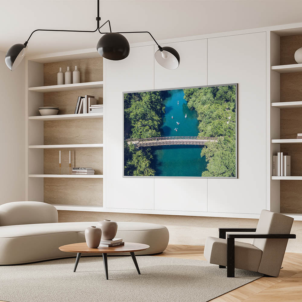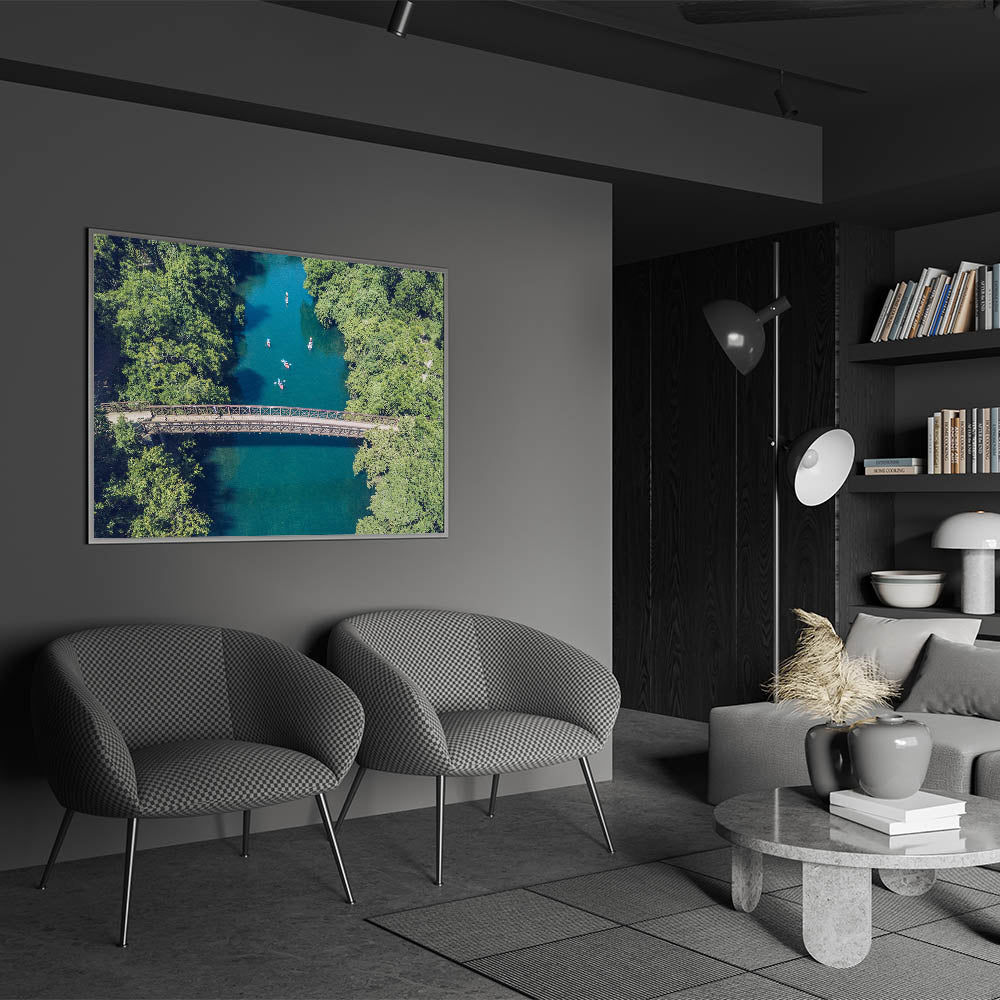 Bring the serene beauty of Austin’s natural landscapes into your home with this captivating artwork from our Austin wall art collection, featuring a peaceful aerial view of a bridge over the calm waters of a river. This Texas scenery by region showcases the harmony between urban design and nature, with kayakers paddling peacefully below, surrounded by lush green trees. Perfect for anyone who loves Austin photography decor and wants to bring a touch of nature into their space.