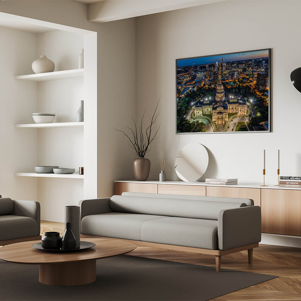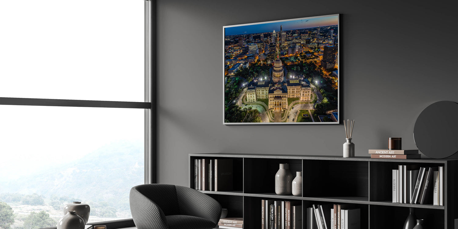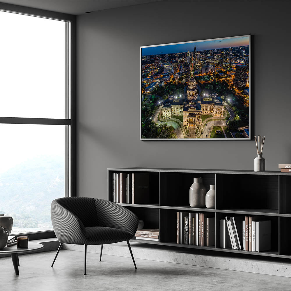 Experience the grandeur of Austin’s night skyline with this striking wall art, showcasing the Texas State Capitol illuminated against the vibrant cityscape. Part of our exclusive Austin wall art collection, this breathtaking Texas scenery by region captures the iconic Capitol building at night, highlighting both its architectural beauty and the dynamic energy of Austin’s downtown. This piece is perfect for those who appreciate the blend of historical landmarks and modern urban landscapes.