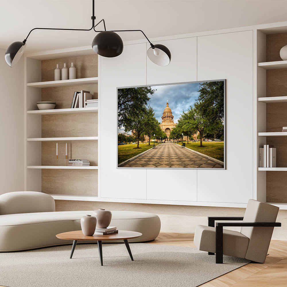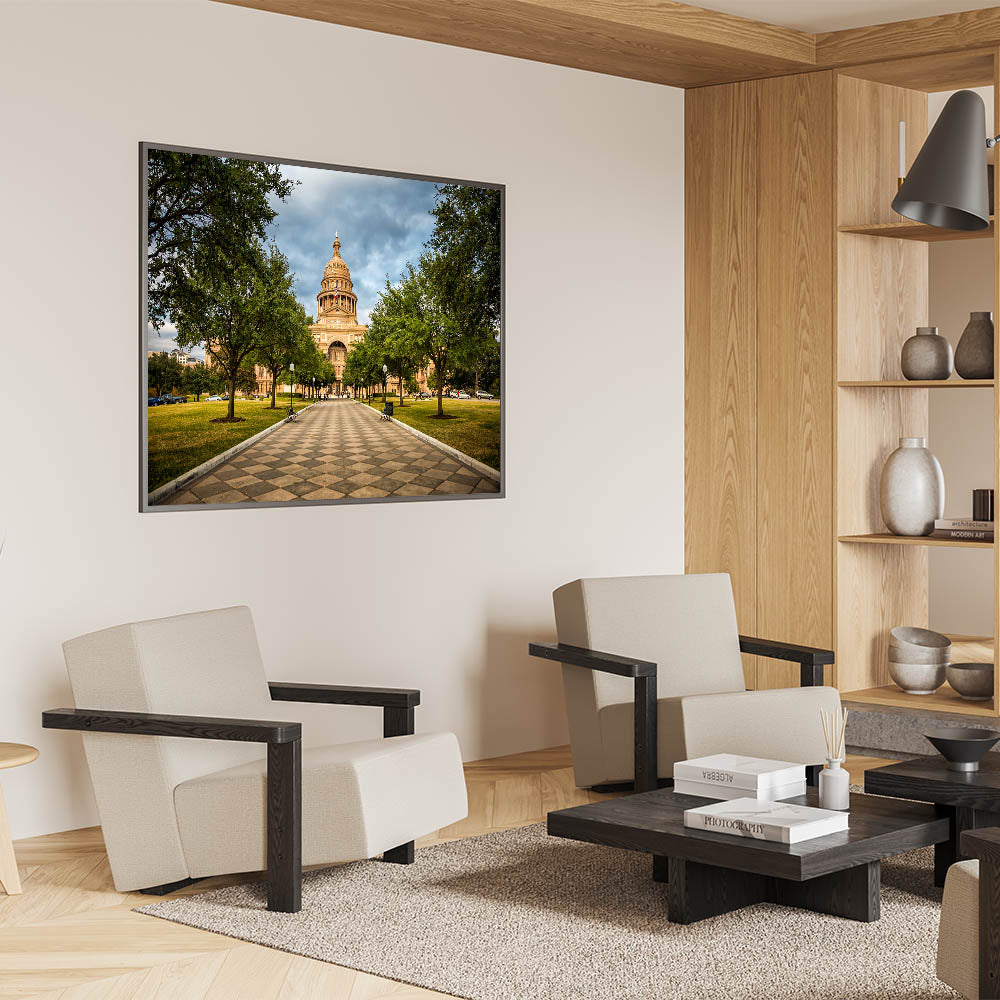 Bring a piece of Austin's historical charm into your home with this stunning wall art from our Austin wall art collection, featuring the Texas State Capitol surrounded by lush green trees. The tree-lined path leading up to the majestic Capitol building offers a striking composition that captures the peaceful beauty and architectural grandeur of this iconic landmark. This piece from the Texas scenery by region collection is perfect for those who love Austin cityscape art and appreciate the balance between nature and history.