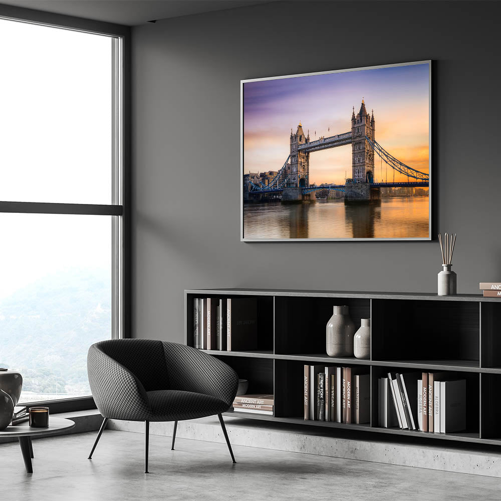 Enhance your home or office decor with this captivating London Skyline Art of Tower Bridge during a serene sunset. This England Scenic Art piece beautifully captures the grandeur of London’s architecture, making it an ideal addition for lovers of British Landmark Art. The soft sunset hues reflect over the River Thames, creating a peaceful yet iconic scene.
