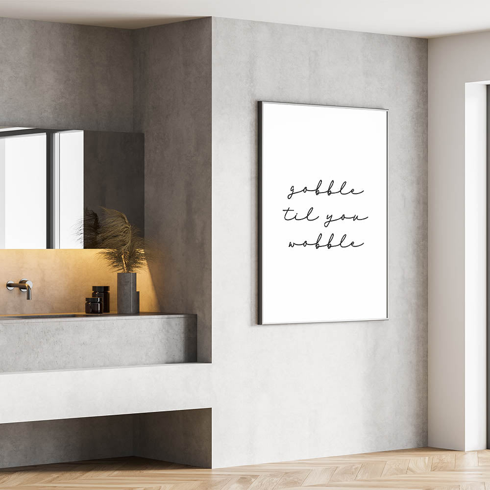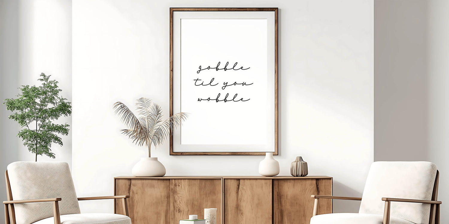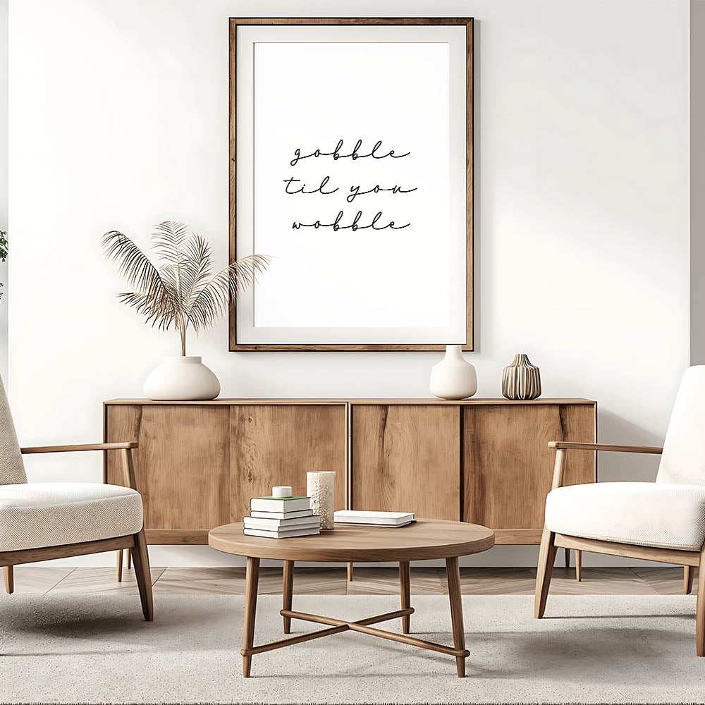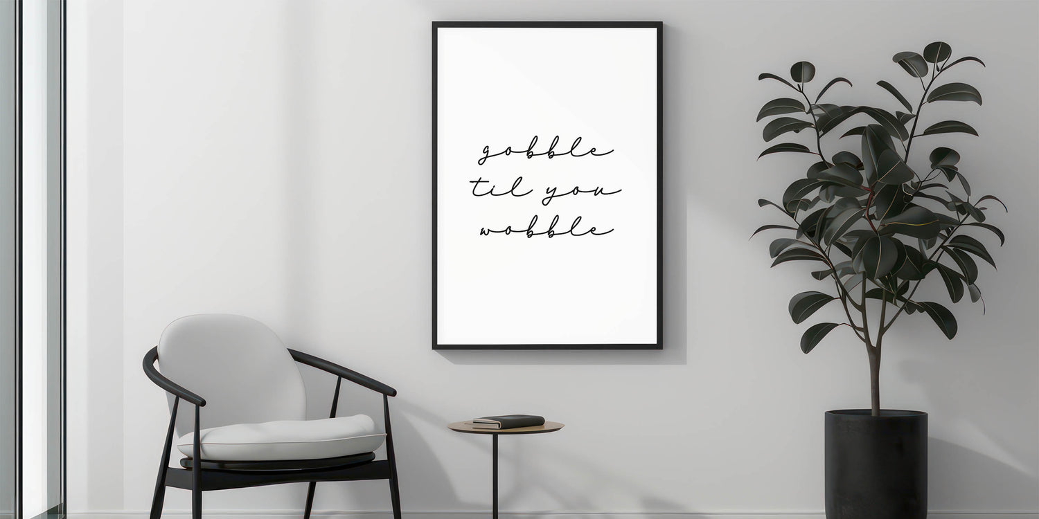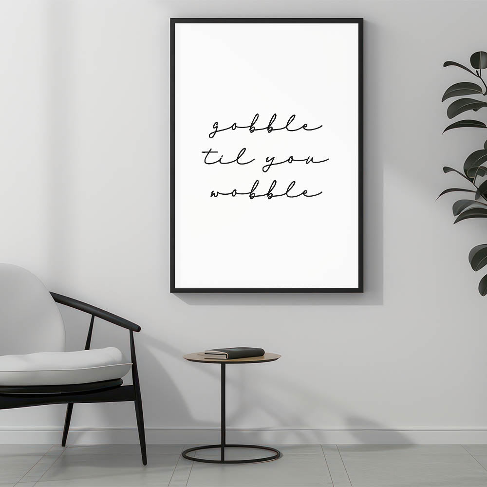 Bring laughter and festive spirit to your home with this Funny Thanksgiving Wall Art, featuring the playful phrase "Gobble Til You Wobble" in stylish, handwritten script. This Autumn Canvas Art embraces the fun and joy of the holiday season with a minimalist black-and-white design that fits seamlessly into any decor. Whether displayed in a kitchen, dining room, or entryway, this Fall Wall Decor is the perfect addition to your Thanksgiving celebration.