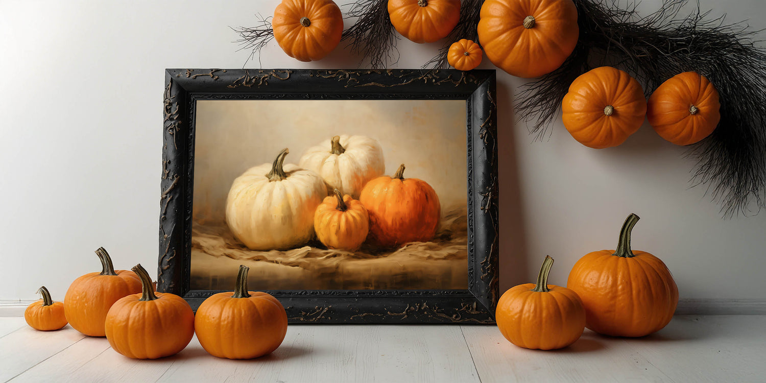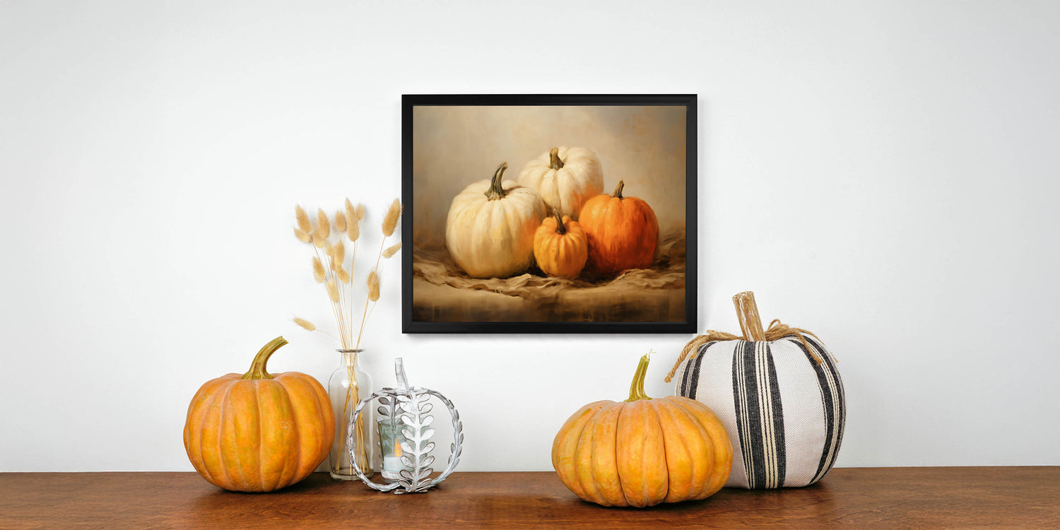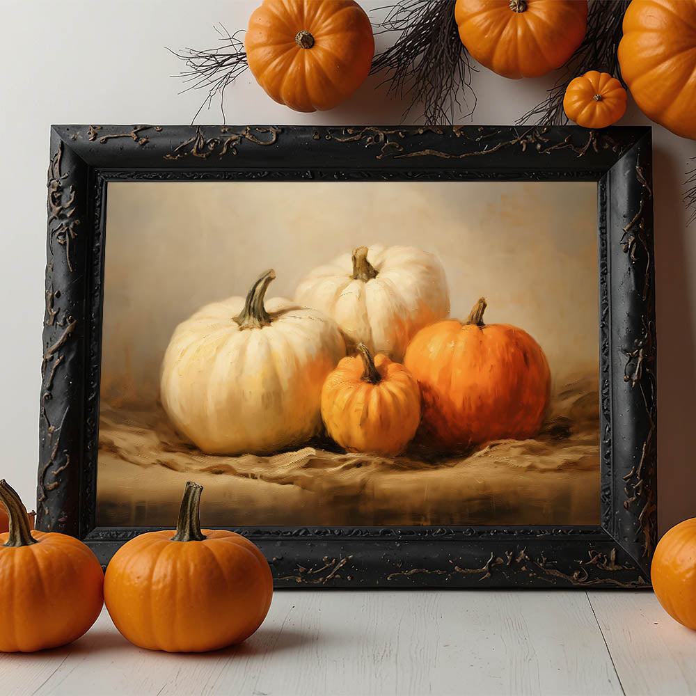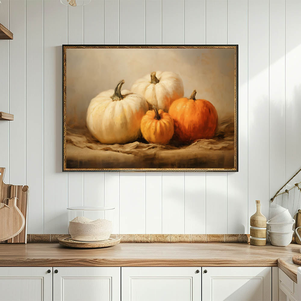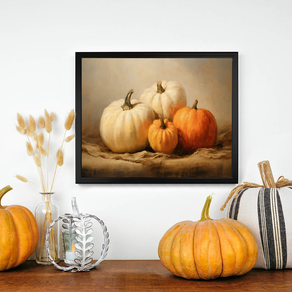 Celebrate the harvest season with this stunning Thanksgiving Wall Decoration, featuring a collection of beautifully arranged white and orange pumpkins. The soft, earthy tones and rustic textures create a cozy and elegant fall atmosphere, making this artwork a perfect addition to your seasonal decor.