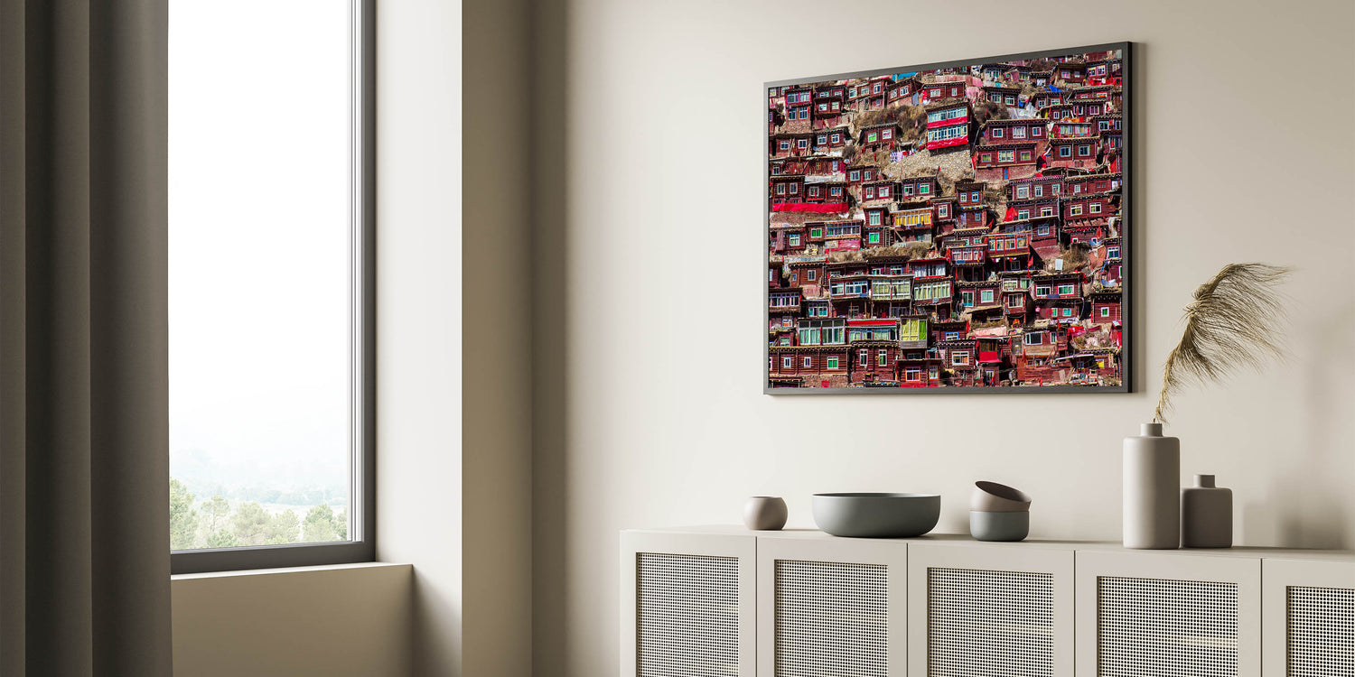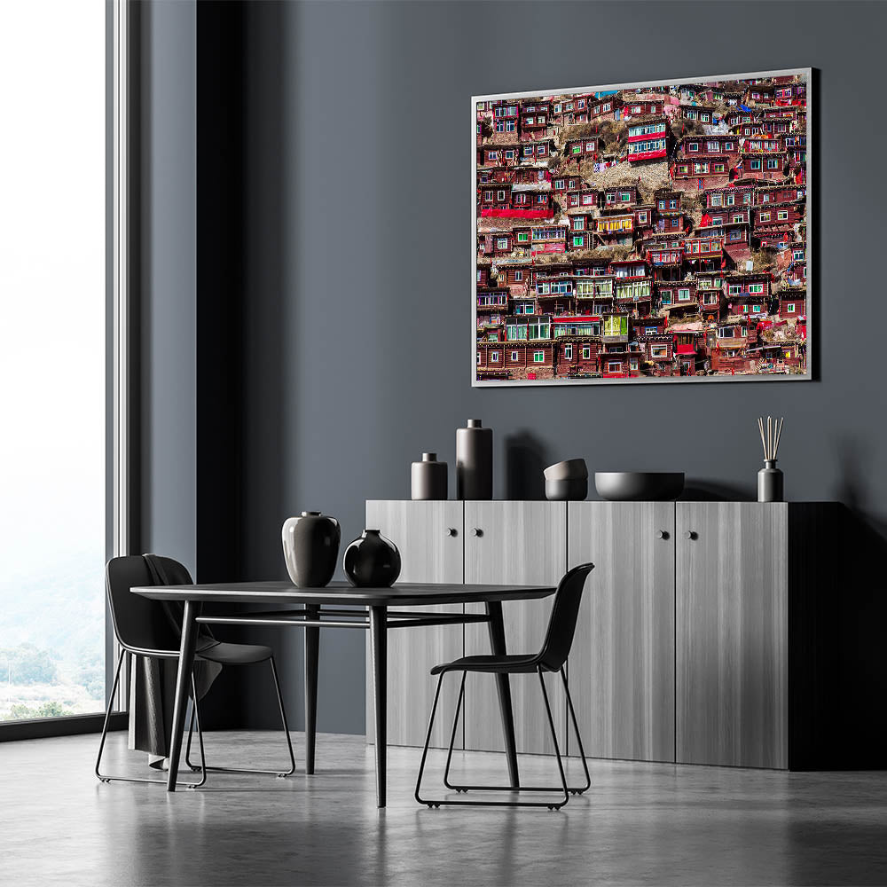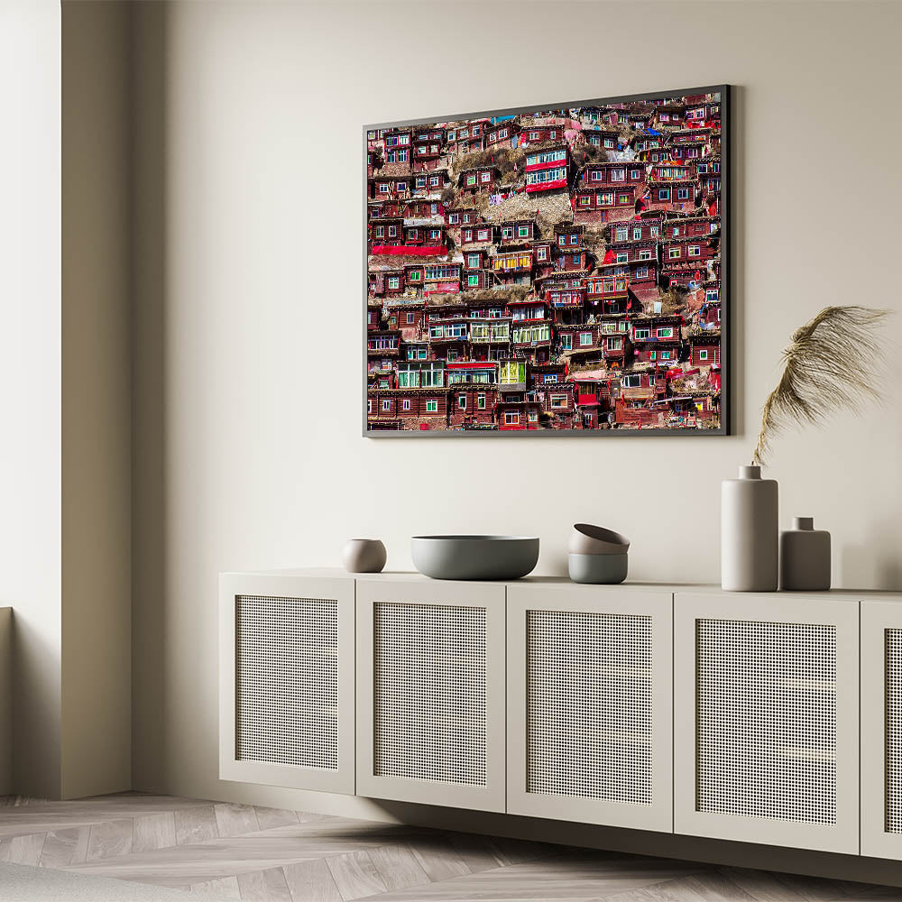 Embrace the vibrant charm of Tibetan village life with this stunning wall art, showcasing a colorful hillside settlement nestled in the heart of Tibet. Each house, adorned with distinct colors and traditional architectural details, creates a captivating mosaic that celebrates Tibetan culture and community. This artwork is perfect for those looking to add a lively, cultural touch to their decor, making it an ideal addition to any room.