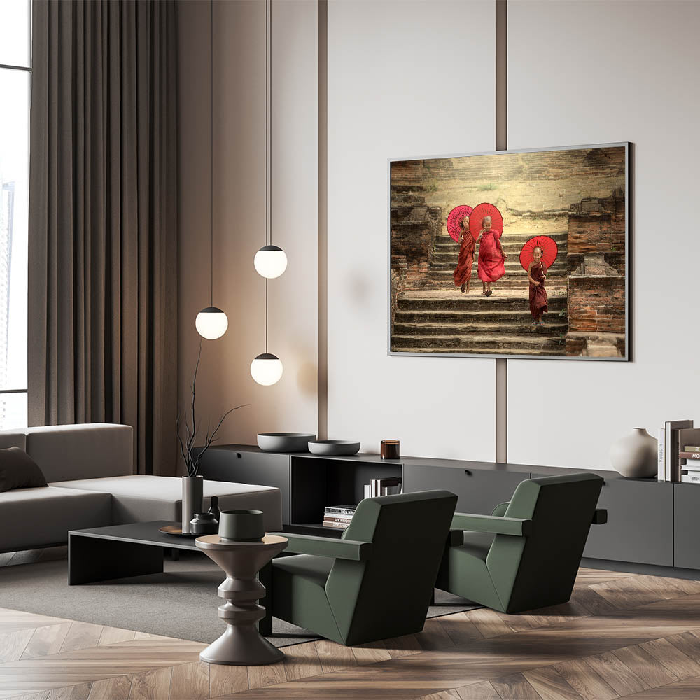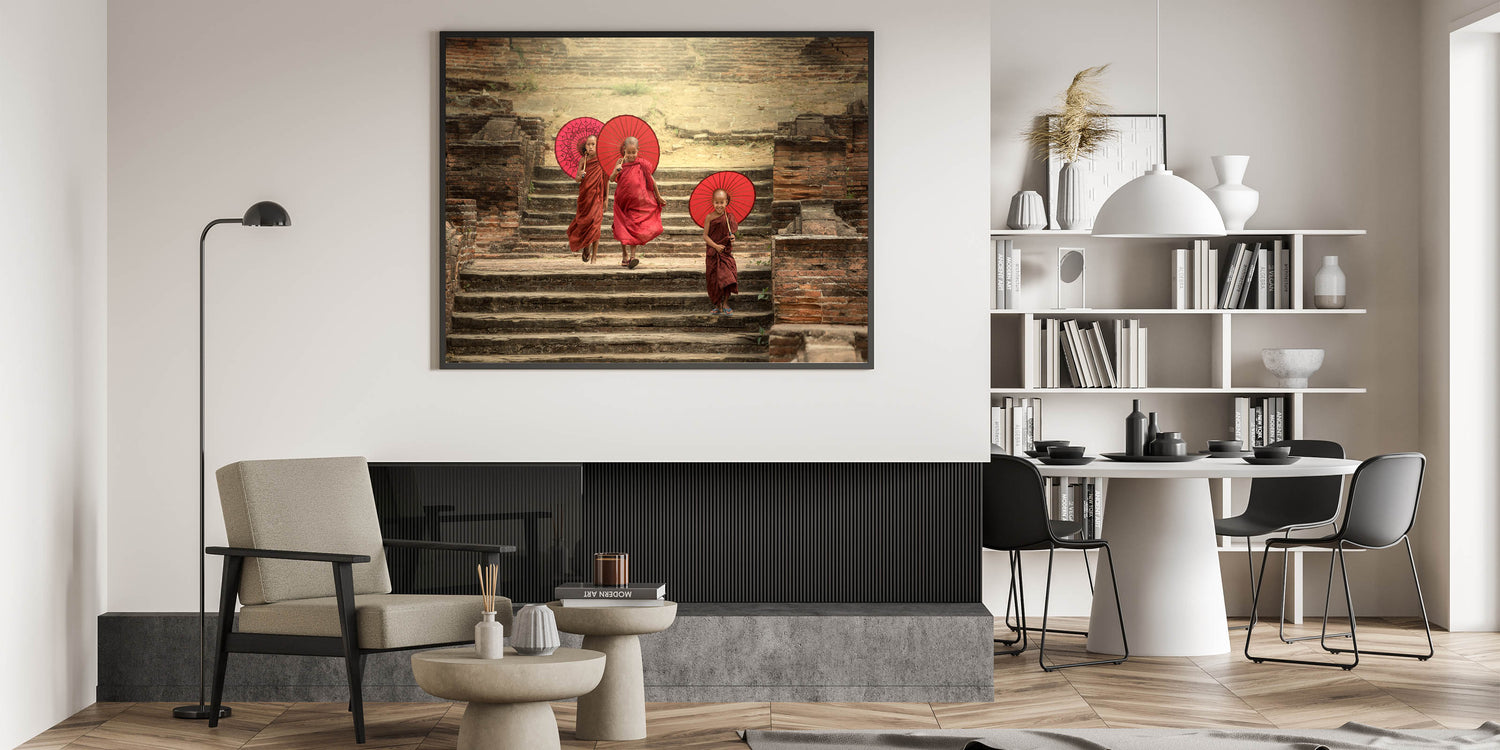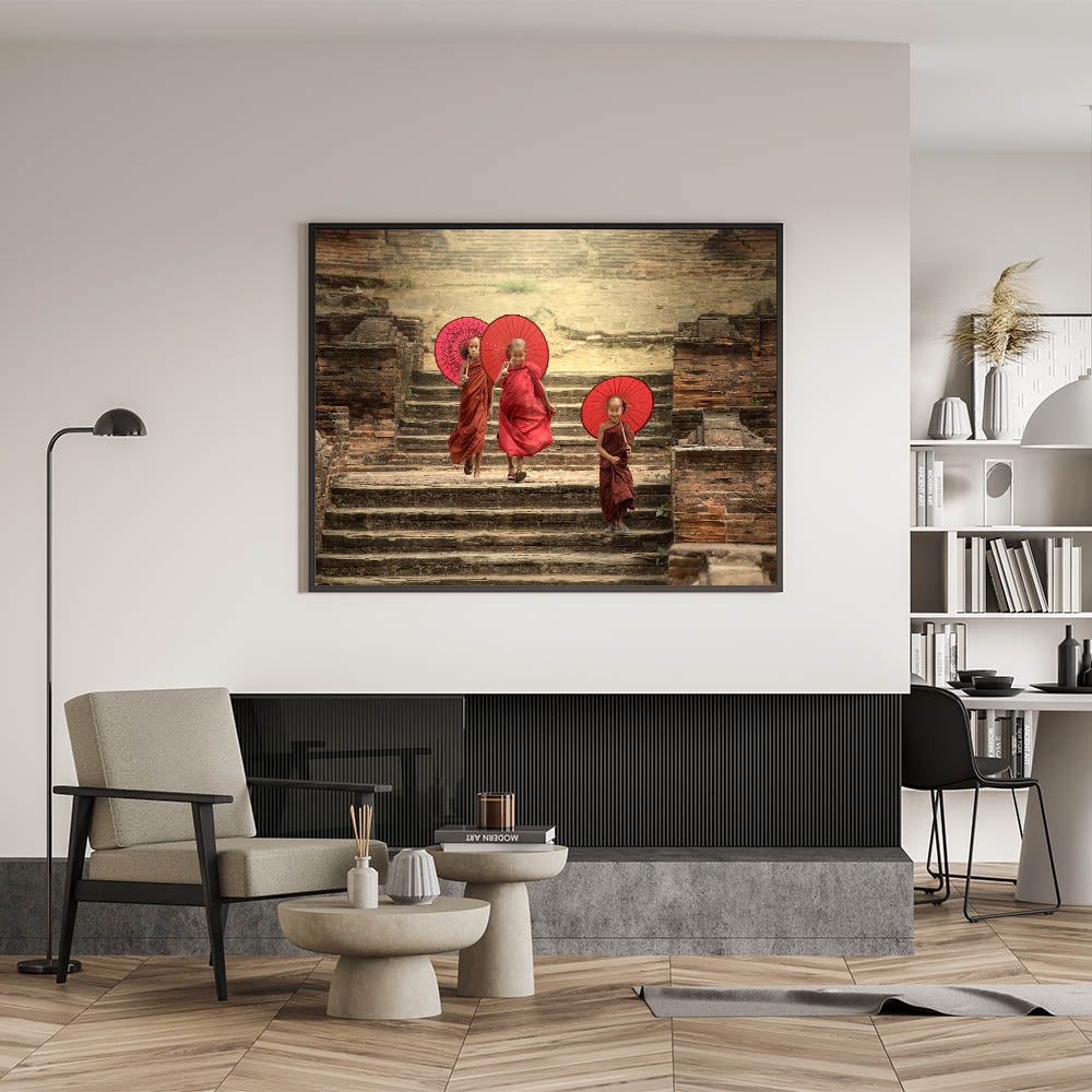Add a serene and cultural touch to your decor with this captivating wall art of young Tibetan monks holding red parasols. Set against a timeless stone backdrop, this image captures a moment of joy and simplicity in Tibetan life, making it a beautiful piece for any home or office. This artwork offers a unique window into Tibetan culture, ideal for those who appreciate the rich heritage of the region.