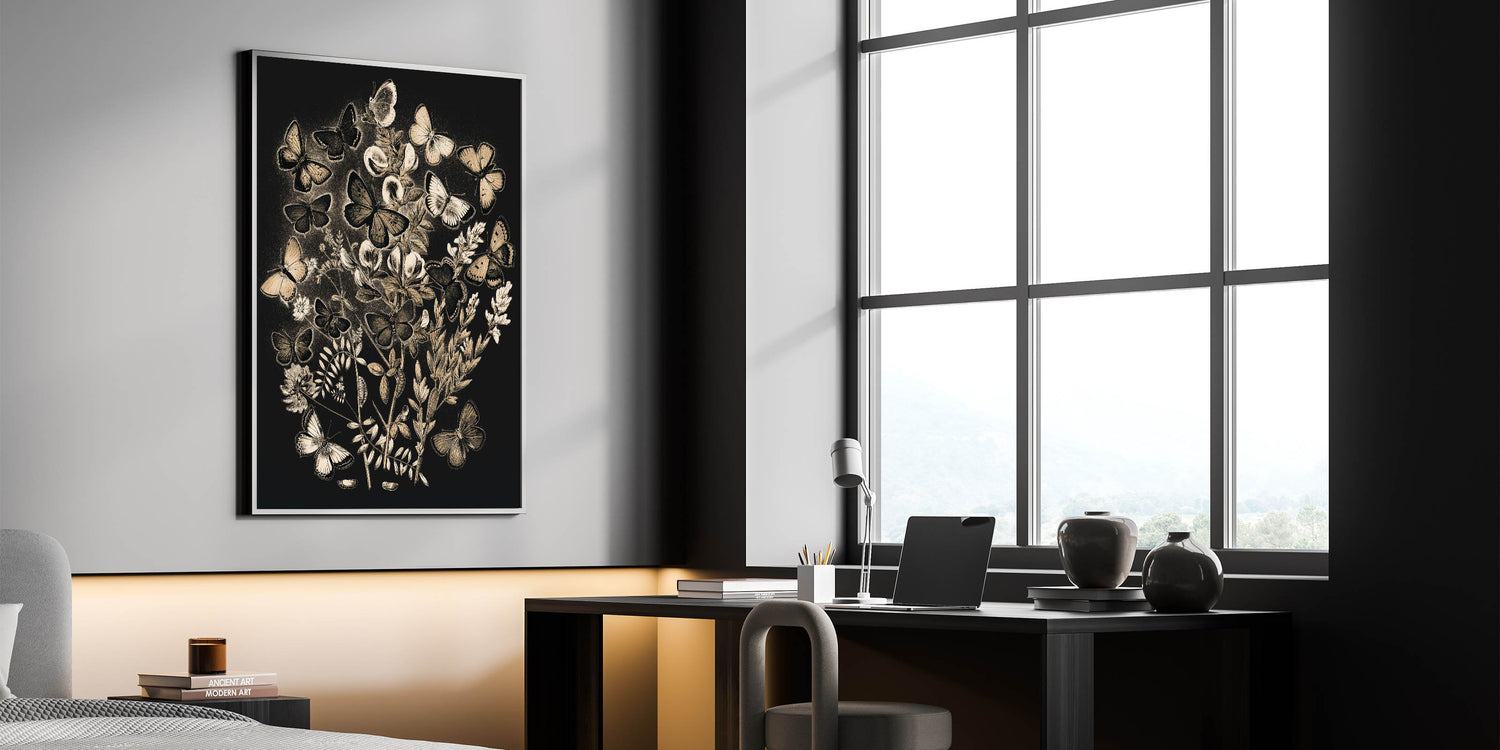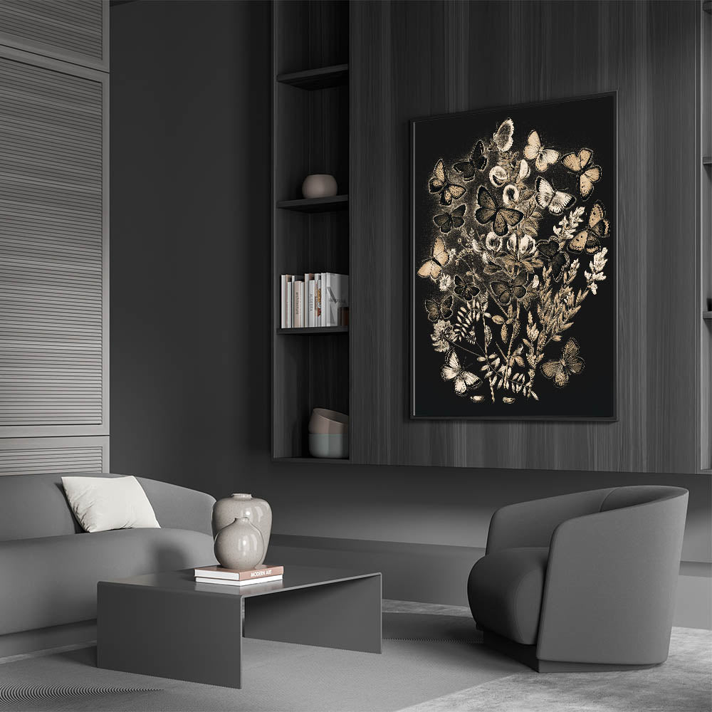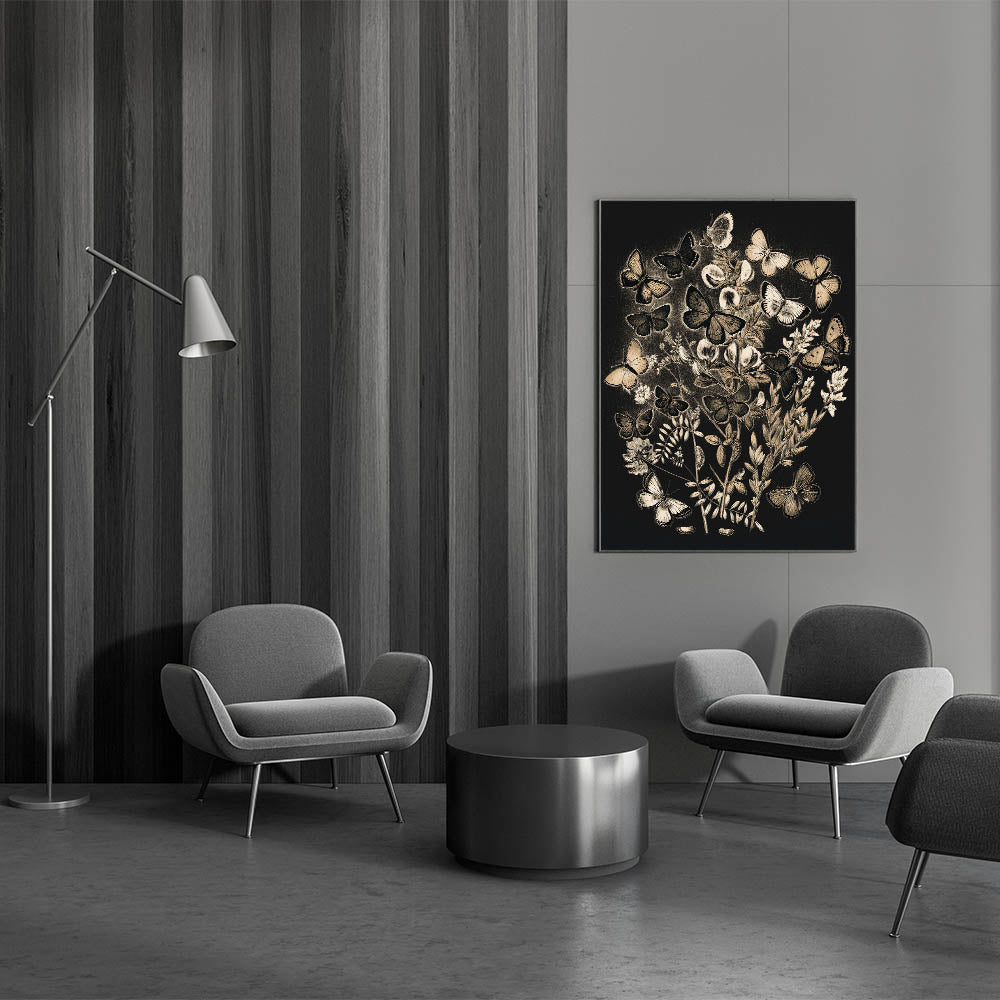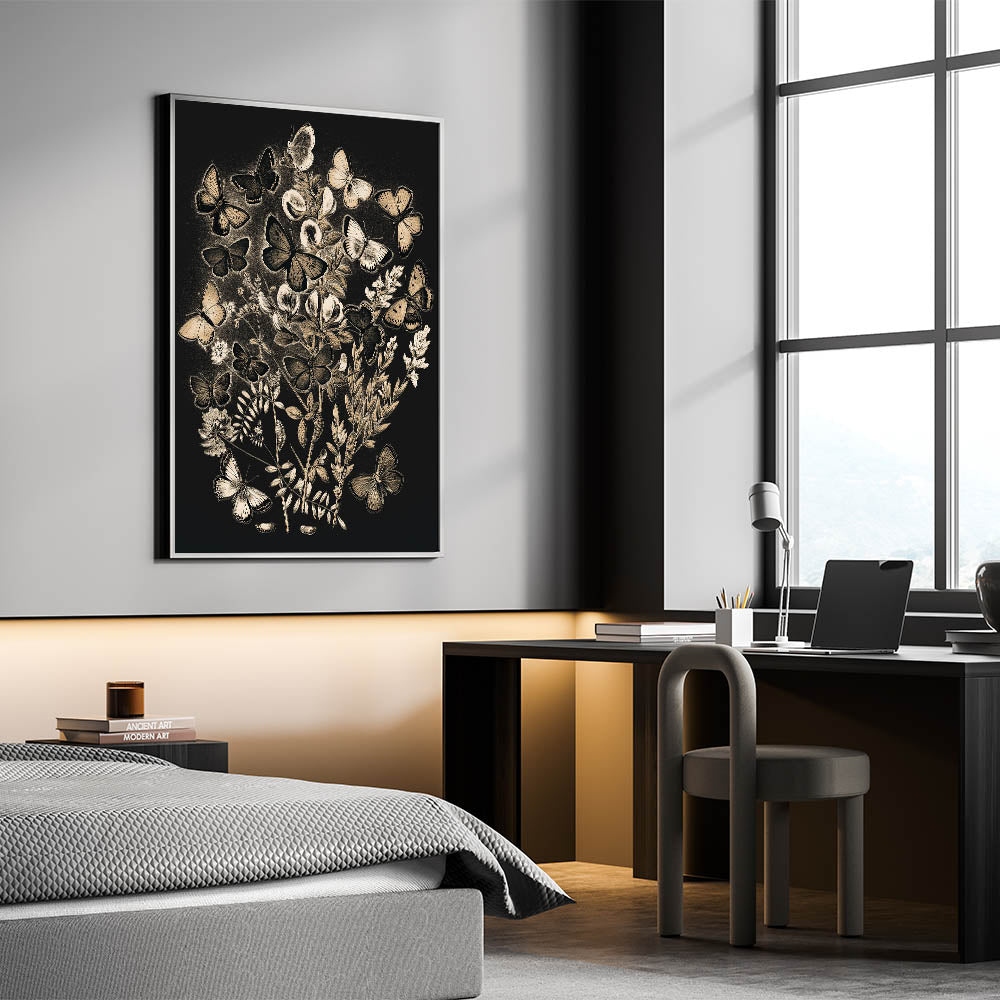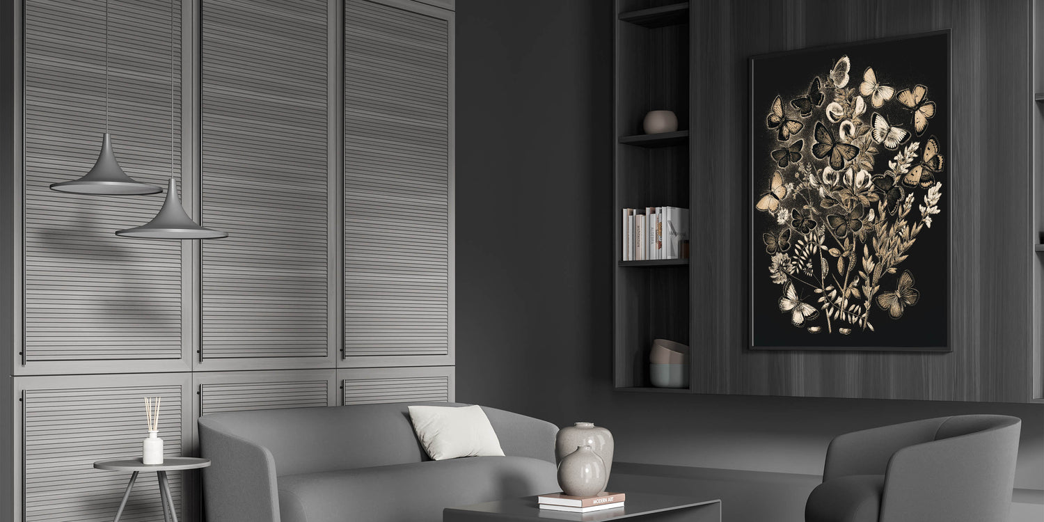 - Grunge-inspired Design: An urban and abstract depiction of butterflies and plants, enhancing your space with a modern grunge aesthetic.