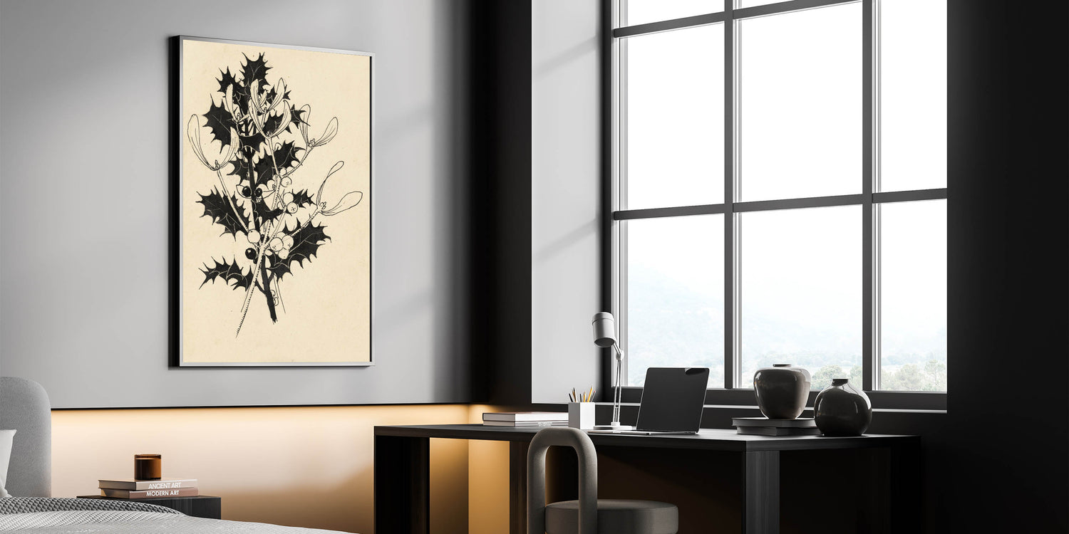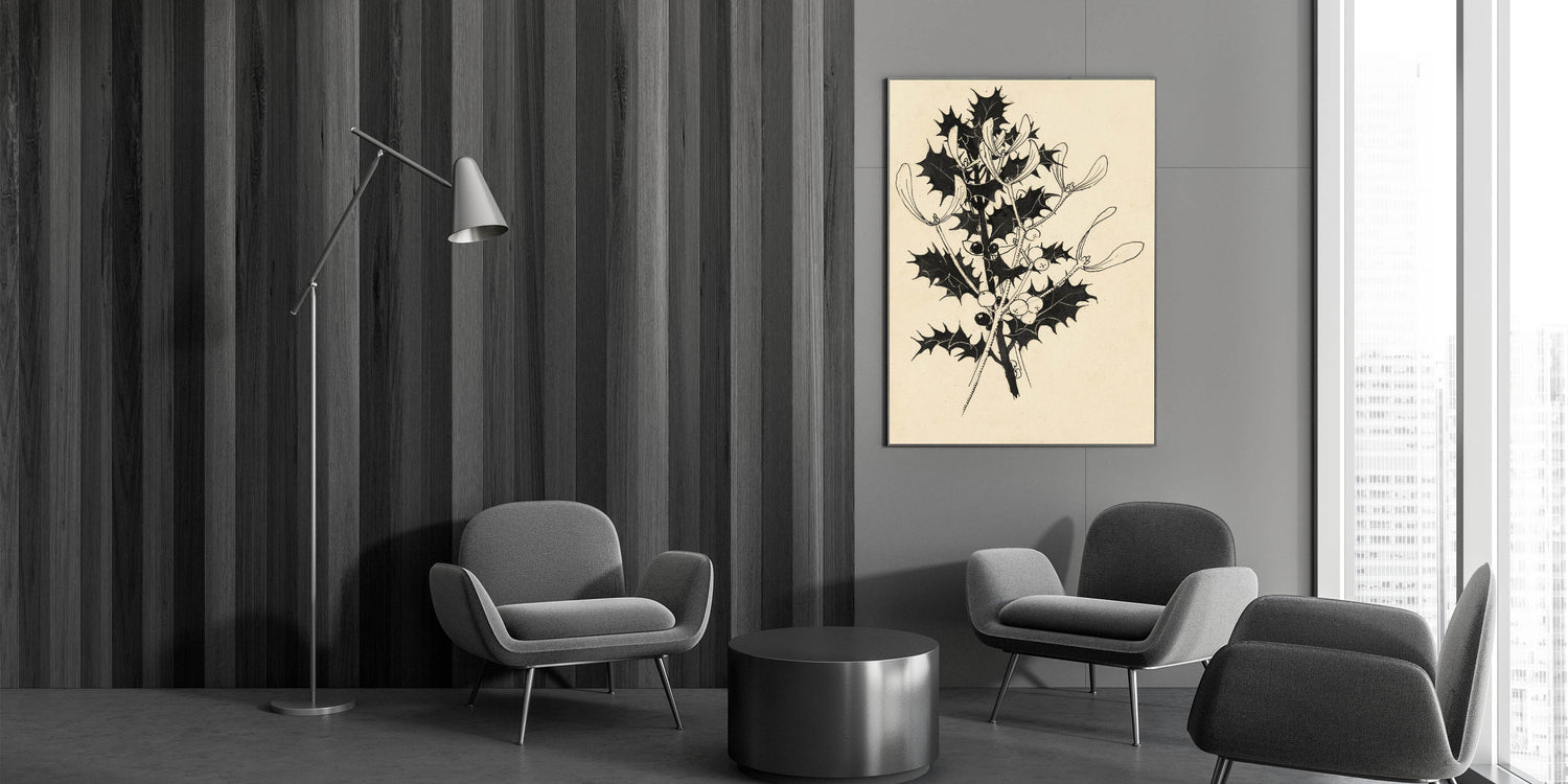 Embrace the simplicity of nature with this grunge-inspired wall decor featuring a black and white botanical illustration. The distressed and minimalistic depiction of foliage captures a timeless aesthetic, perfect for lovers of urban grunge art seeking to add a natural touch to their space. The stark contrast of the black leaves against the light background creates a striking visual that fits seamlessly into modern, retro, or eclectic interiors. This grunge canvas print is ideal for living rooms, bedrooms, or offices, providing an artistic focal point that complements various decor styles.