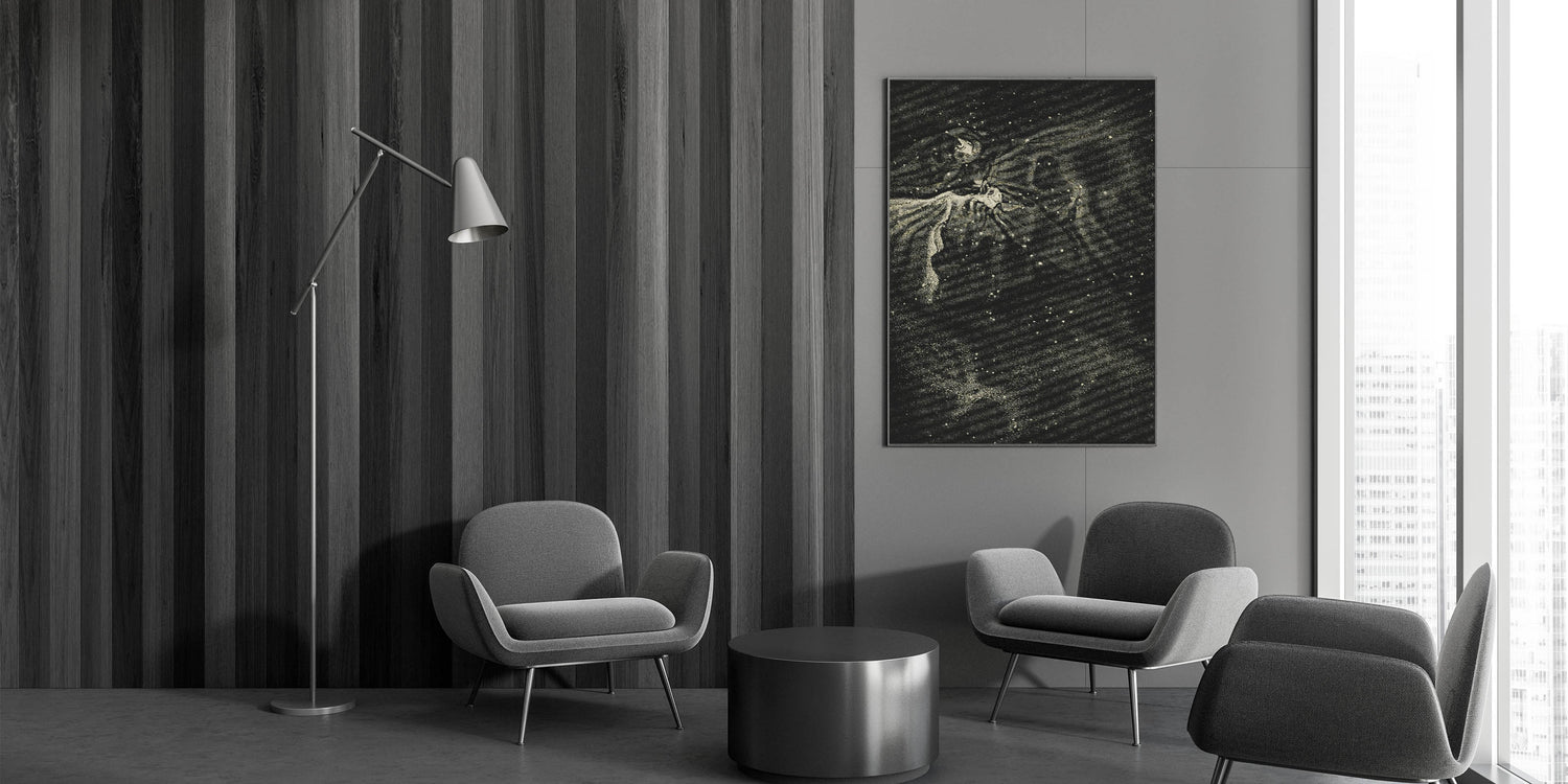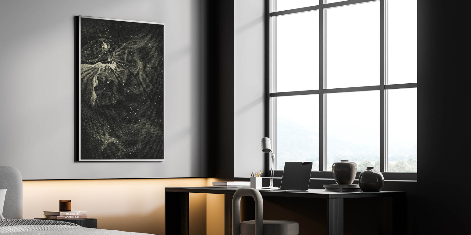 - A captivating blend of vintage grunge art and celestial beauty, ideal for modern, industrial, or eclectic interiors.