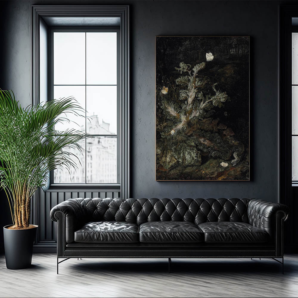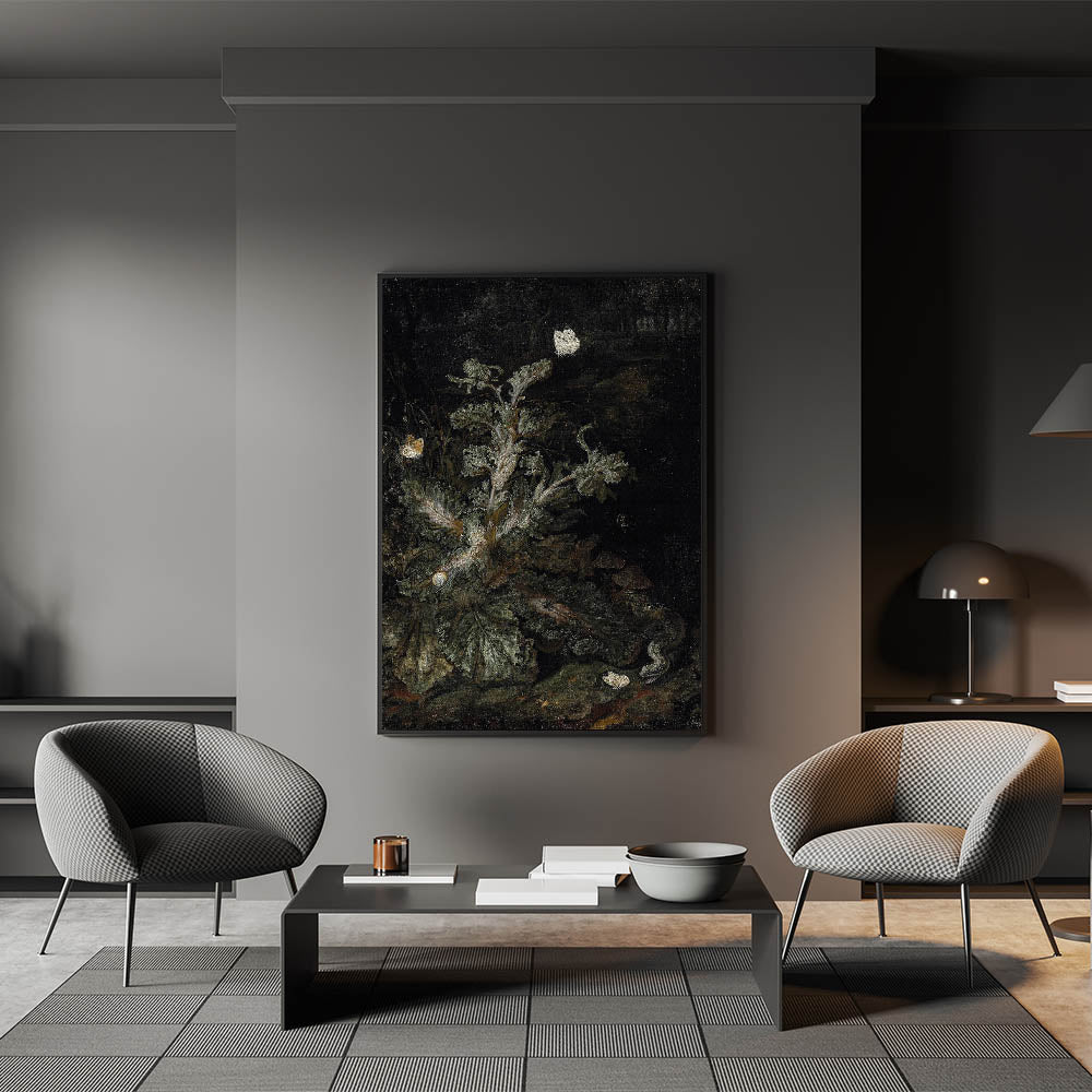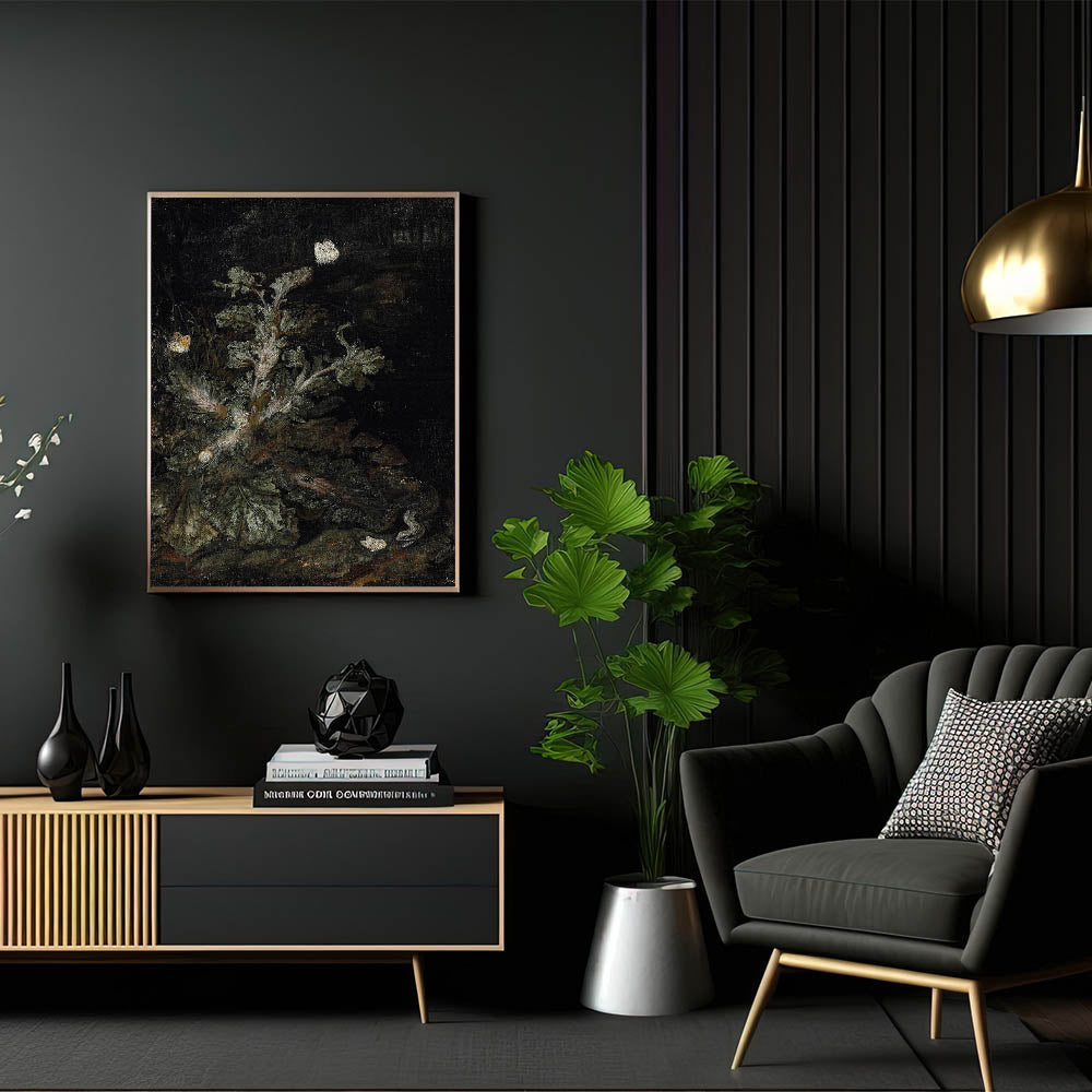 Immerse your space in the mystique of nature with this Dark Art Decor piece, featuring a captivating and shadowy depiction of flora and wildlife. This artwork captures the essence of moody art prints, presenting a scene rich with texture and detail, where butterflies and a snail are surrounded by dark foliage. The play of light and shadow adds depth, making this piece a perfect choice for creating a moody interior atmosphere.