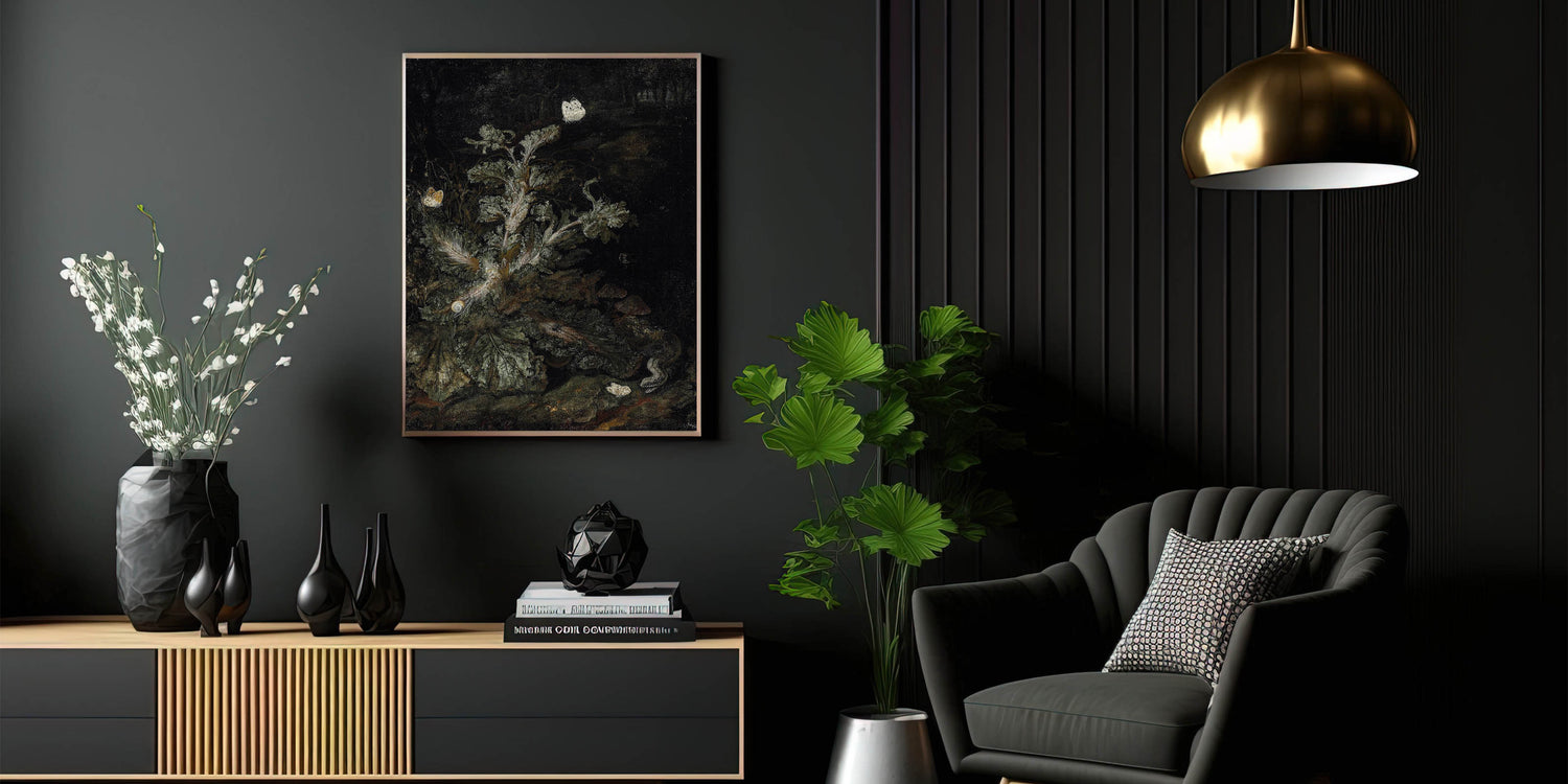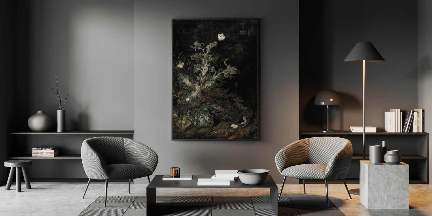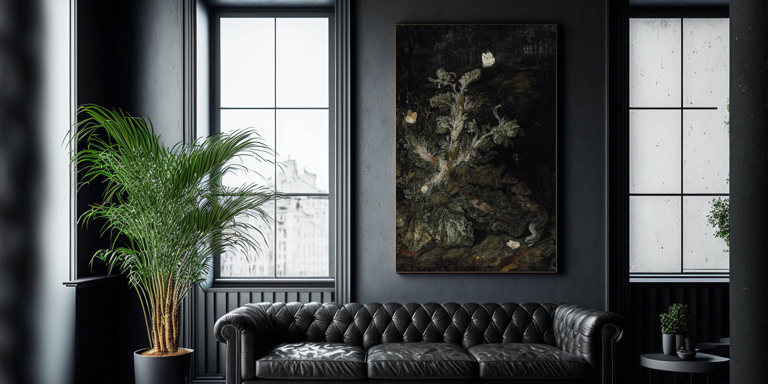 Immerse your space in the mystique of nature with this Dark Art Decor piece, featuring a captivating and shadowy depiction of flora and wildlife. This artwork captures the essence of moody art prints, presenting a scene rich with texture and detail, where butterflies and a snail are surrounded by dark foliage. The play of light and shadow adds depth, making this piece a perfect choice for creating a moody interior atmosphere.