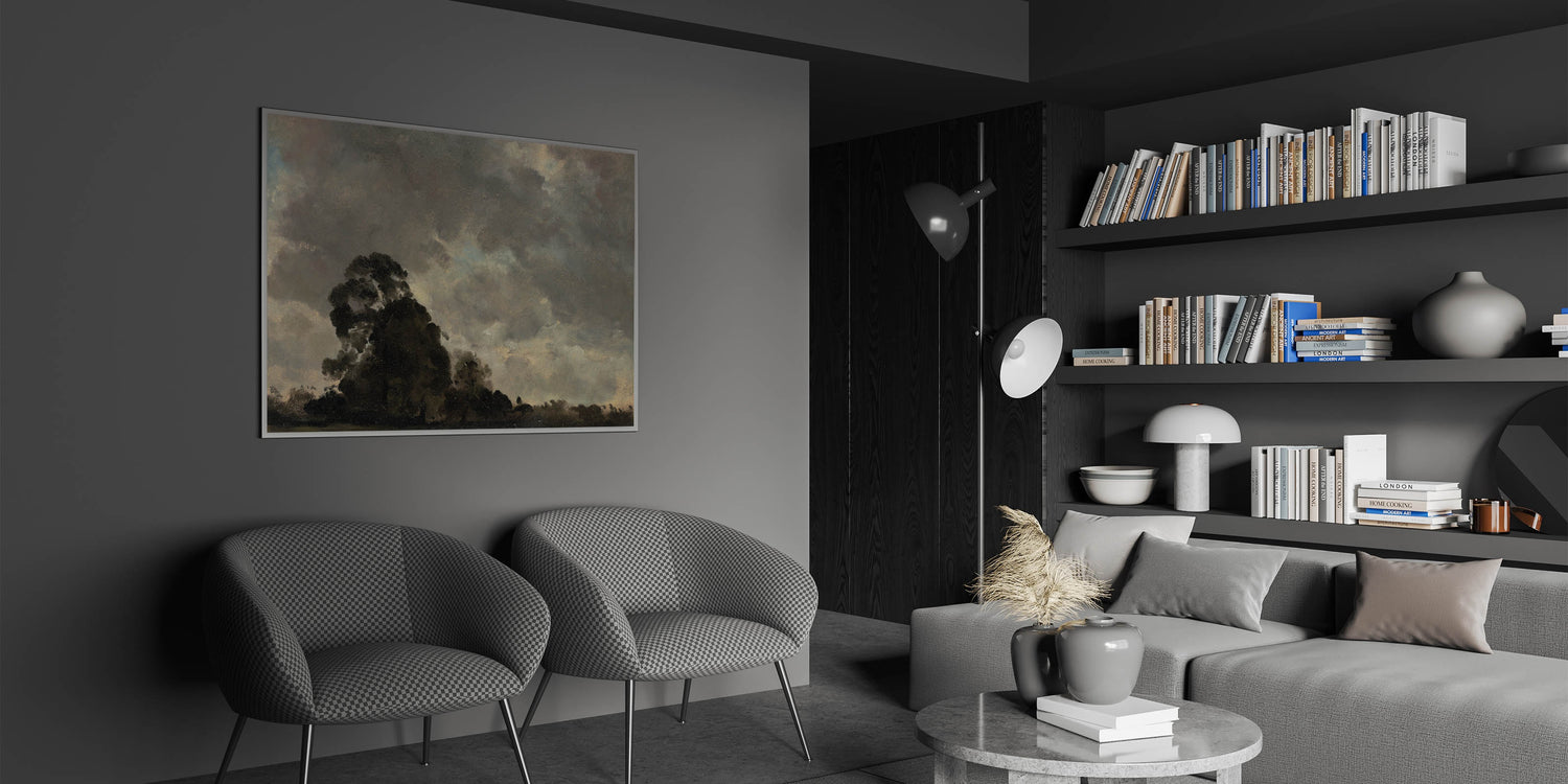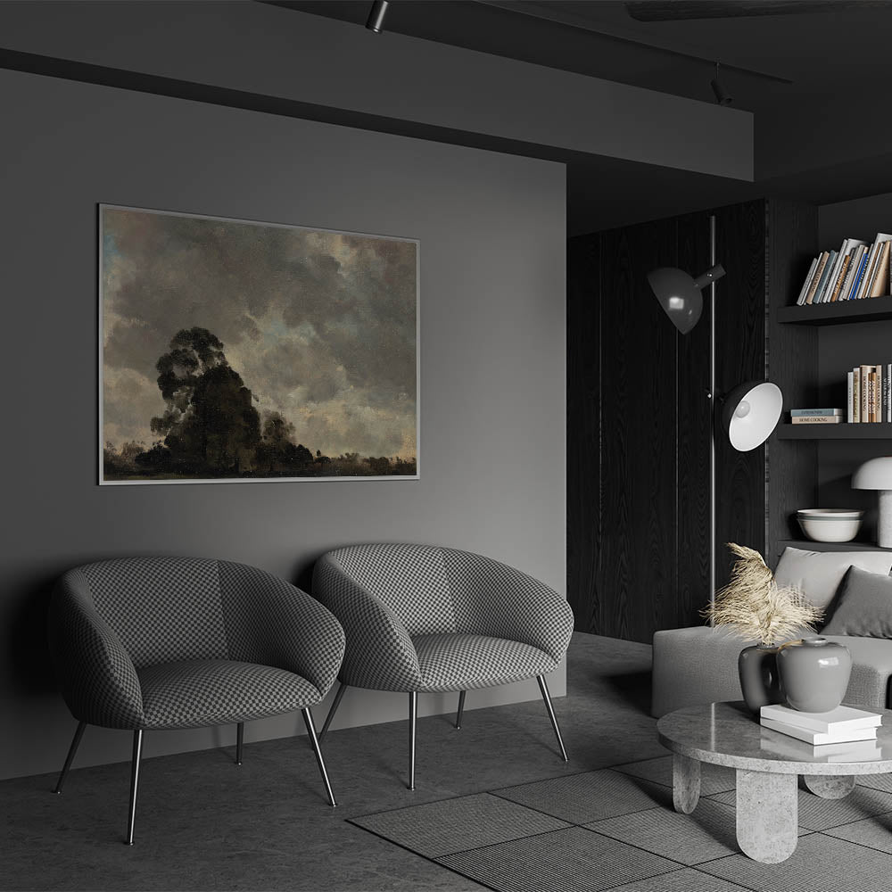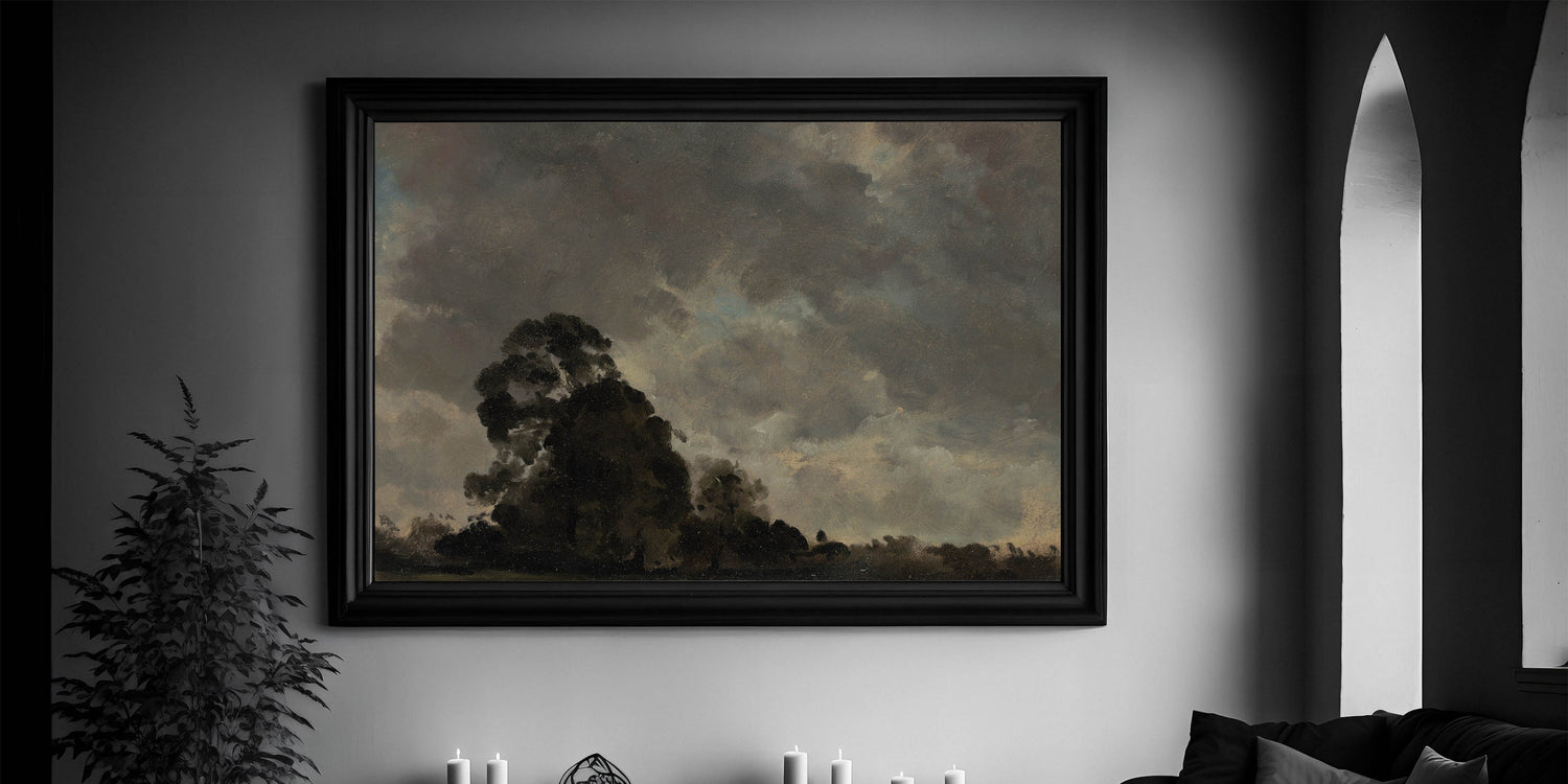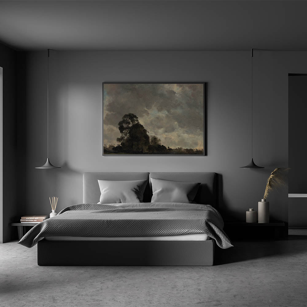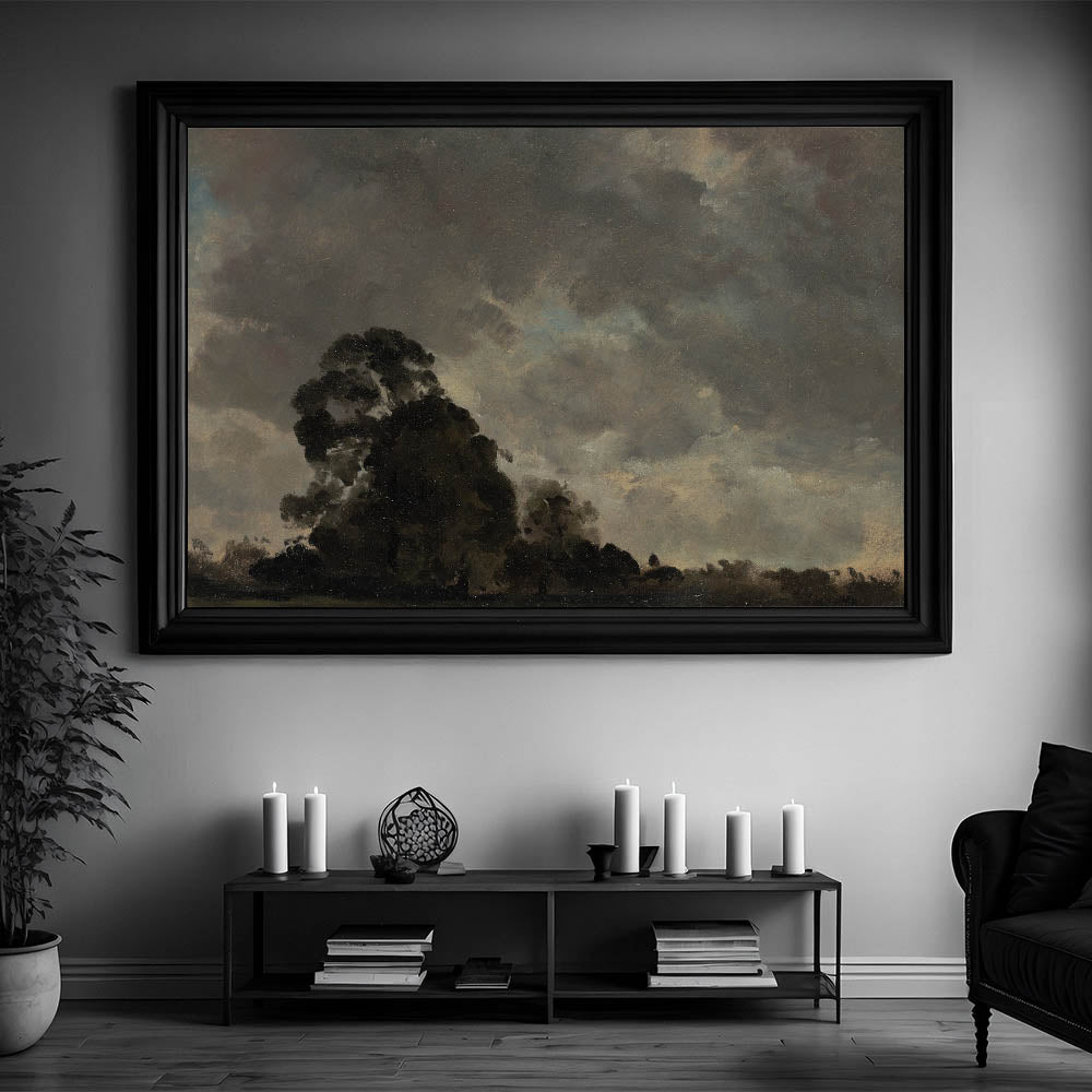 Immerse your space in the moody elegance of this Dark Moody wall art, featuring a dramatic cloudy sky over a silhouette of dense trees. The subtle play of light and shadow against the moody clouds creates a sense of depth and mystery, making it an ideal addition for those who appreciate the beauty of atmospheric art. Perfect for living rooms, studies, or bedrooms, this piece brings a touch of nature’s raw power and serenity into any interior setting.
