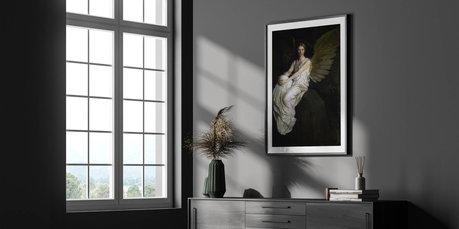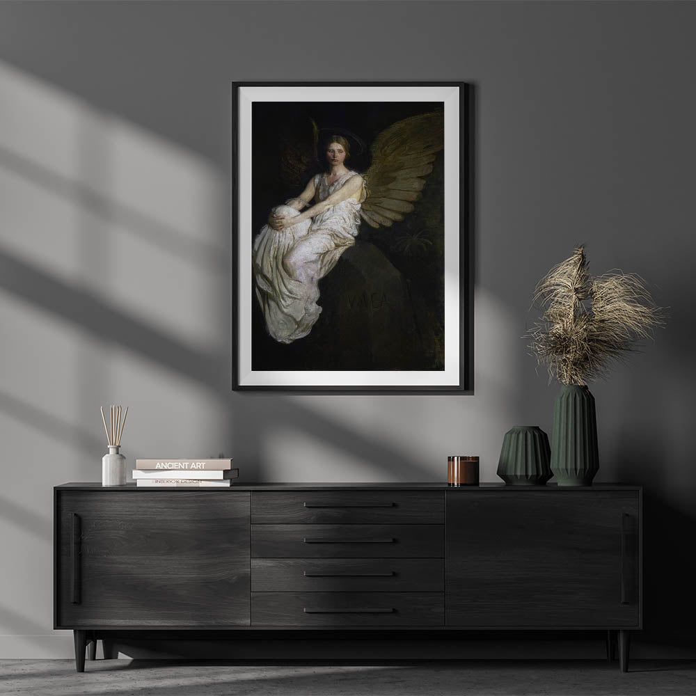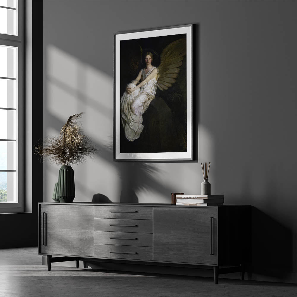 This moody angel artwork brings a timeless and peaceful presence to your space, making it a perfect addition for those who appreciate both beauty and contemplation in their decor.
