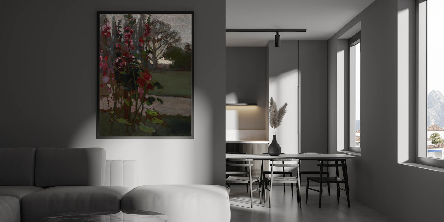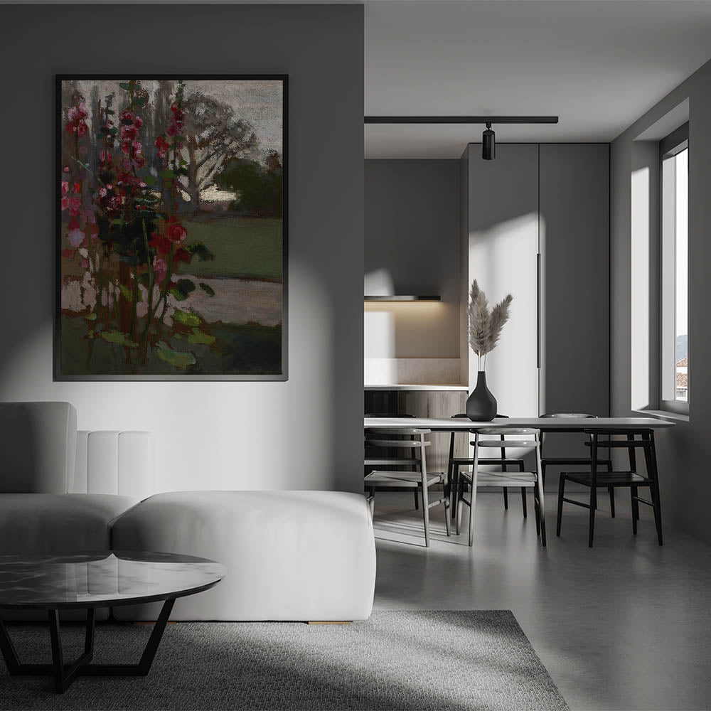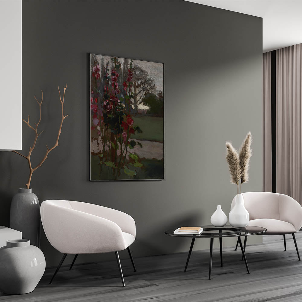 Transform your space with this stunning Dark Moody Wall Art, featuring an impressionistic portrayal of red flowers set against a moody landscape. The rich hues of the flowers, contrasted with dark green leaves and a muted background, create an atmospheric effect that evokes the beauty of nature in a timeless, elegant manner. This artwork is perfect for living rooms, dining spaces, or any area in your home where you want to introduce a touch of sophistication and depth.