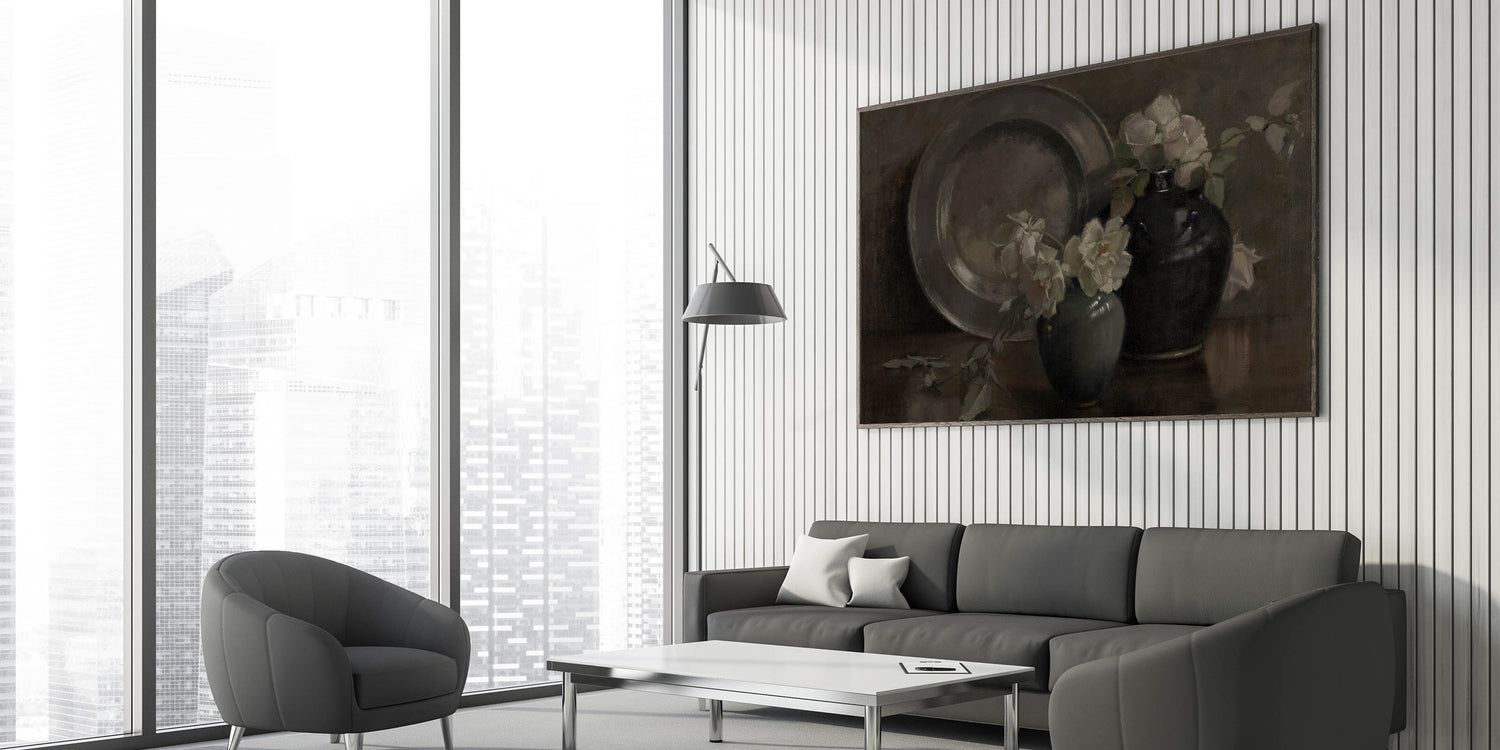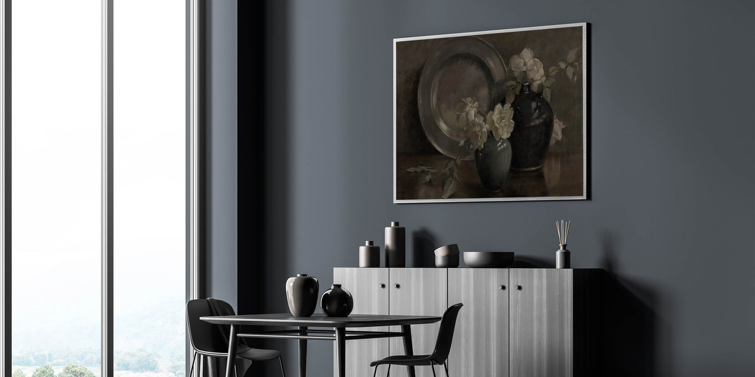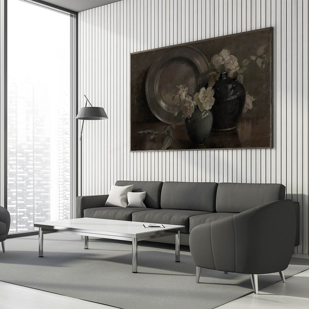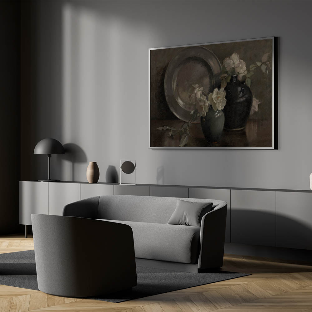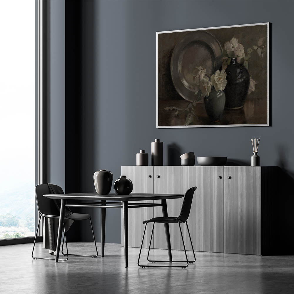 Introduce a touch of timeless elegance to your space with this Dark Moody Still Life Floral Art. This classic composition features delicate flowers arranged in vases, set against a shadowy backdrop with a large reflective plate, creating a scene that is both serene and captivating. The muted tones and soft lighting highlight the textures and forms, adding a sophisticated touch that is perfect for those seeking to enrich their interiors with moody and classic art pieces.