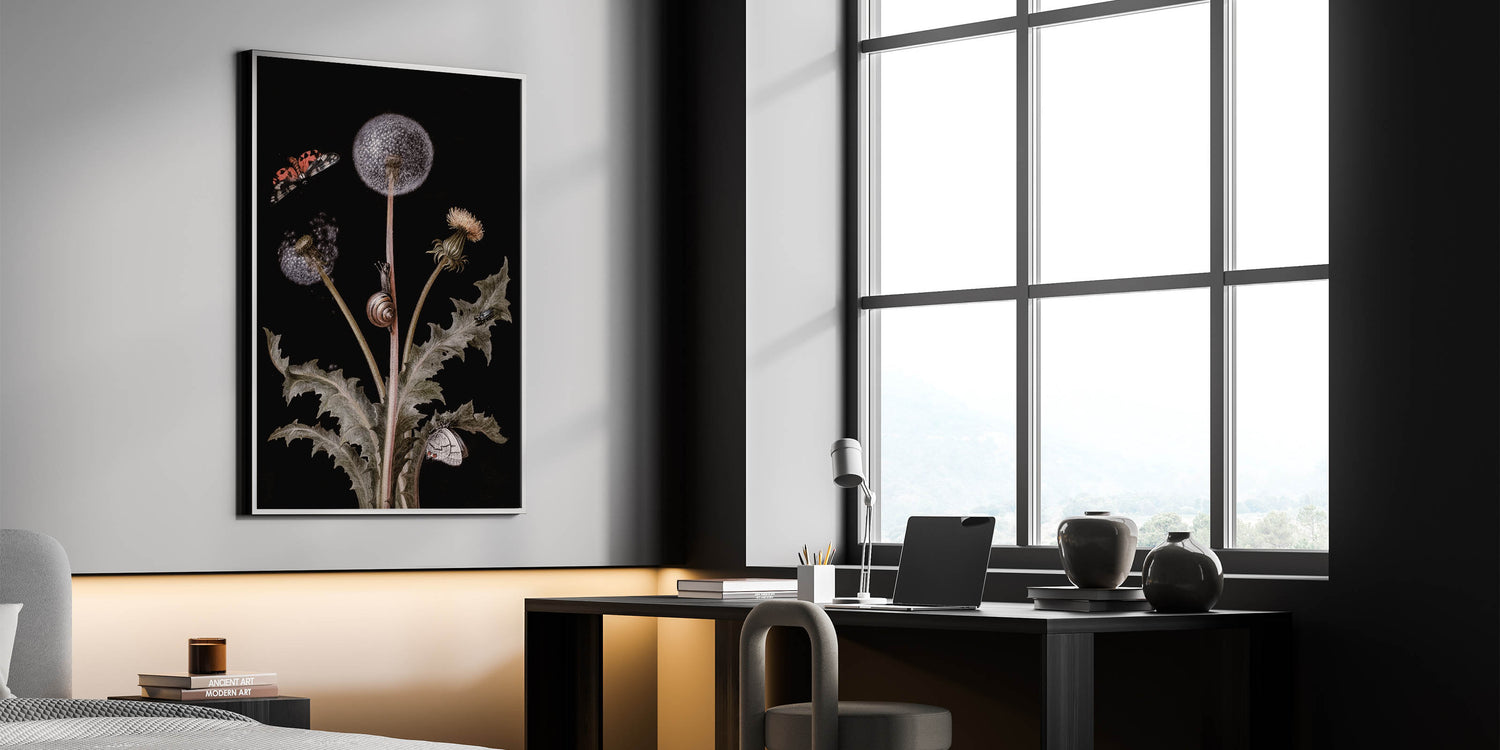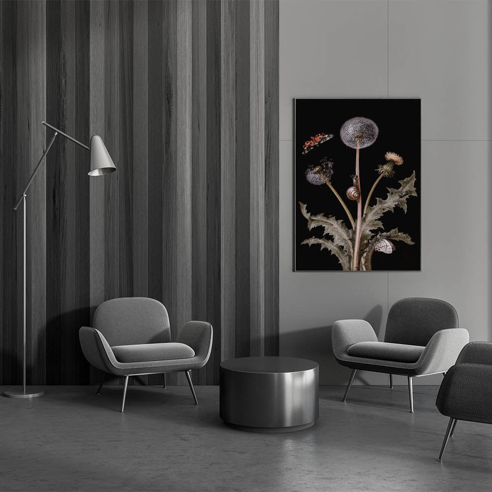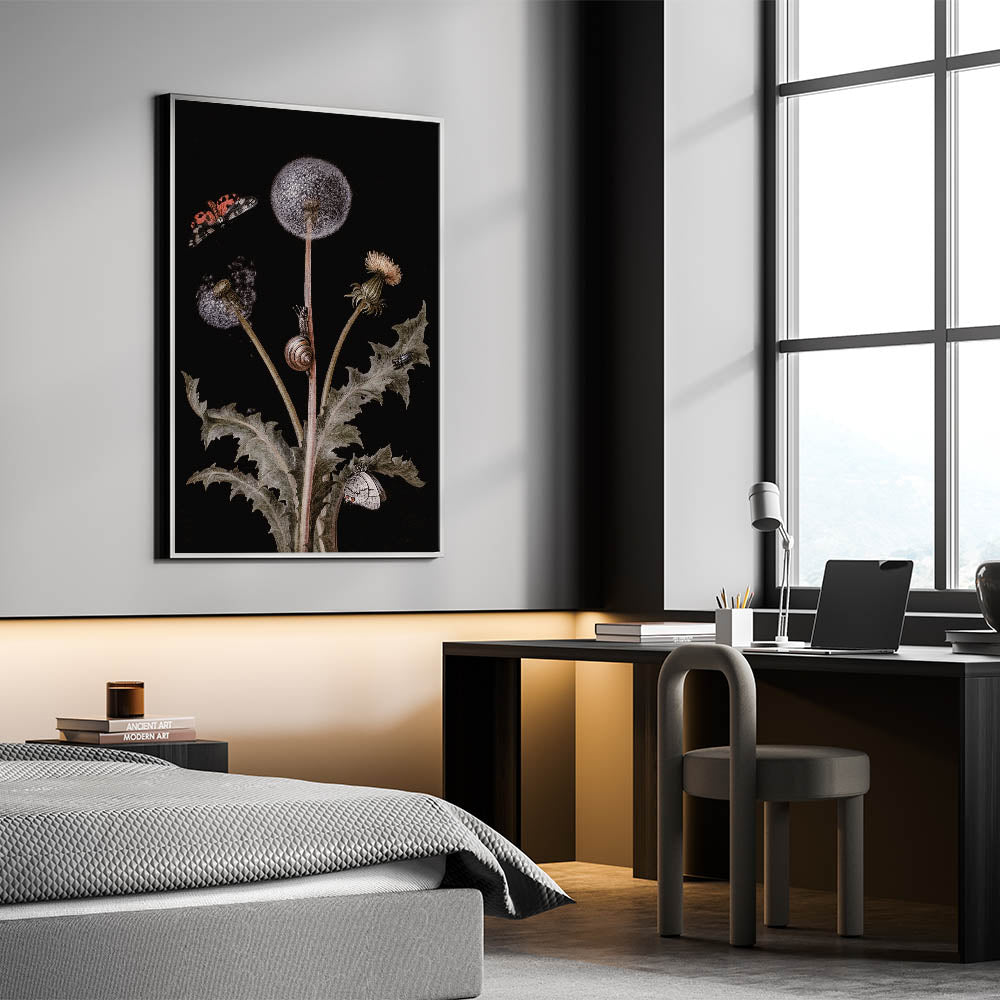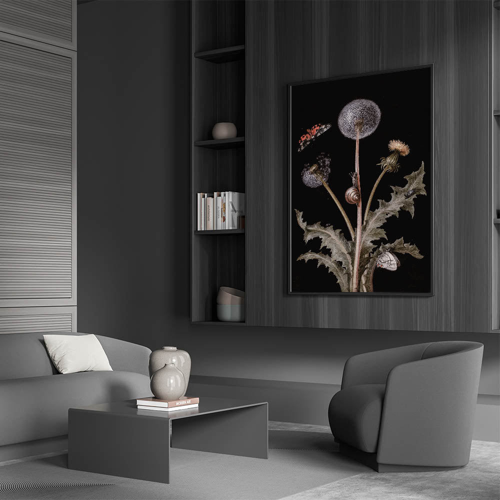 Add a touch of elegance and mystery to your interior with this Dark Moody Wall Art, featuring an intricate botanical scene adorned with butterflies, snails, and dandelions. The contrast of light elements against a dark background highlights the delicate details, creating a captivating piece that embodies the essence of moody art prints. This artwork is perfect for nature lovers who appreciate dark art decor with a touch of elegance and refinement.