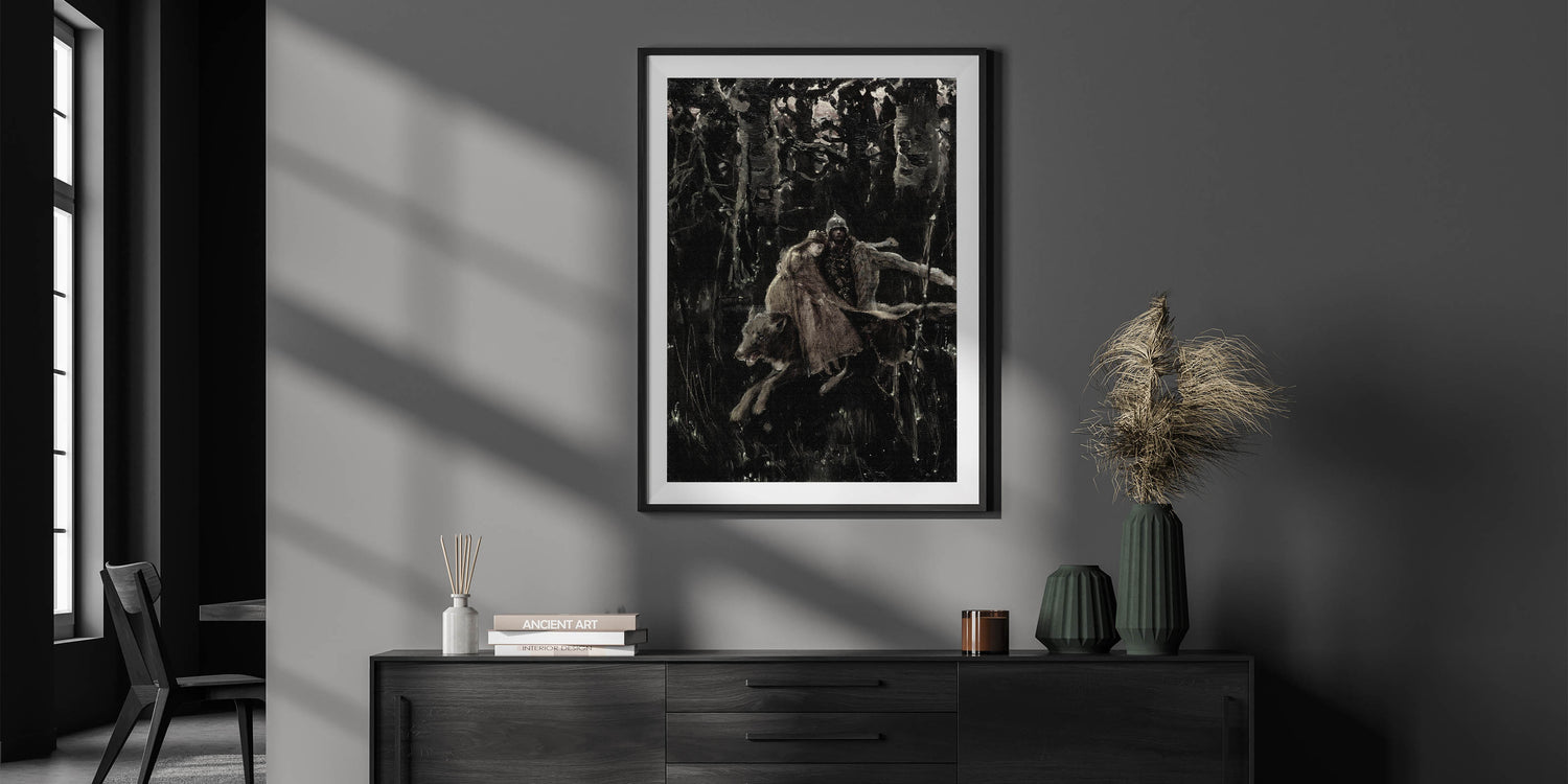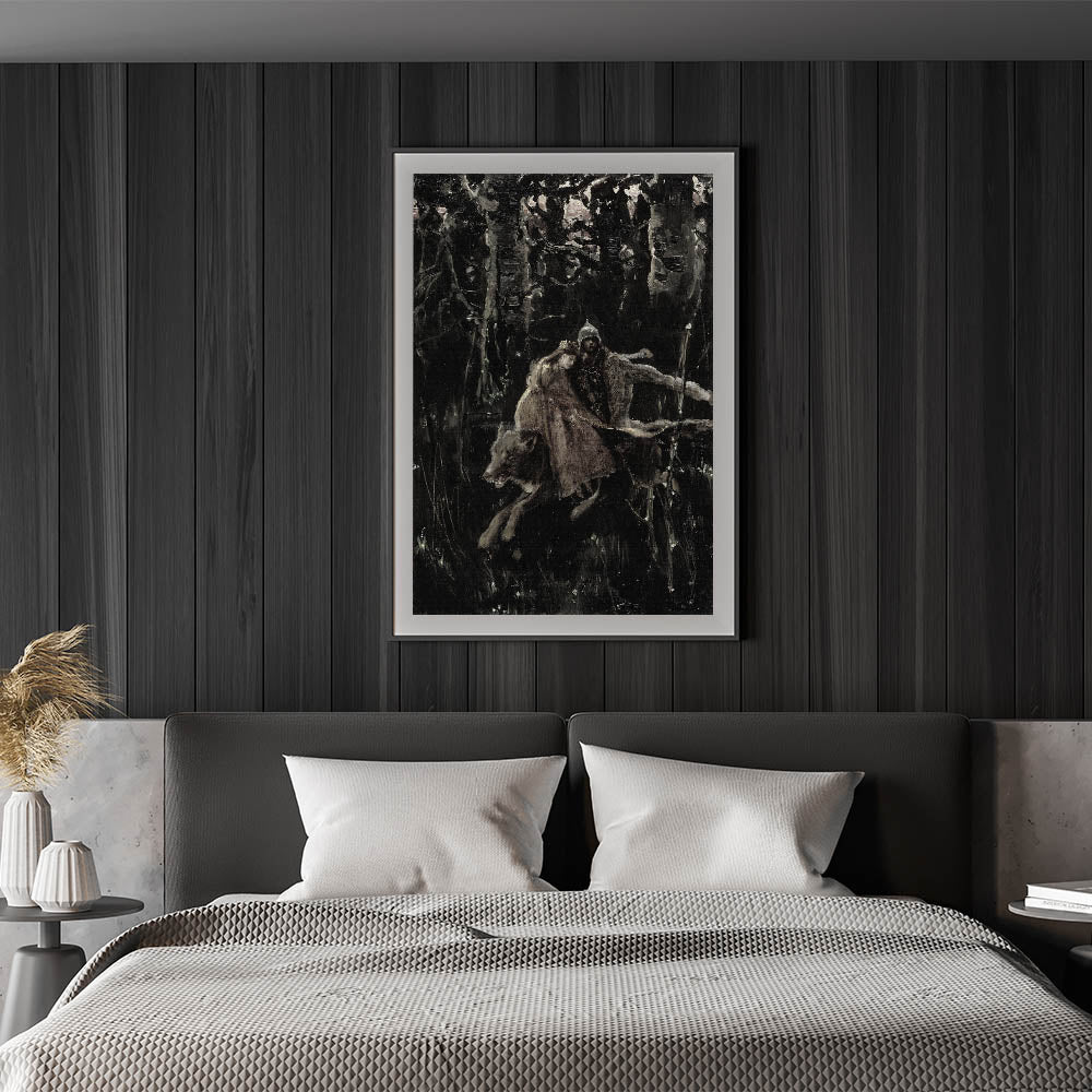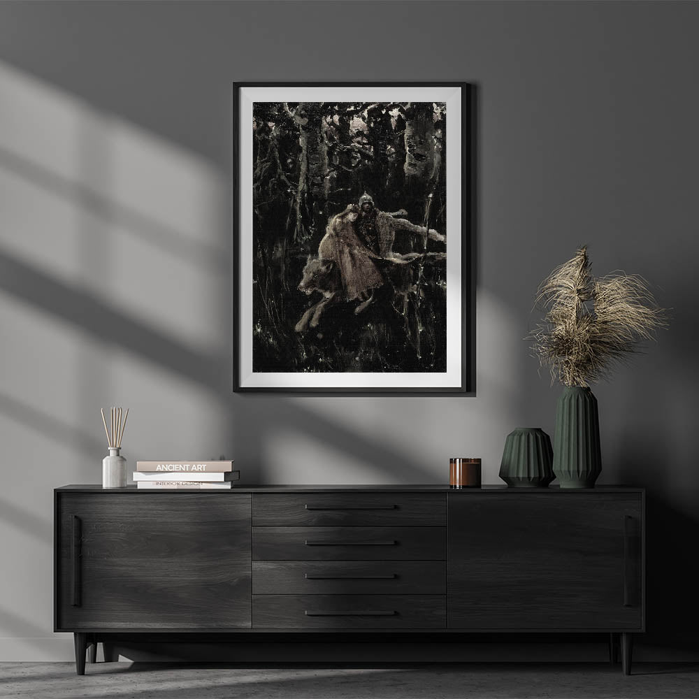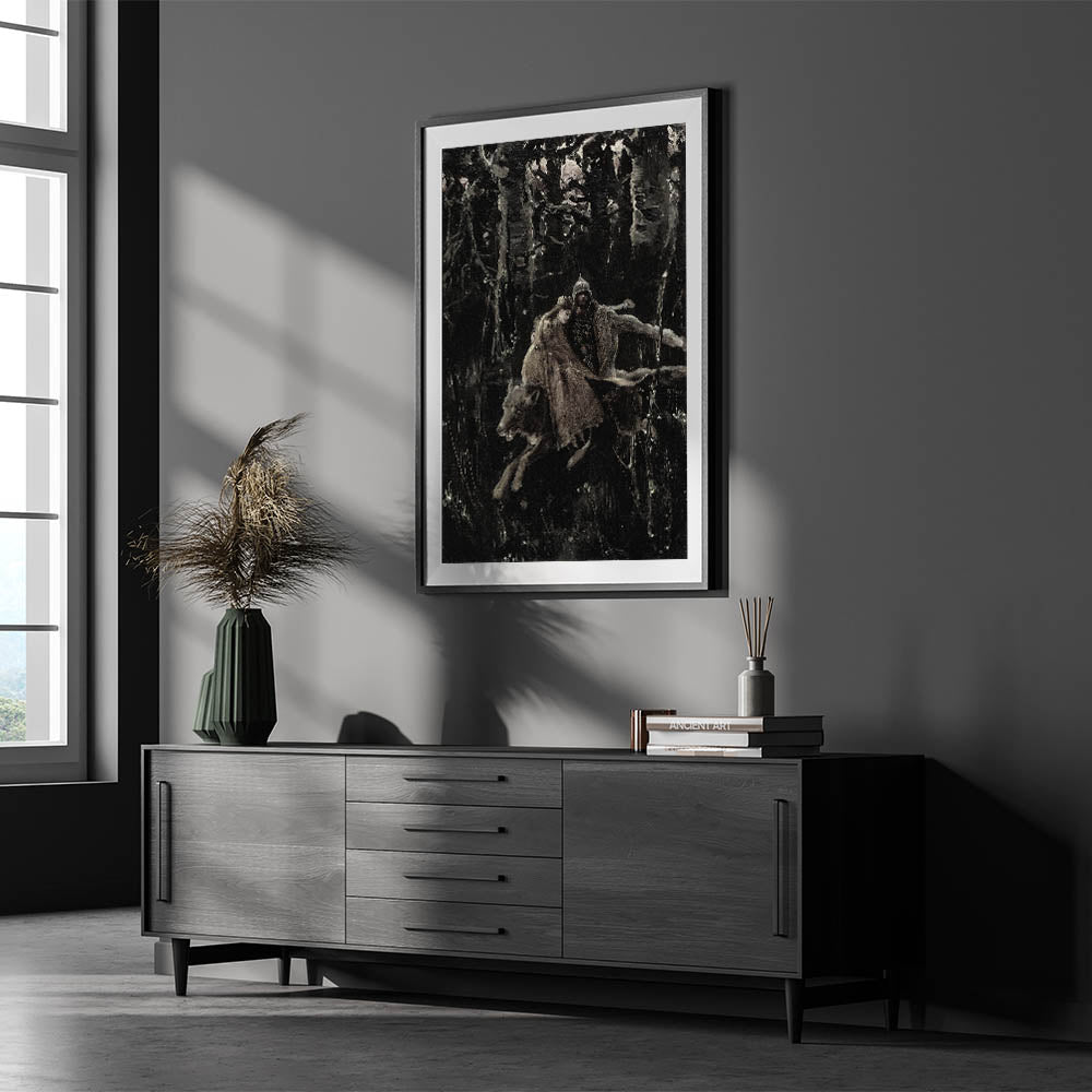 Immerse yourself in the mystery and drama of this Dark Moody Wall Art featuring a knight and a woman riding through a shadowy forest. The dark, muted tones, combined with intricate detailing of the characters and the forest, create a scene filled with tension and intrigue. The figures appear to be in motion, adding a dynamic element to the artwork that draws the viewer in. This piece is perfect for those looking to add a story-driven, atmospheric touch to their home decor.