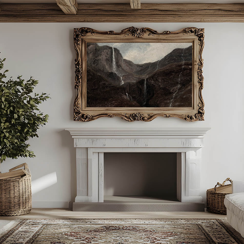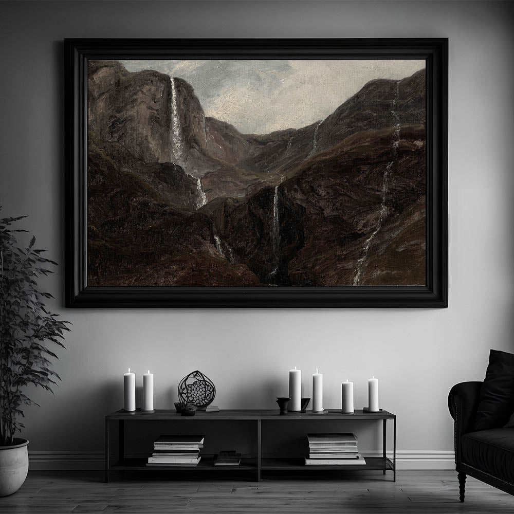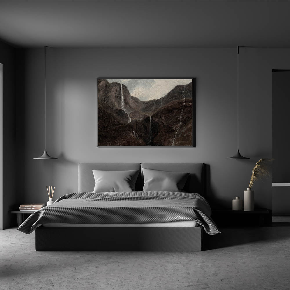 Transform your space with this Dark Moody Wall Art, depicting a dramatic mountain landscape adorned with cascading waterfalls. The artwork captures the moody essence of nature, using deep, earthy tones that create an atmospheric effect perfect for enhancing your home decor. This piece, with its rugged terrain and flowing waters, is ideal for those who appreciate the beauty of untamed nature in dark, evocative tones.