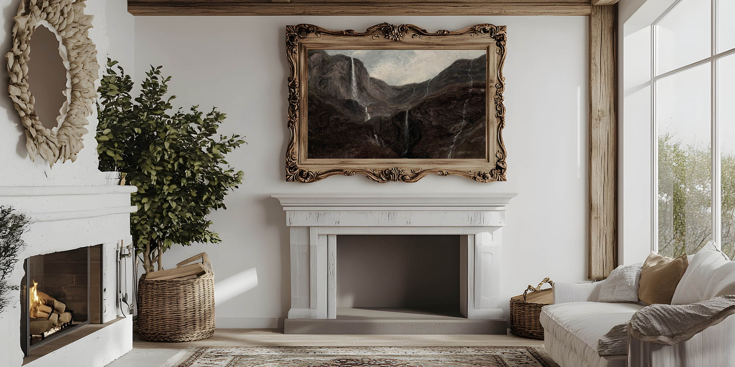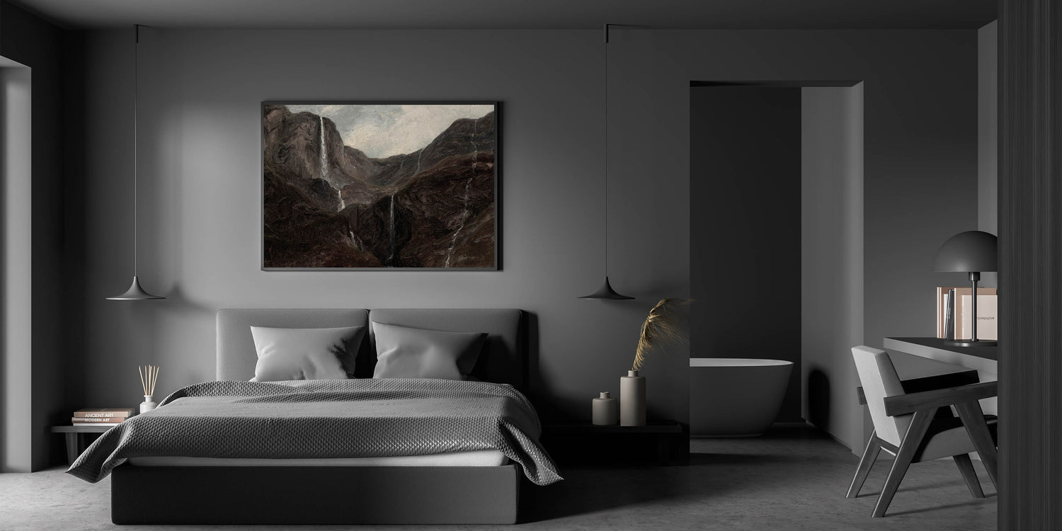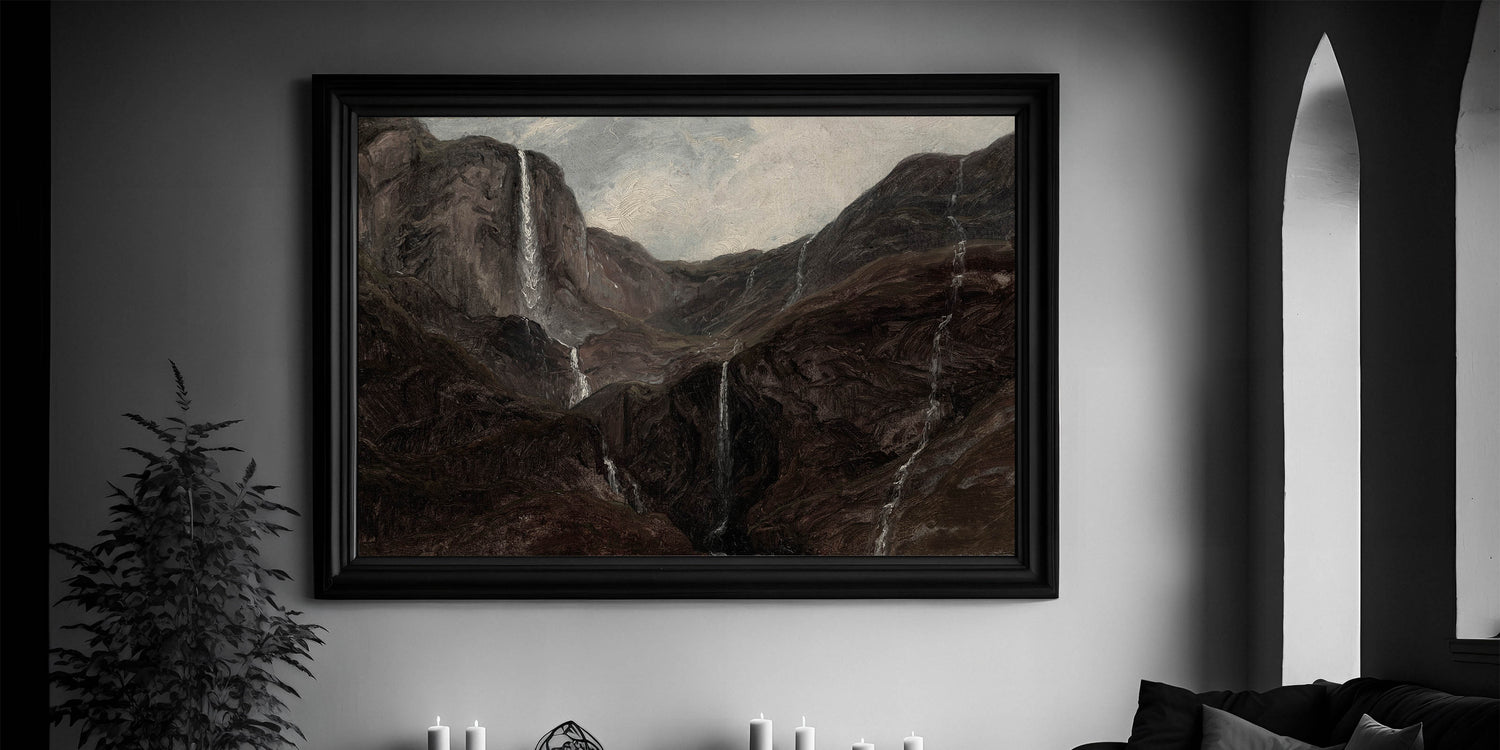 Transform your space with this Dark Moody Wall Art, depicting a dramatic mountain landscape adorned with cascading waterfalls. The artwork captures the moody essence of nature, using deep, earthy tones that create an atmospheric effect perfect for enhancing your home decor. This piece, with its rugged terrain and flowing waters, is ideal for those who appreciate the beauty of untamed nature in dark, evocative tones.