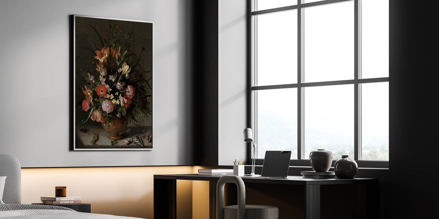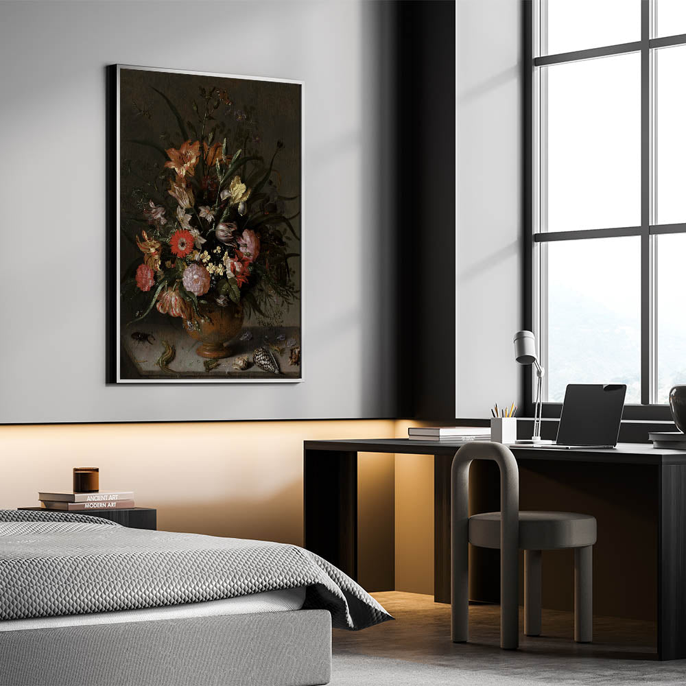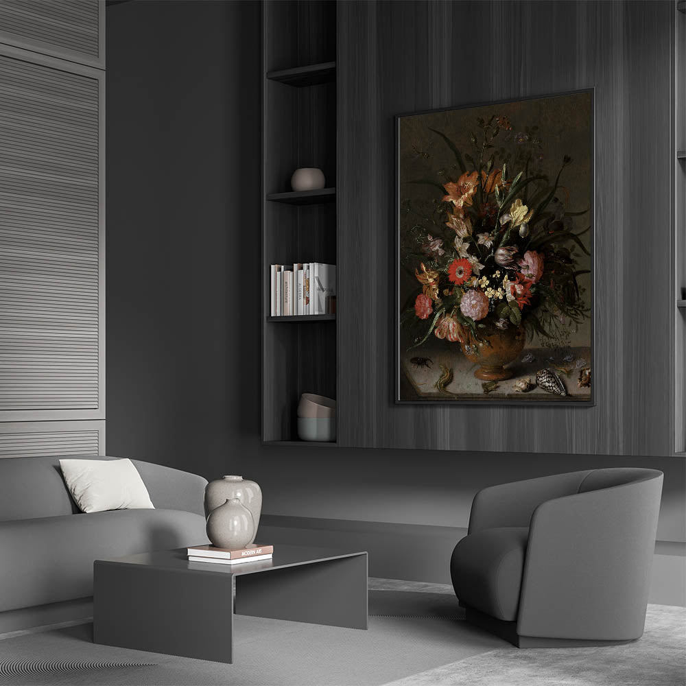 Bring timeless elegance and a touch of nature’s opulence to your space with this Dark Moody Wall Art piece. Featuring a richly detailed floral arrangement in a classical vase, this artwork showcases vibrant flowers set against a dark background. The play of light and shadow emphasizes the depth of the composition, making it an exquisite choice for those who appreciate moody art prints that blend beauty with drama.