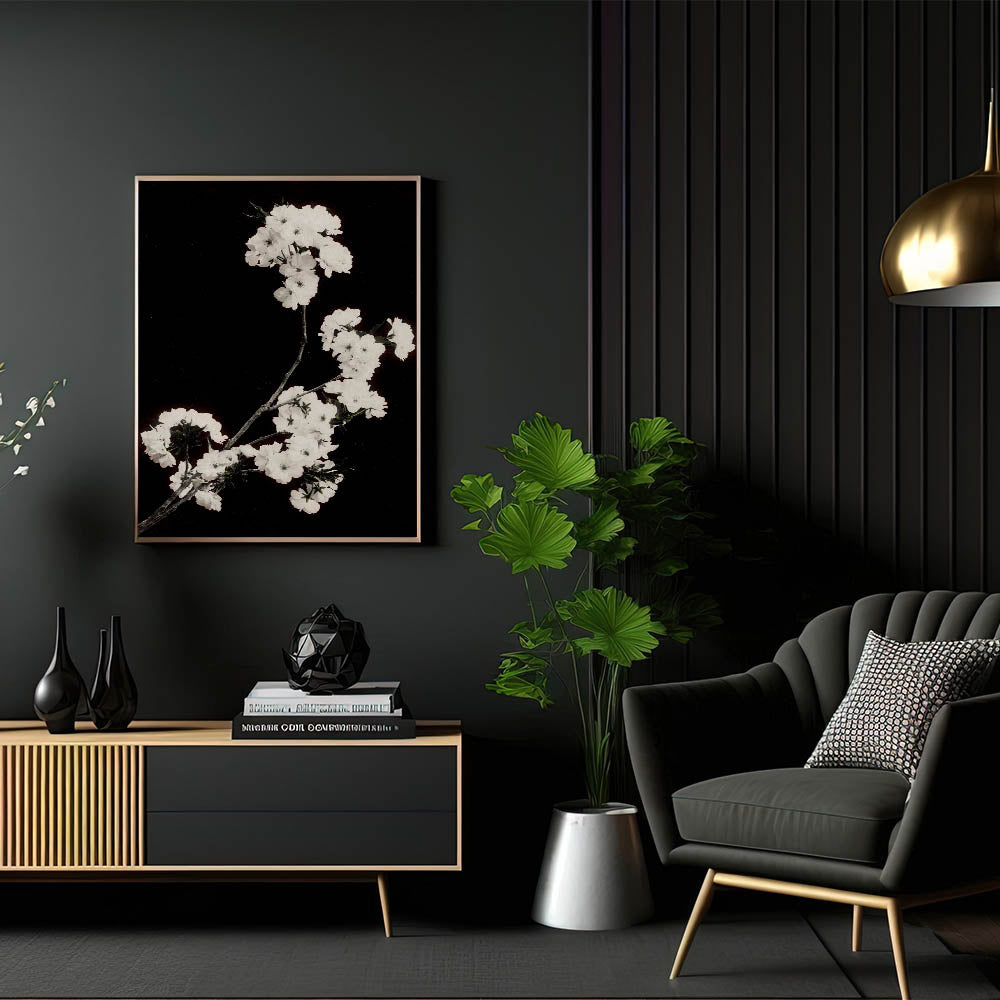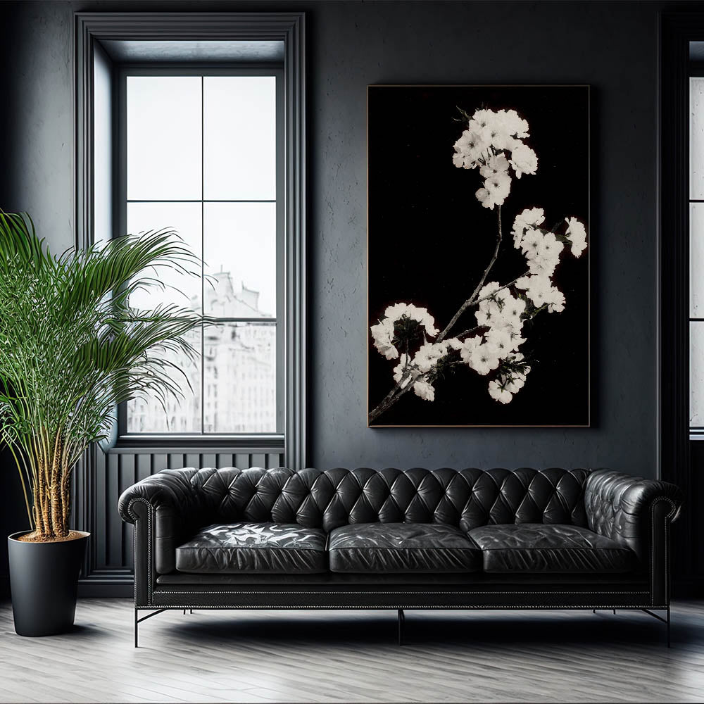 Elevate your space with this Dark Moody Wall Art piece, featuring a striking display of delicate white blossoms set against a deep black background. This elegant floral arrangement captures the essence of simplicity and beauty, making it perfect for those who appreciate moody art prints with a minimalist and timeless appeal. The contrast between the bright petals and the dark background creates a captivating and sophisticated aesthetic, ideal for adding a refined touch to any interior.