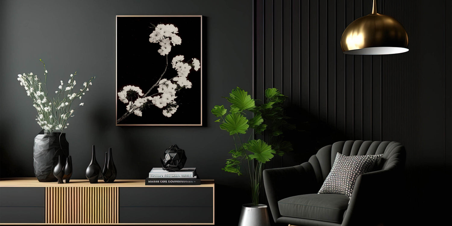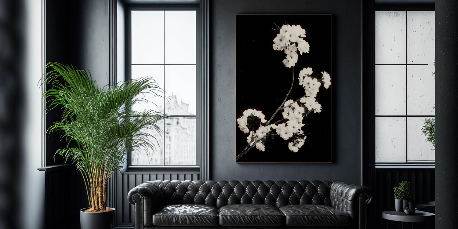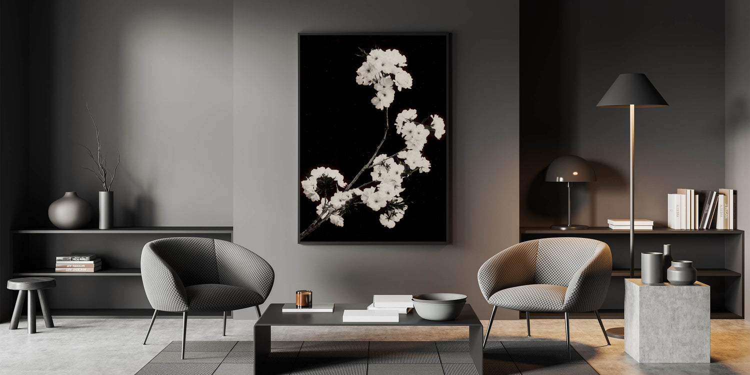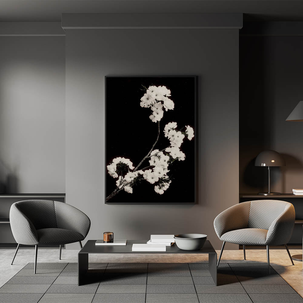 Dark Moody Wall Art - Elegant White Blossoms on Black Background