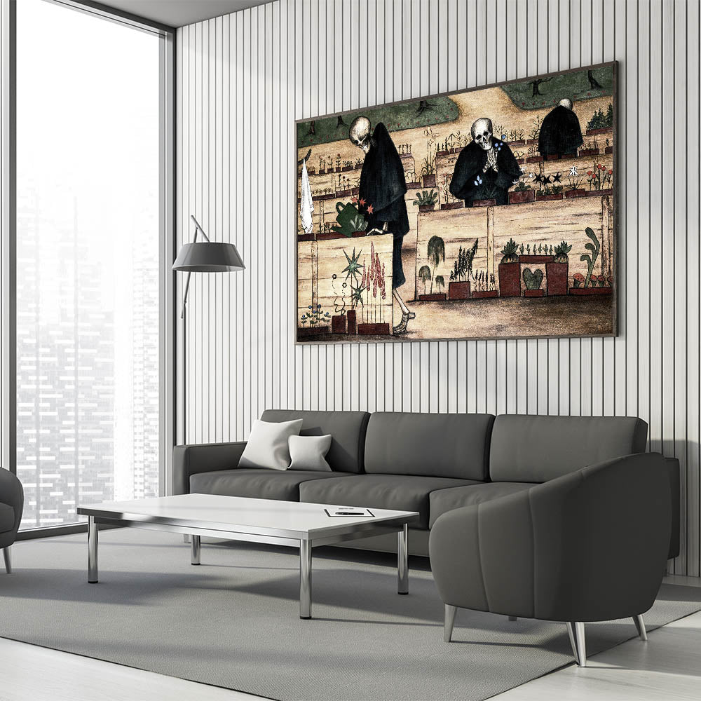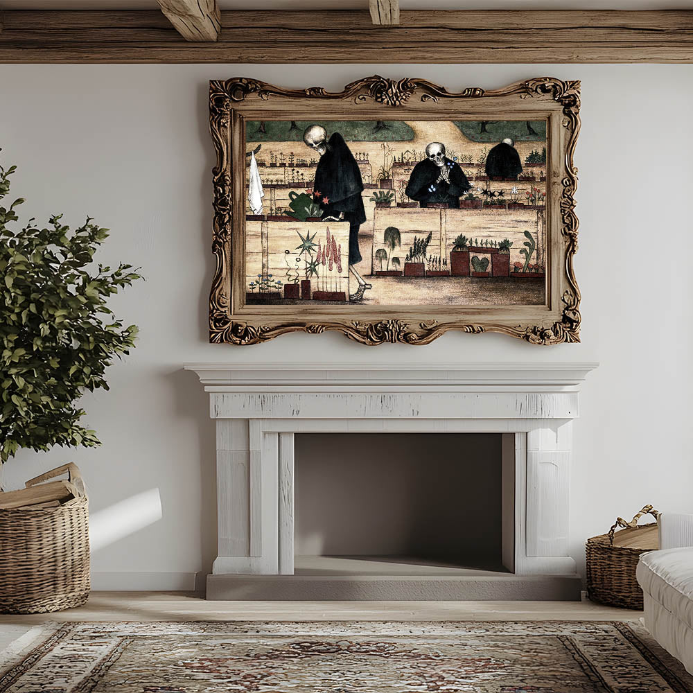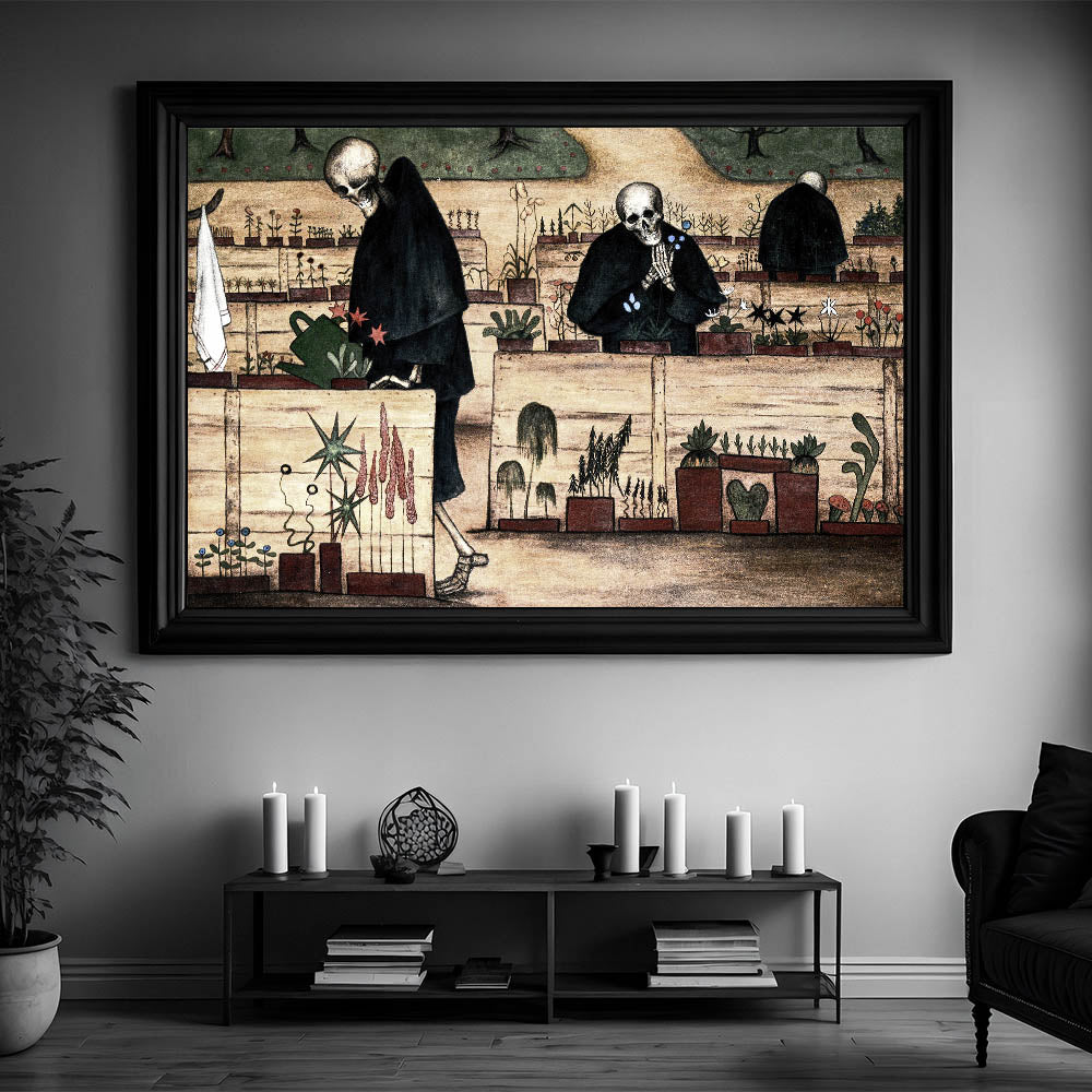 Step into the surreal with this Dark Moody Wall Art titled "Garden of Skulls." This intriguing piece depicts a skeletal gardener tending to plants in a mystical garden, merging the macabre with nature's beauty. The muted tones and careful detailing of the skeleton figures add a touch of eerie elegance, making it an ideal addition for those who appreciate dramatic art prints that evoke a sense of mystery. The artwork’s unique style, blending dark themes with botanical elements, brings an avant-garde aesthetic perfect for moody interiors.