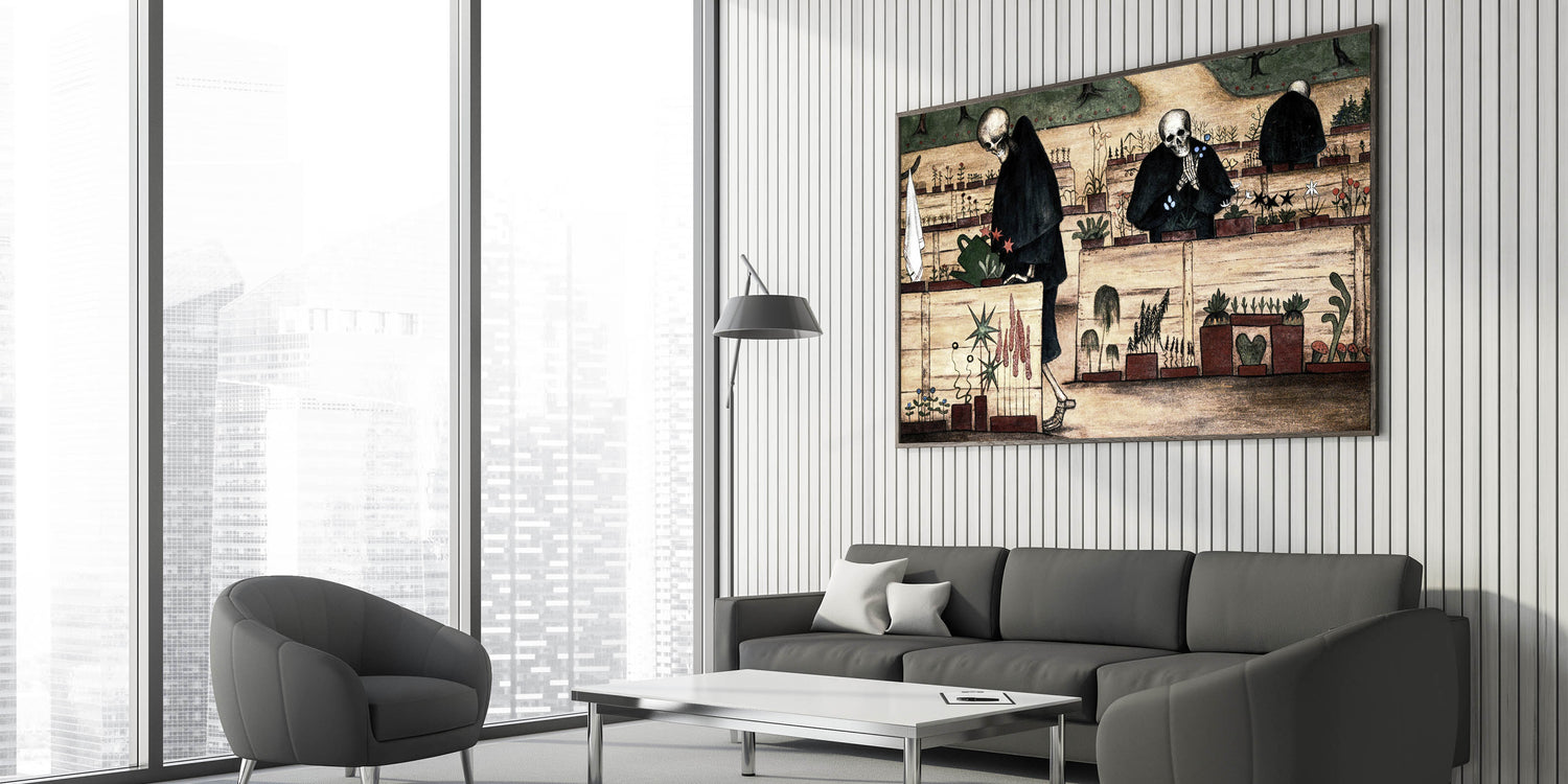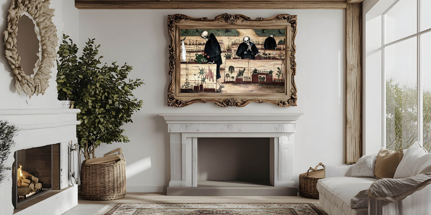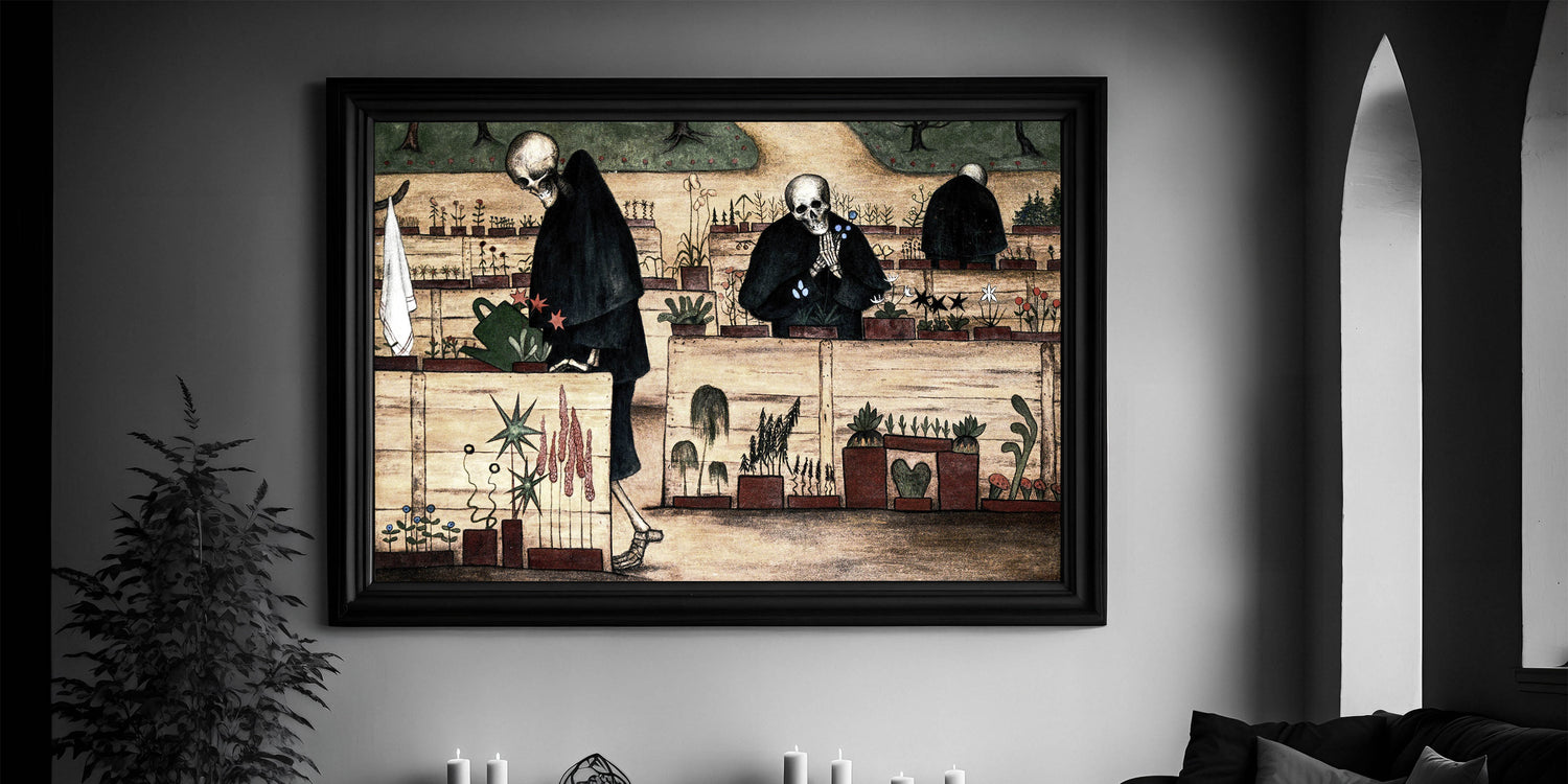 Step into the surreal with this Dark Moody Wall Art titled "Garden of Skulls." This intriguing piece depicts a skeletal gardener tending to plants in a mystical garden, merging the macabre with nature's beauty. The muted tones and careful detailing of the skeleton figures add a touch of eerie elegance, making it an ideal addition for those who appreciate dramatic art prints that evoke a sense of mystery. The artwork’s unique style, blending dark themes with botanical elements, brings an avant-garde aesthetic perfect for moody interiors.