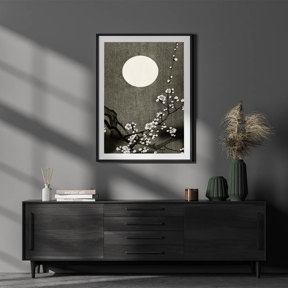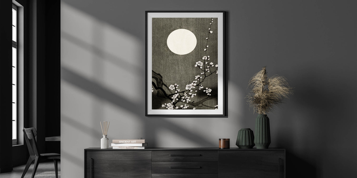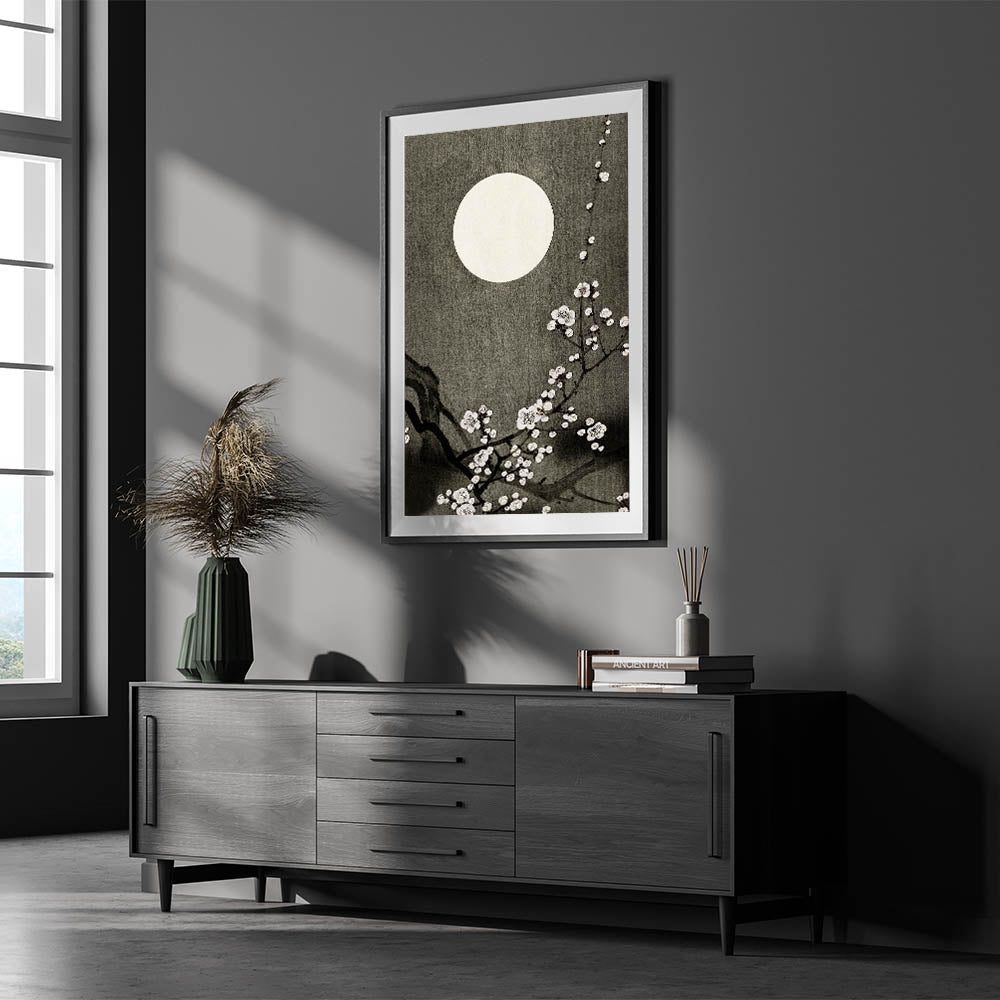 Bring a sense of tranquility and depth to your home with this Dark Moody Wall Art. Featuring a large, glowing moon and delicate floral branches in bloom, this piece is the perfect combination of elegance and atmosphere. The muted gray background enhances the ethereal quality of the artwork, making it a stunning focal point for any room. The contrasting dark tones with soft, natural elements create a dramatic yet peaceful scene that complements a wide range of interior decor styles.