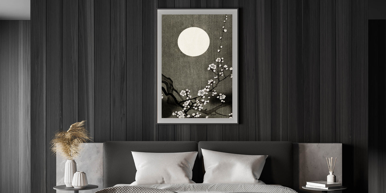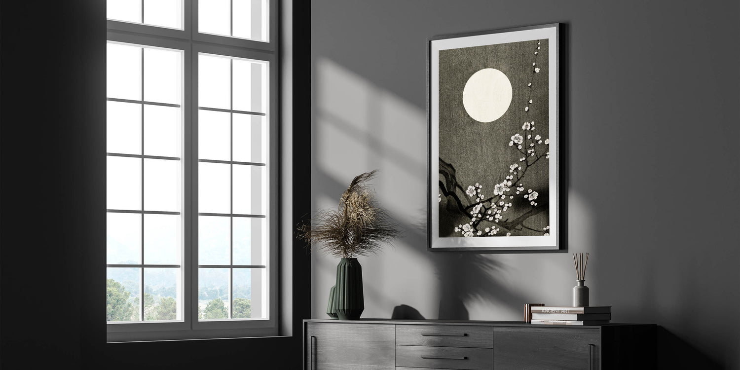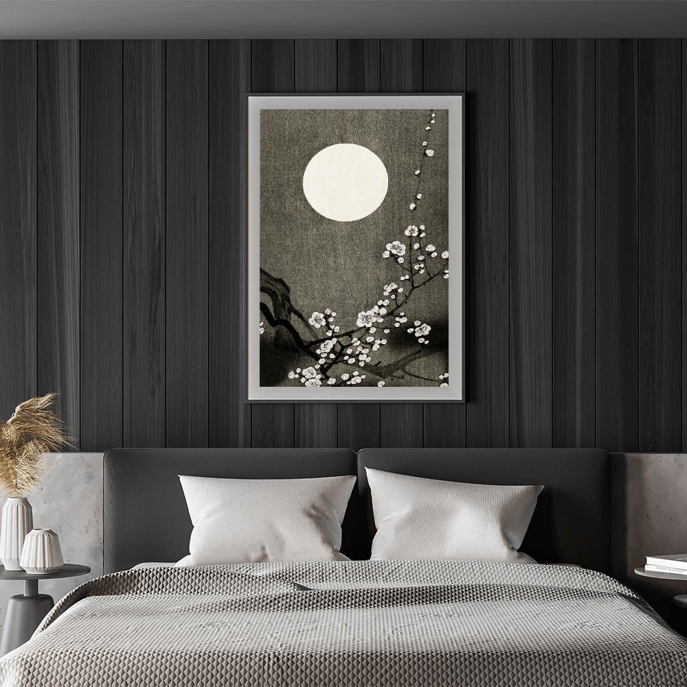 Bring a sense of tranquility and depth to your home with this Dark Moody Wall Art. Featuring a large, glowing moon and delicate floral branches in bloom, this piece is the perfect combination of elegance and atmosphere. The muted gray background enhances the ethereal quality of the artwork, making it a stunning focal point for any room. The contrasting dark tones with soft, natural elements create a dramatic yet peaceful scene that complements a wide range of interior decor styles.