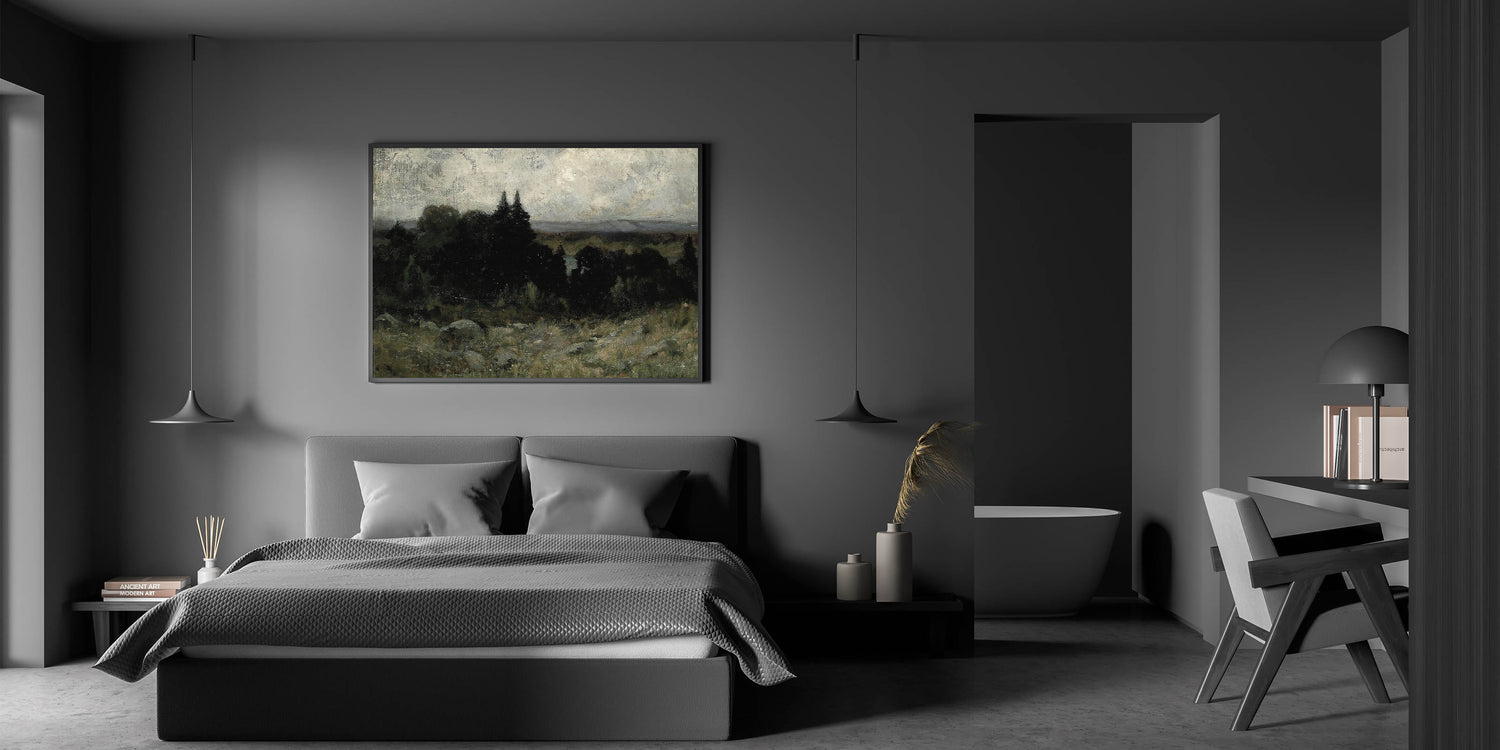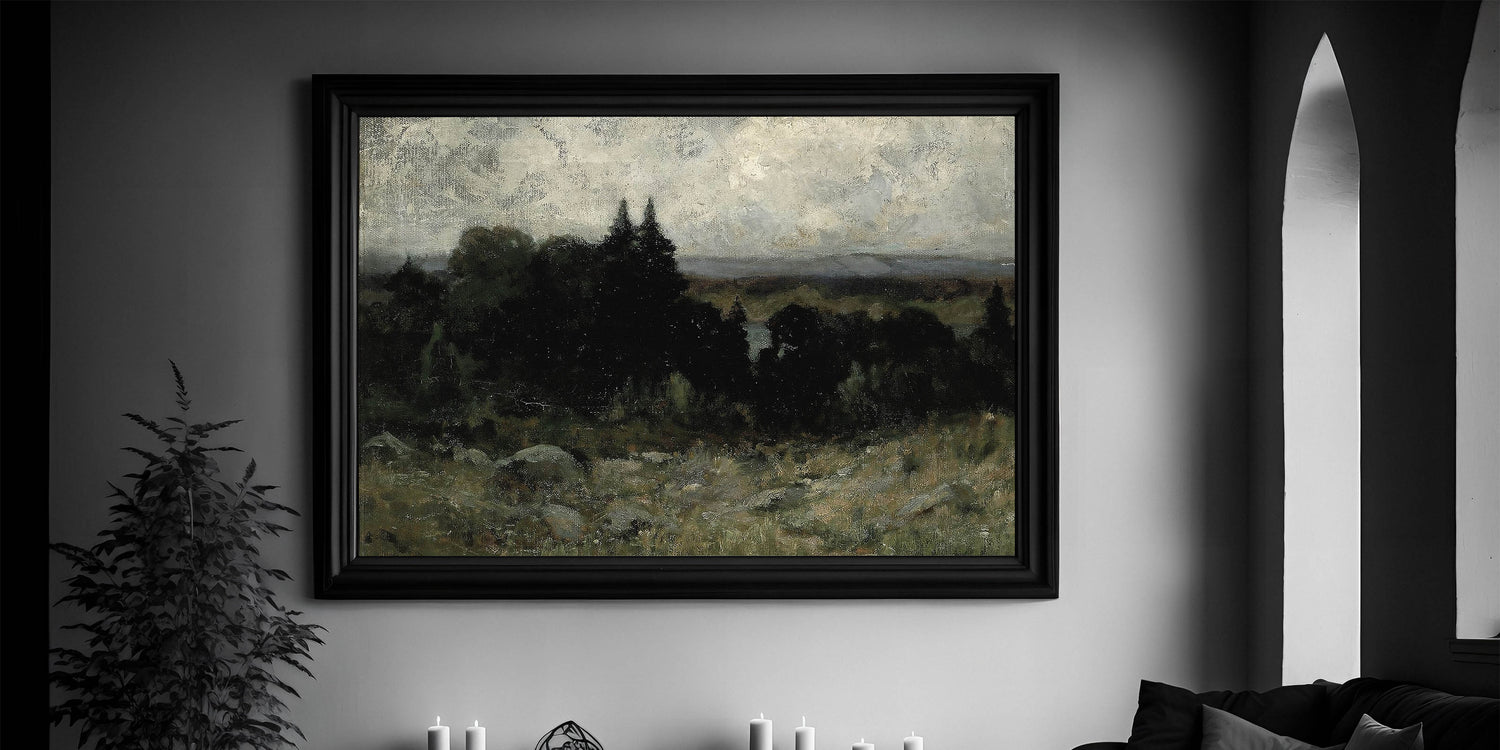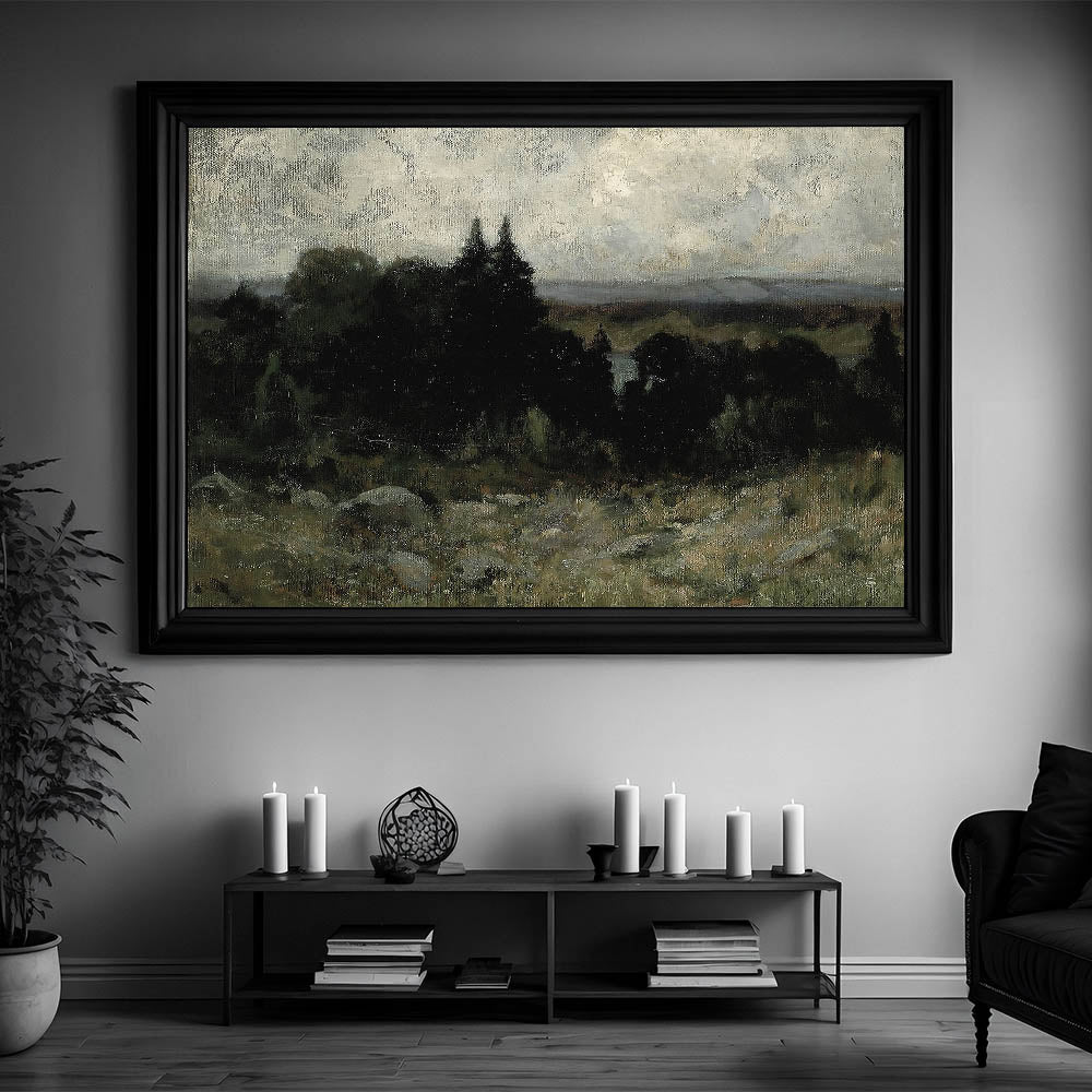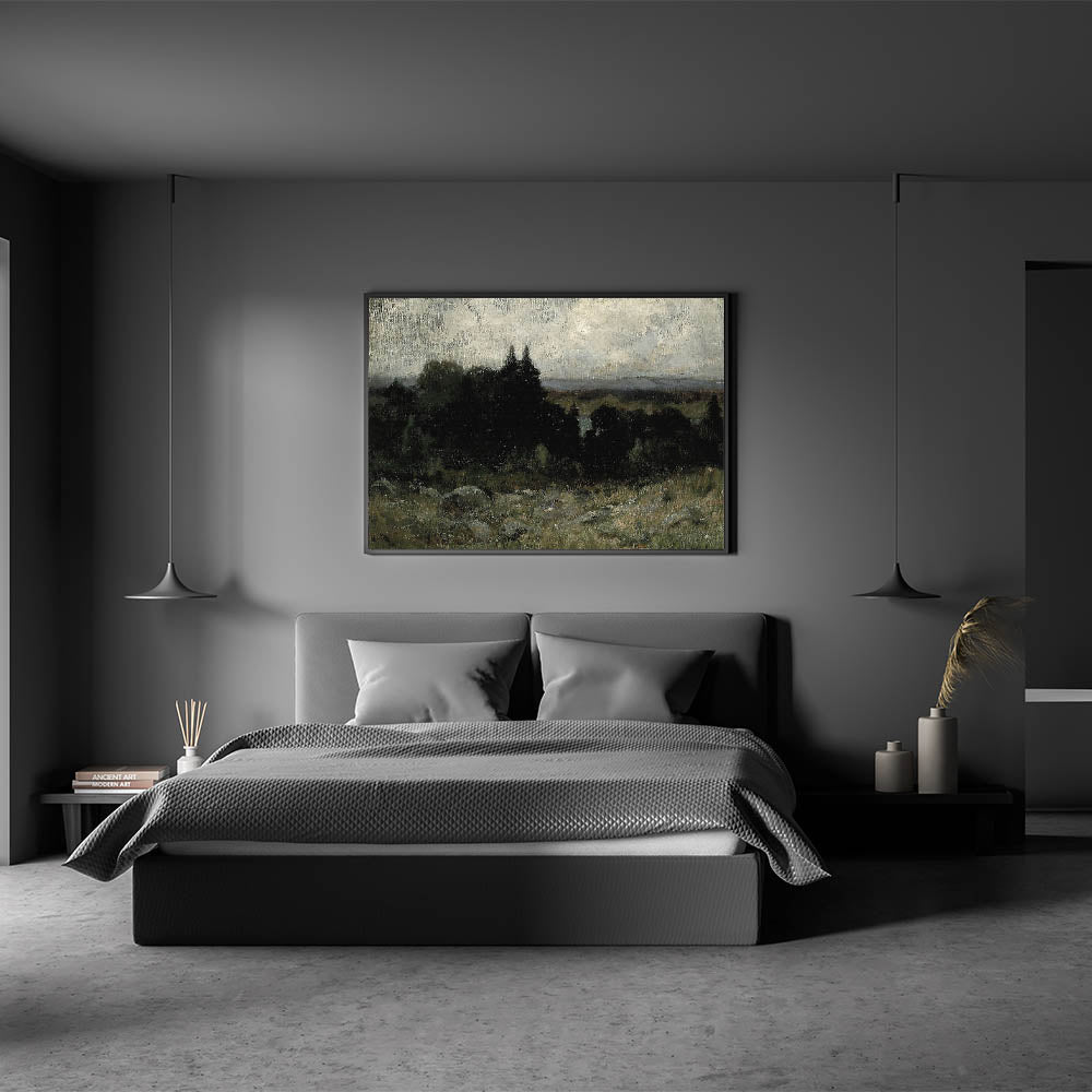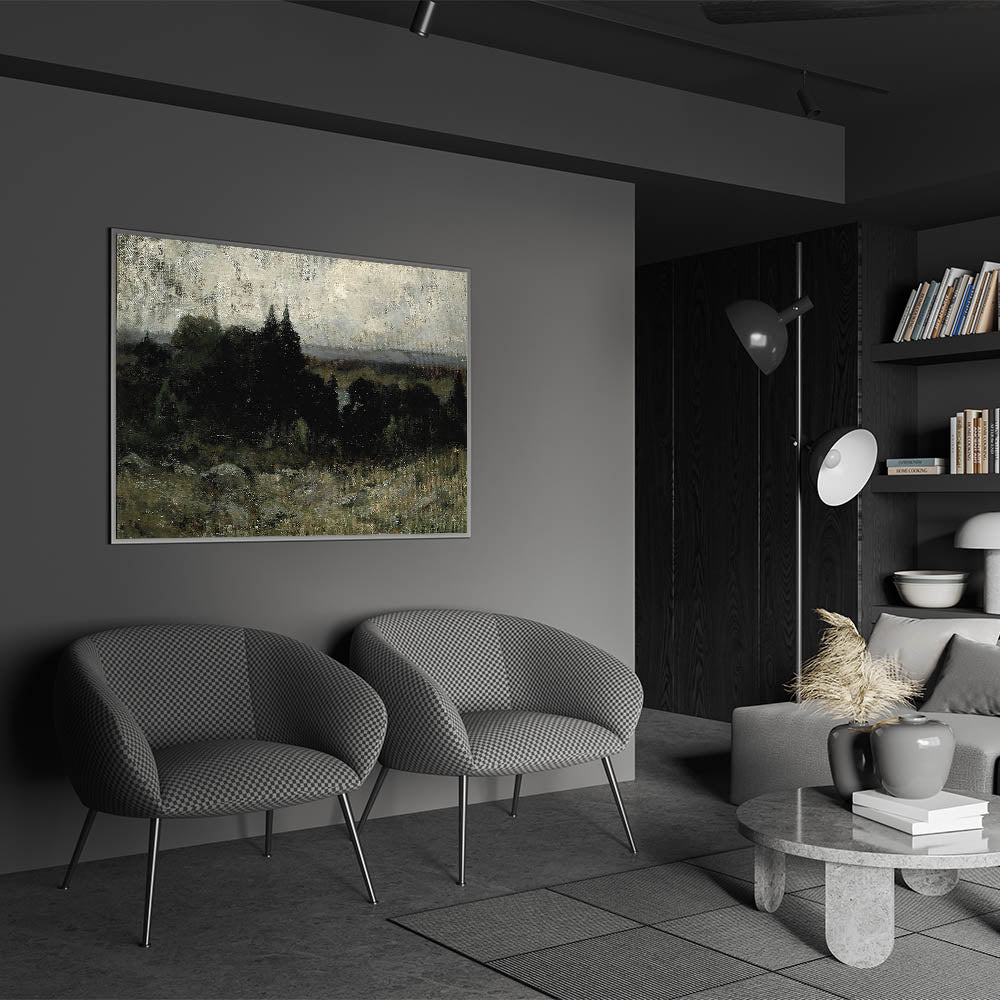 Elevate your space with this Dark Moody Wall Art titled "Misty Forest Landscape." This atmospheric piece captures the essence of a dense forest under a cloudy sky, creating a sense of calm and mystery. The muted palette of greens and grays gives the artwork a timeless, contemplative quality that perfectly complements moody interiors. Ideal for those who appreciate dramatic art prints, this piece will transform any space into a tranquil retreat, evoking the serenity of nature’s untouched beauty.
